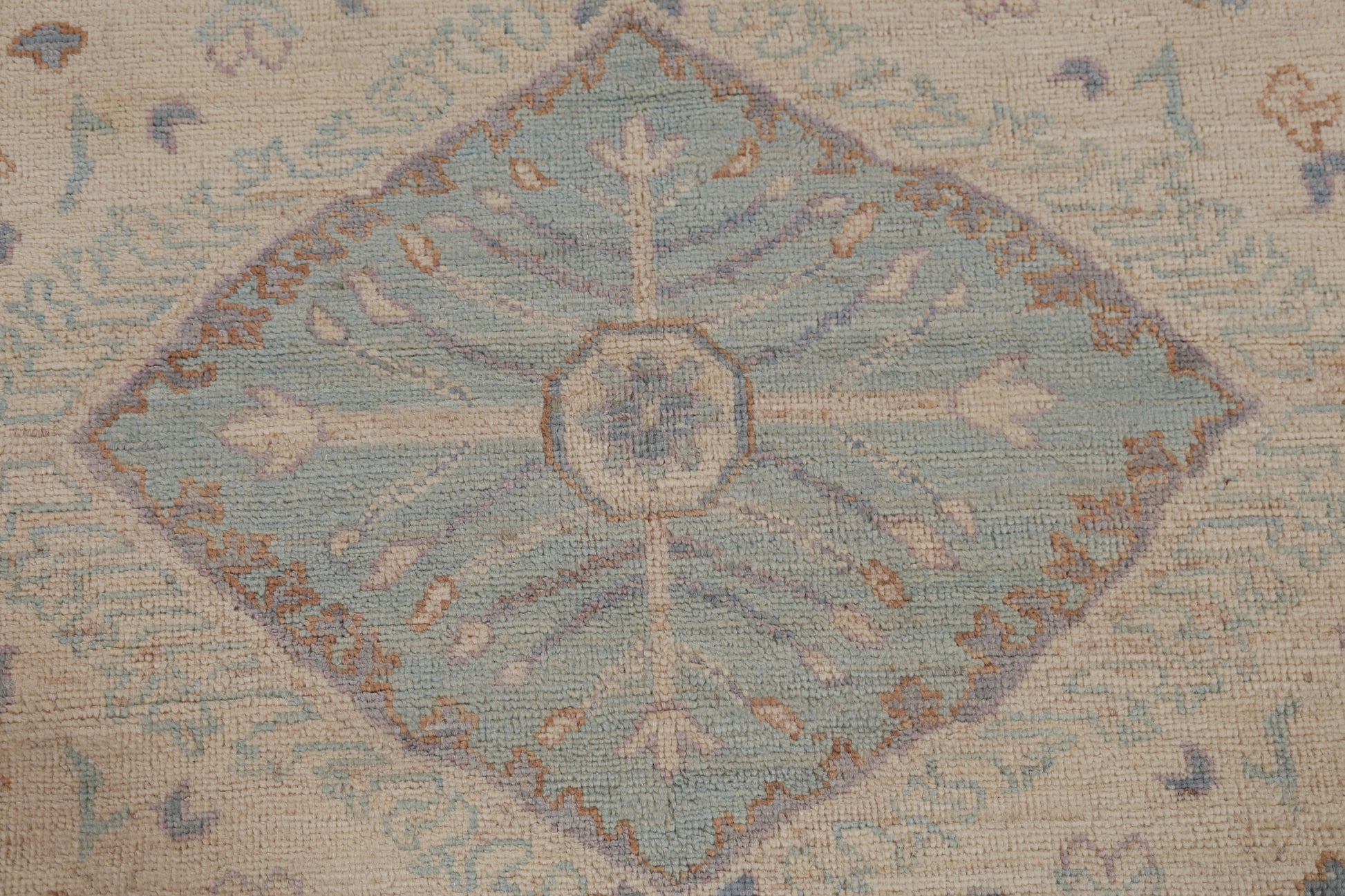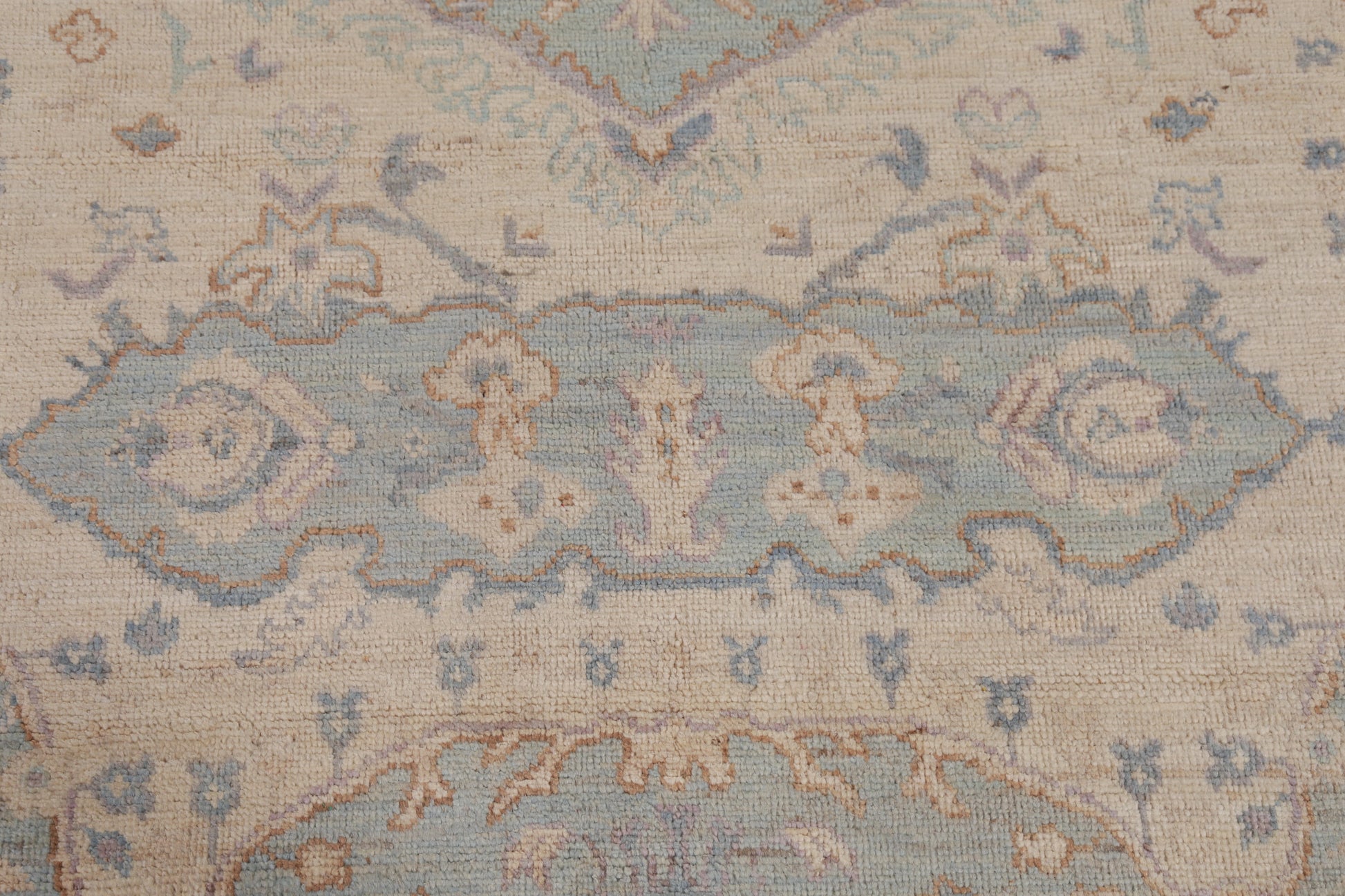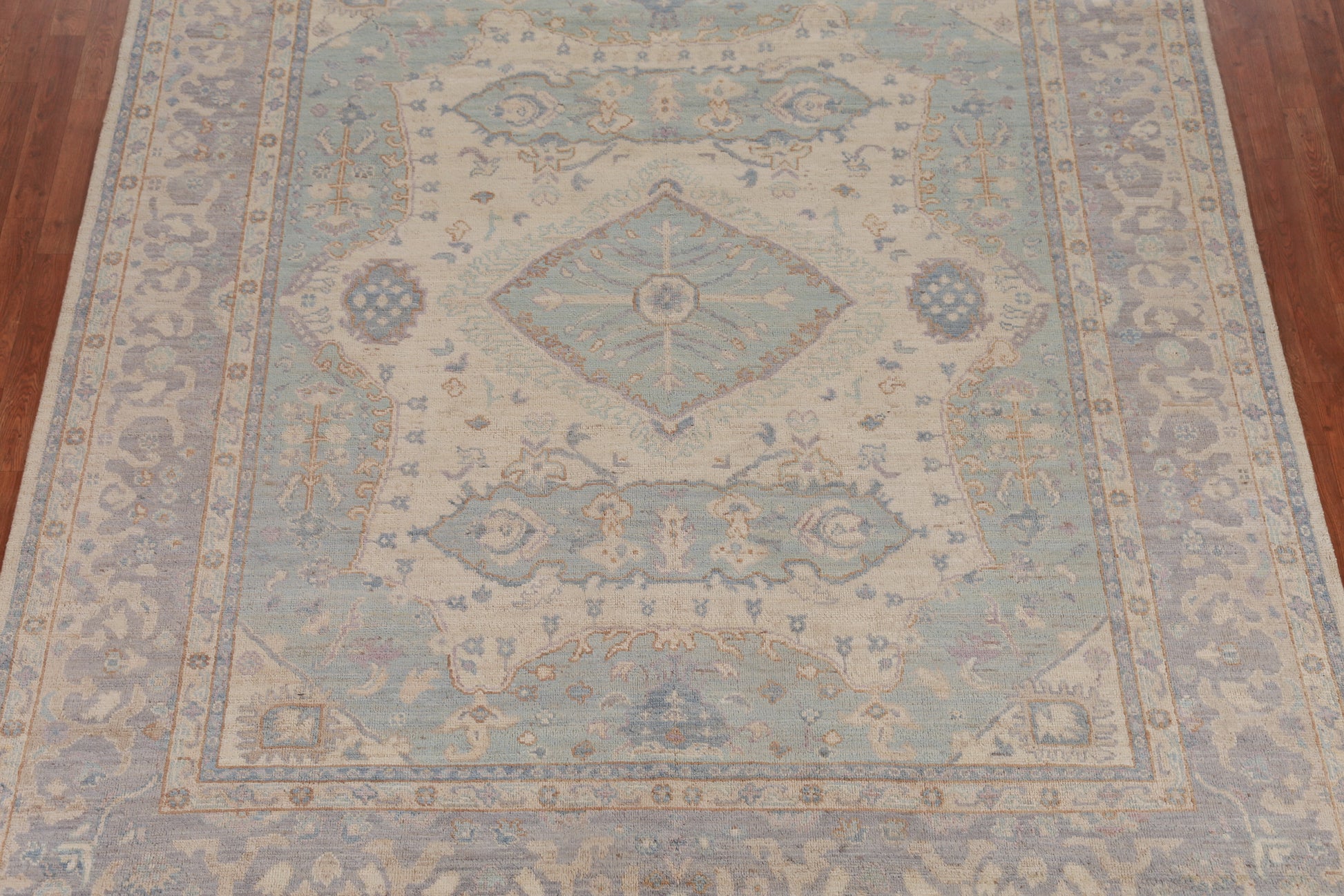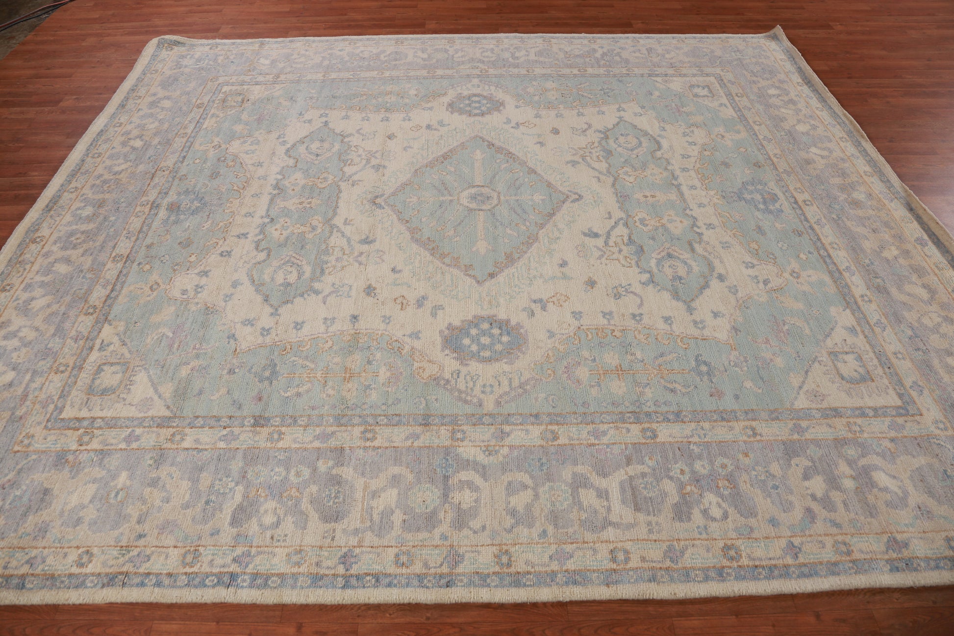 A Beautiful Genuine Turkey Oushak rug is Hand Knotted by skillful weavers in Turkey with 100% Wool Material. This rug is in New, First Quality condition. dimensions are 9' 9'' X 8' 4'' in foot and 297 X 254 in centimeter. the primary color is Beige & Ivories.