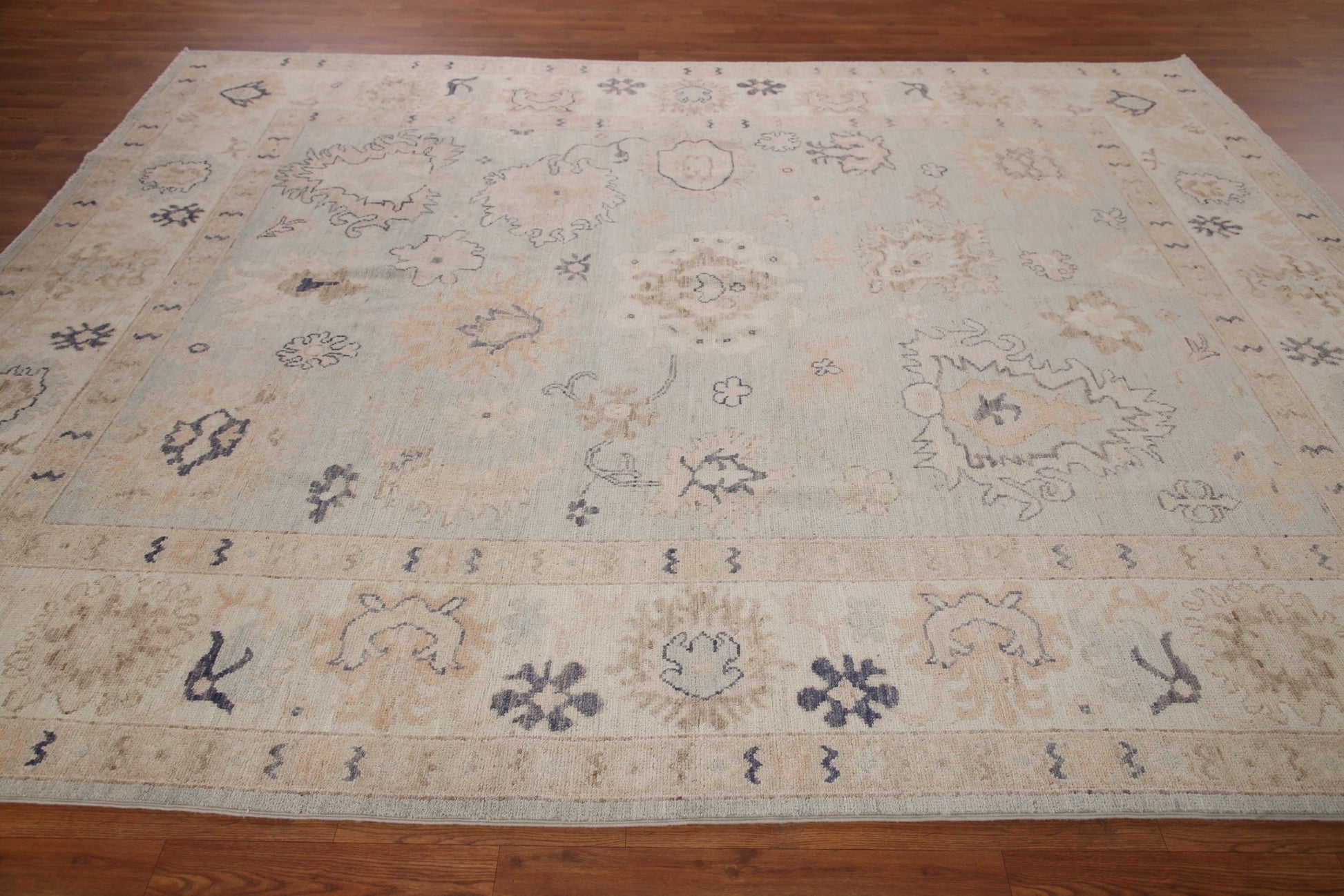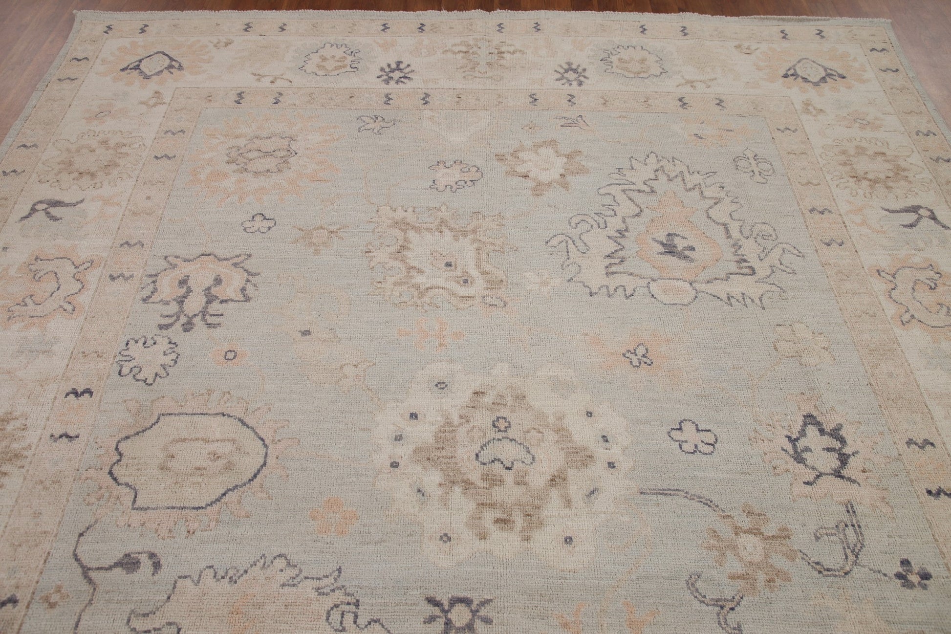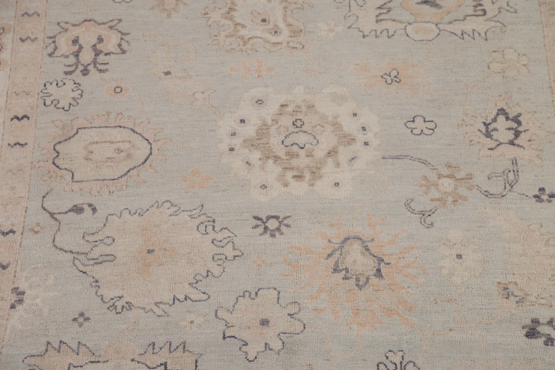 A Beautiful Genuine Turkey Oushak rug is Hand Knotted by skillful weavers in Turkey with 100% Wool Material. This rug is in New, First Quality condition. dimensions are 9' 11'' X 8' 0'' in foot and 302 X 244 in centimeter. the primary color is Greys & Charcoal.