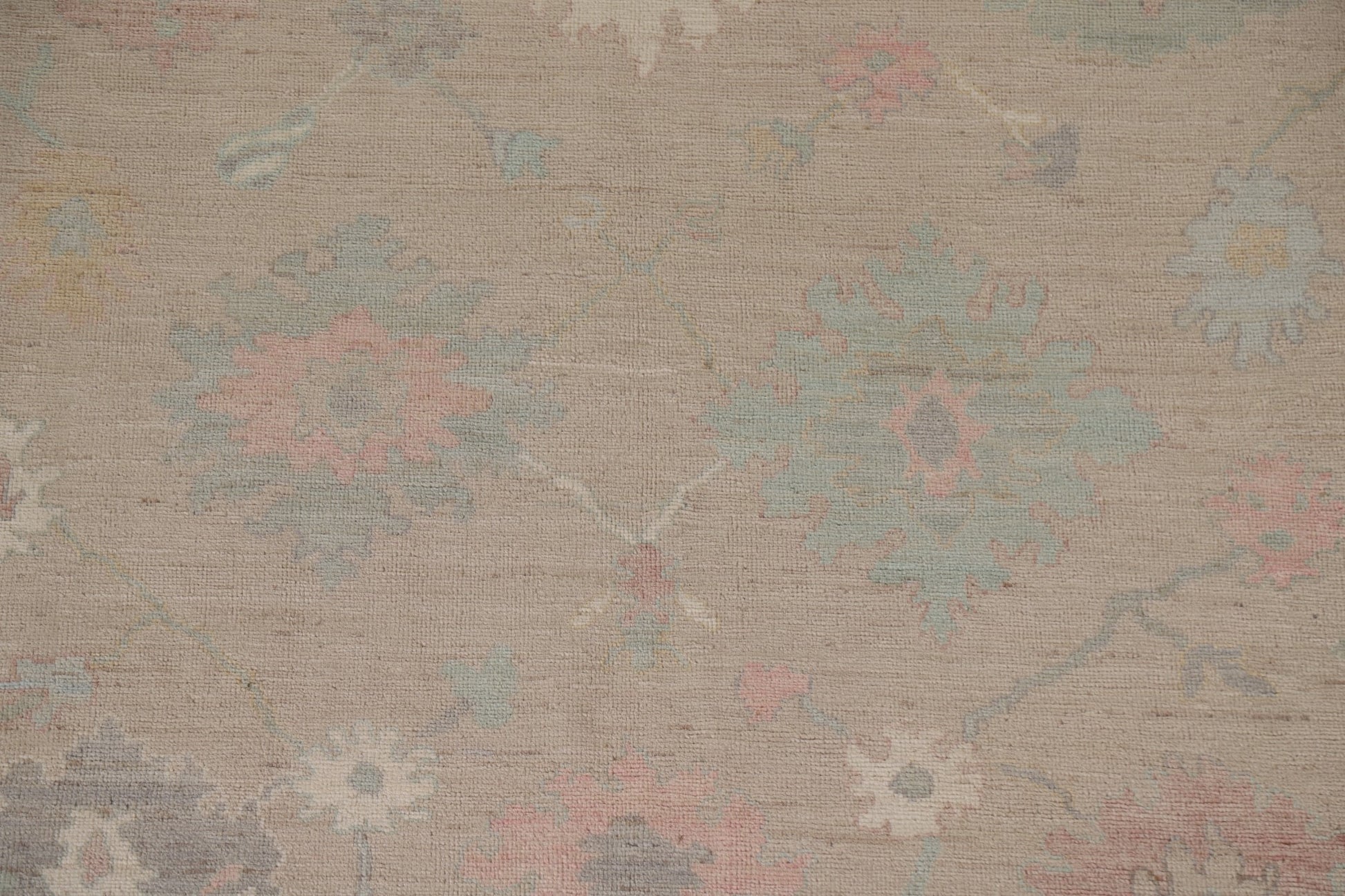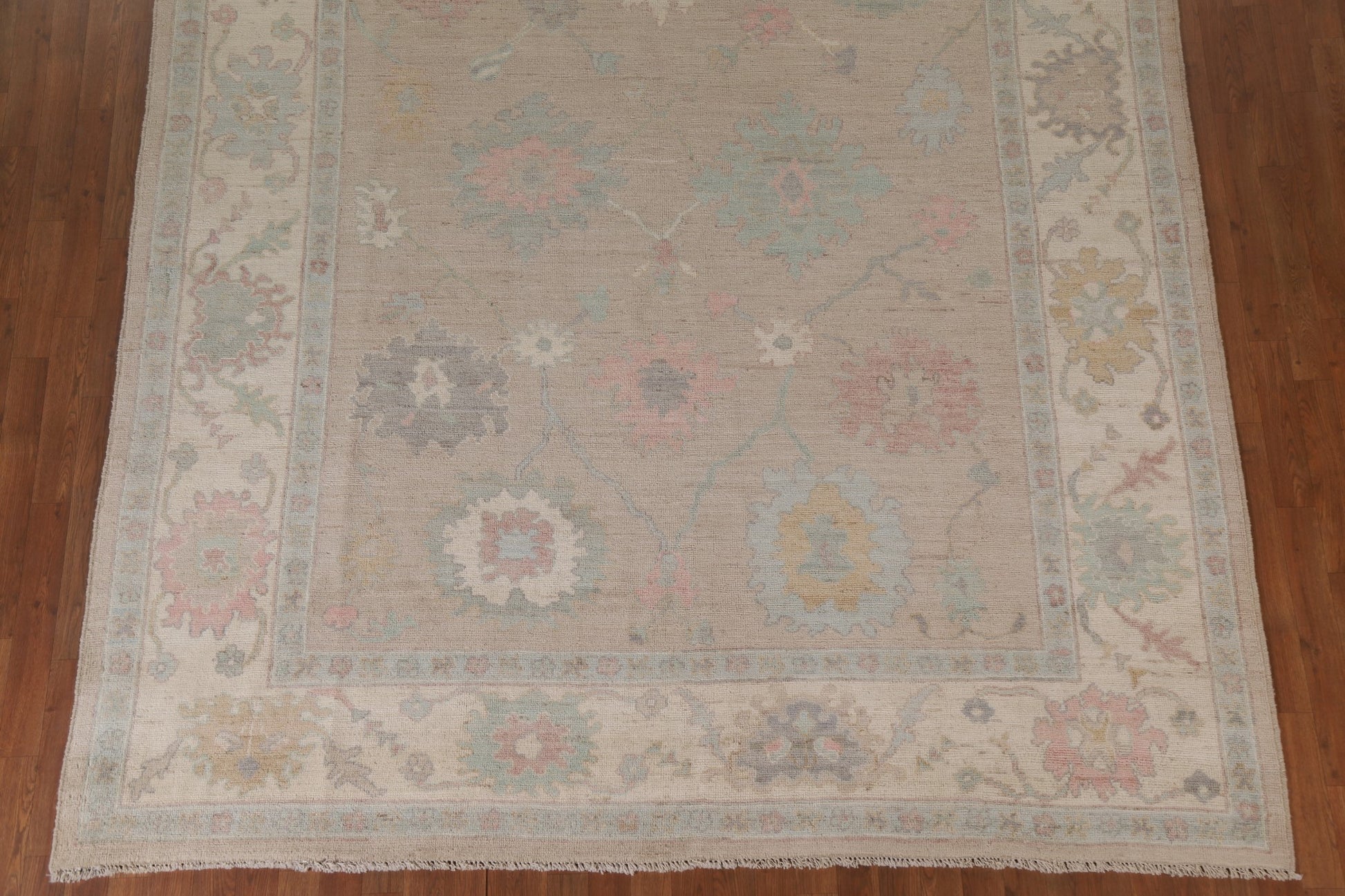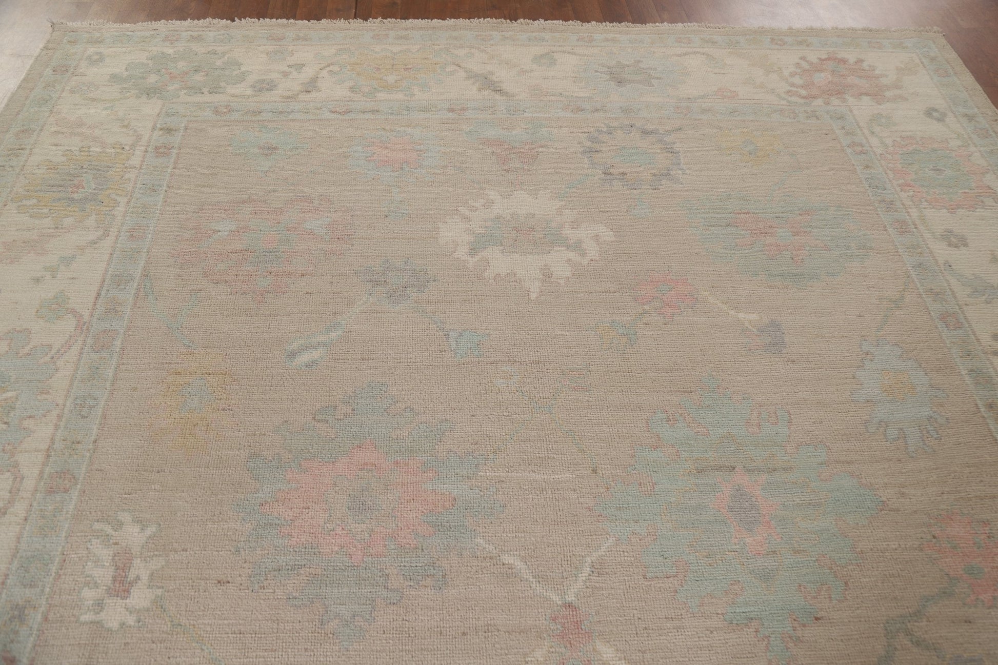 A Beautiful Genuine Turkey Oushak rug is Hand Knotted by skillful weavers in Turkey with 100% Wool Material. This rug is in New, First Quality condition. dimensions are 9' 11'' X 8' 2'' in foot and 302 X 249 in centimeter. the primary color is Beige & Ivories.