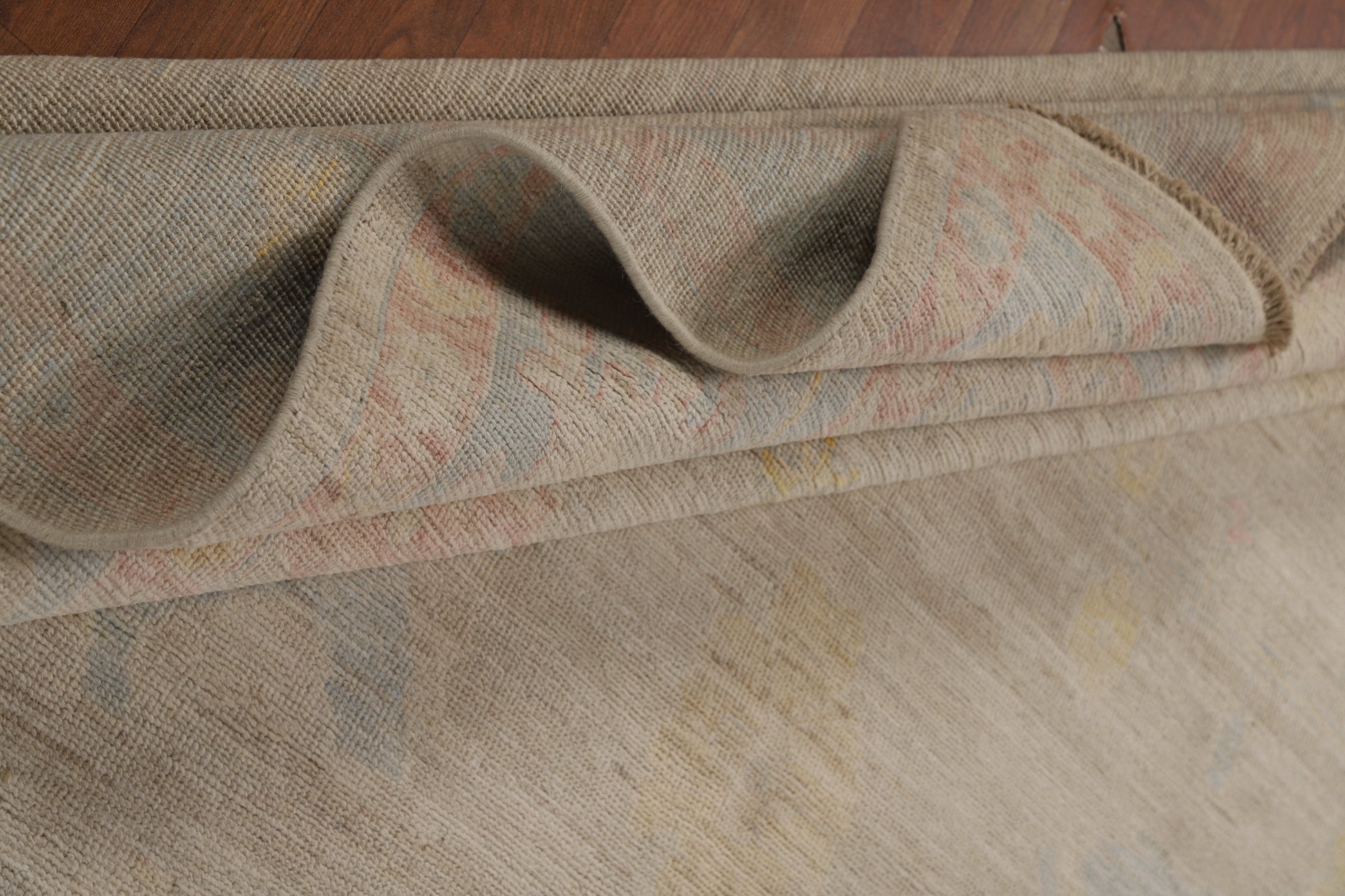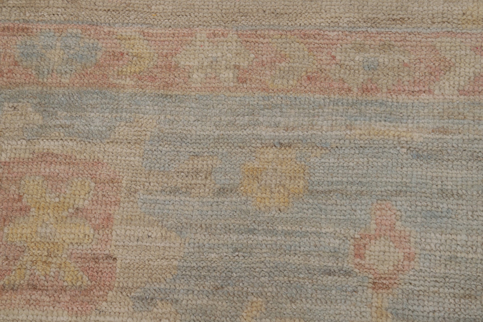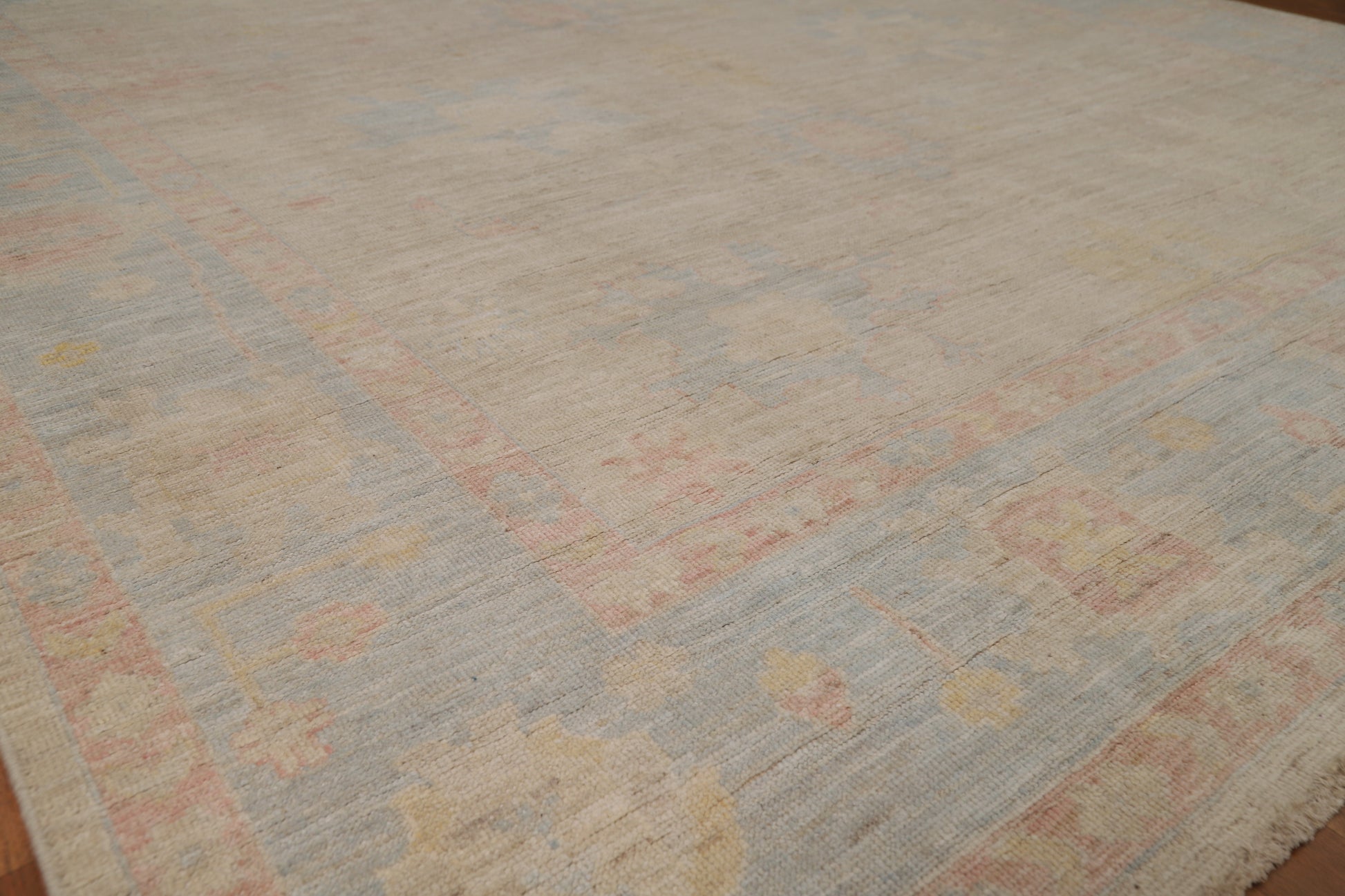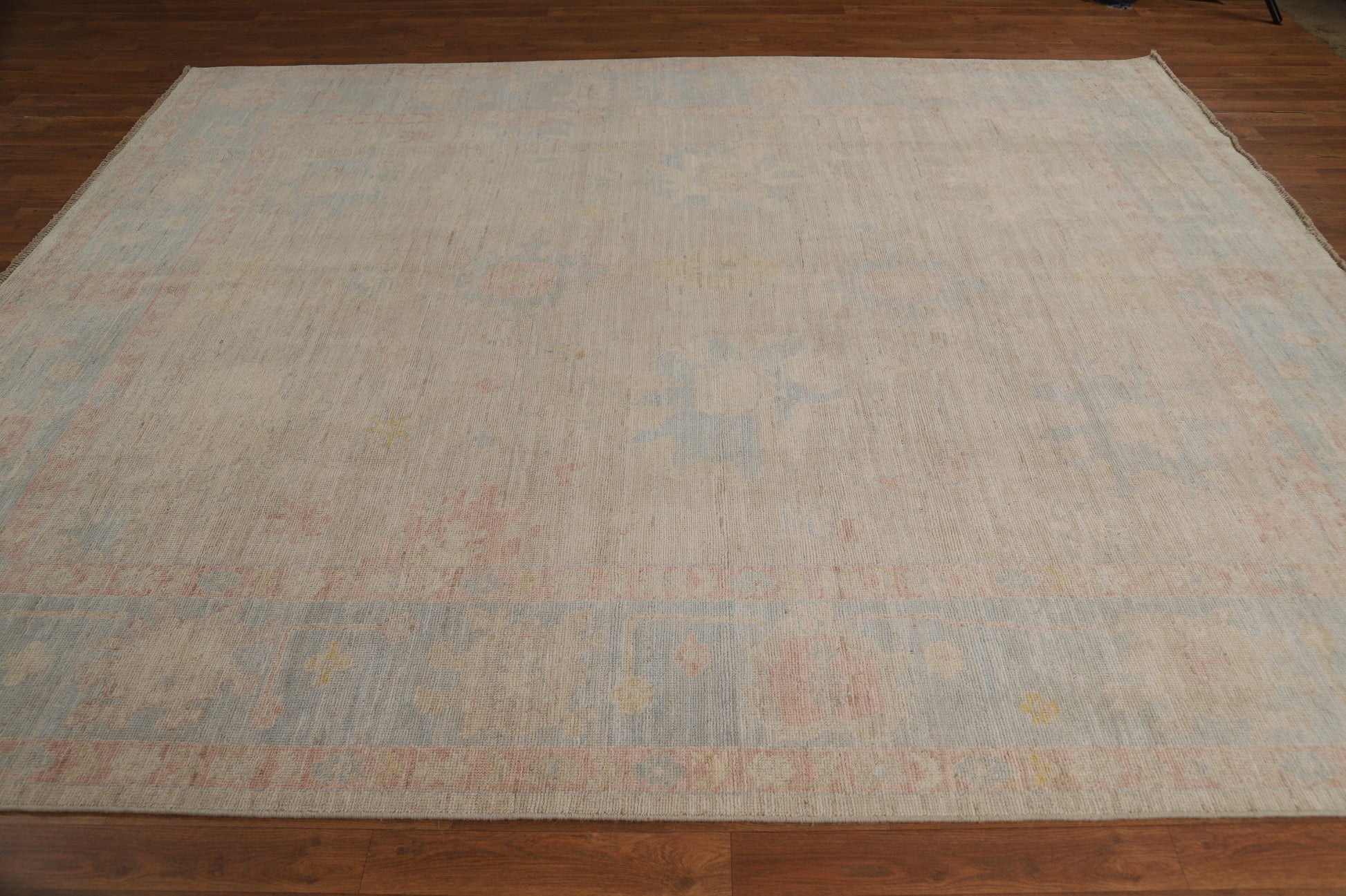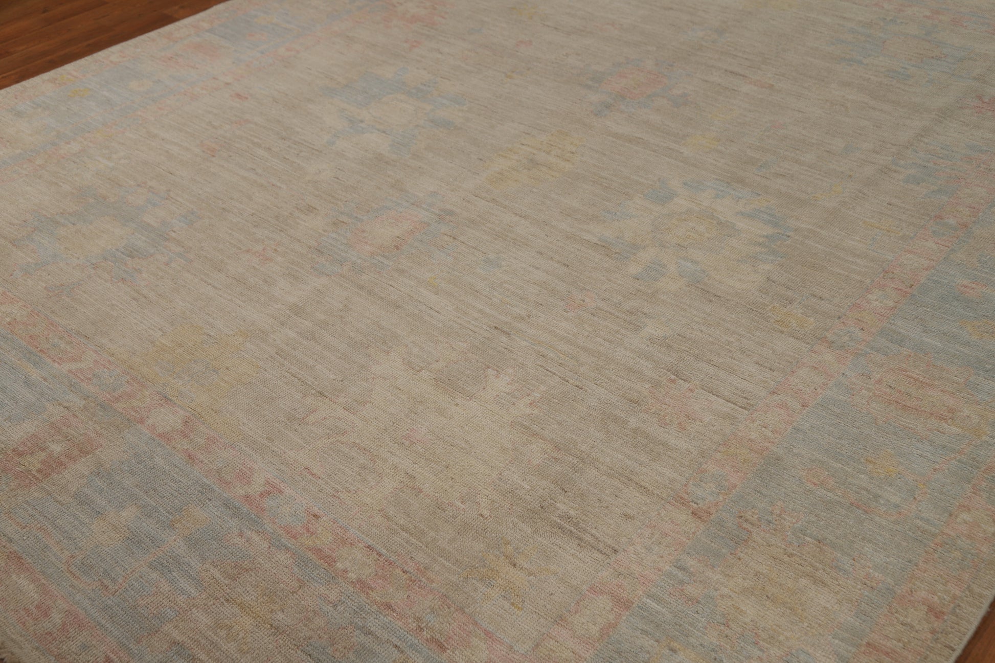 A Beautiful Genuine Turkey Oushak rug is Hand Knotted by skillful weavers in Turkey with 100% Wool Material. This rug is in New, First Quality condition. dimensions are 9' 9'' X 8' 0'' in foot and 297 X 244 in centimeter. the primary color is Beige & Ivories.