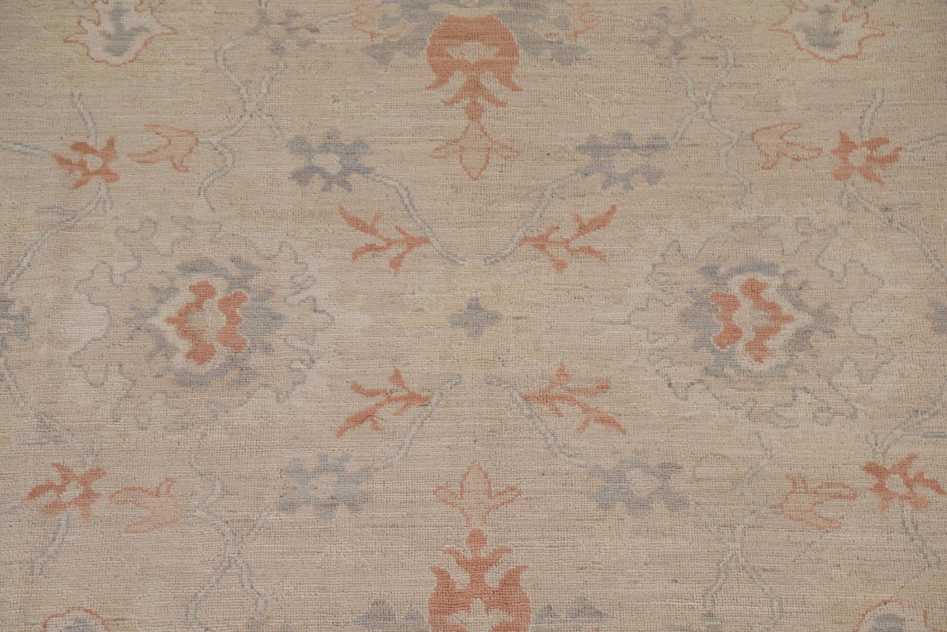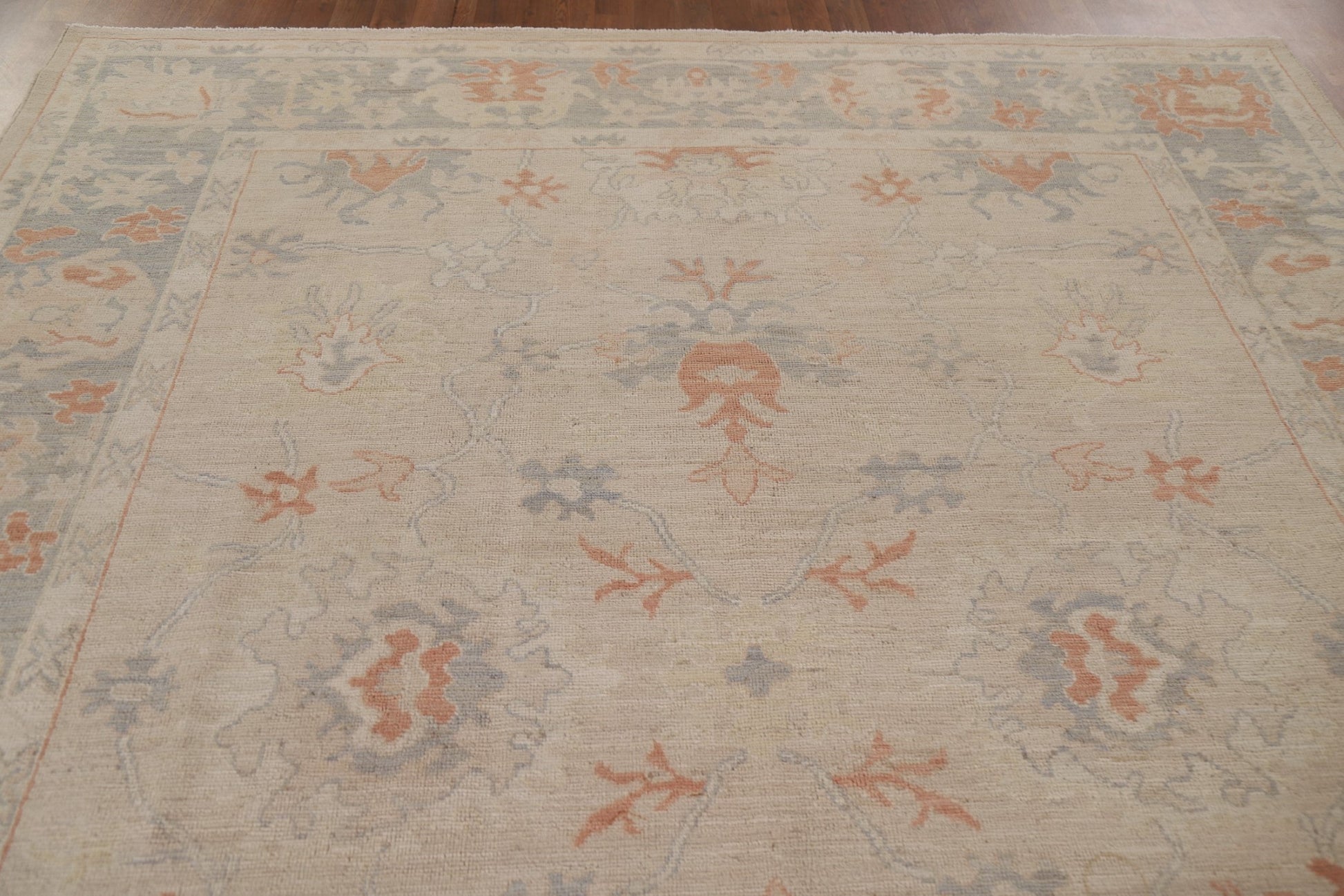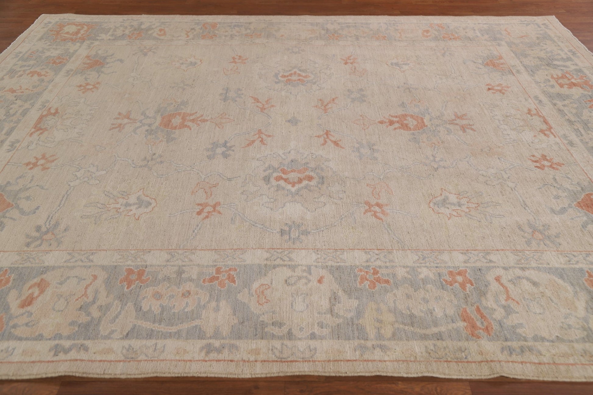 A Beautiful Genuine Turkey Oushak rug is Hand Knotted by skillful weavers in Turkey with 100% Wool Material. This rug is in New, First Quality condition. dimensions are 11' 1'' X 8' 2'' in foot and 338 X 249 in centimeter. the primary color is Beige & Ivories.