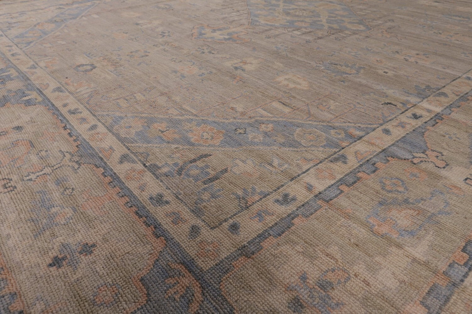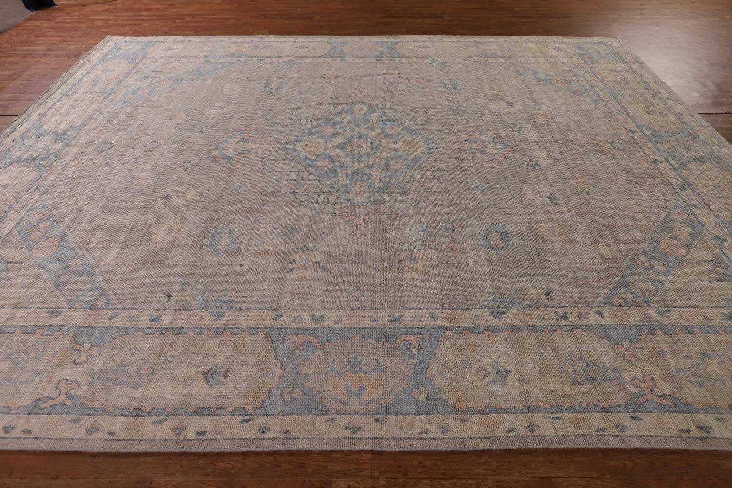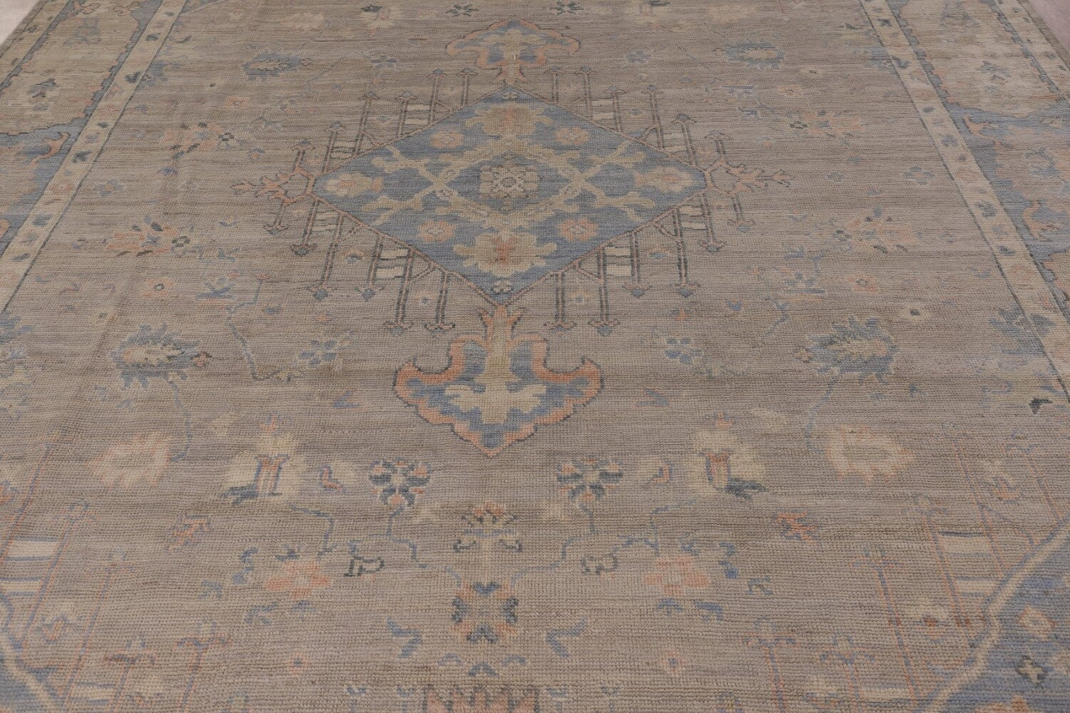 A Beautiful Genuine Turkey Oushak rug is Hand Knotted by skillful weavers in Turkey with 100% Wool Material. This rug is in New, First Quality condition. dimensions are 11' 11'' X 8' 4'' in foot and 363 X 254 in centimeter. the primary color is Greys & Charcoal.