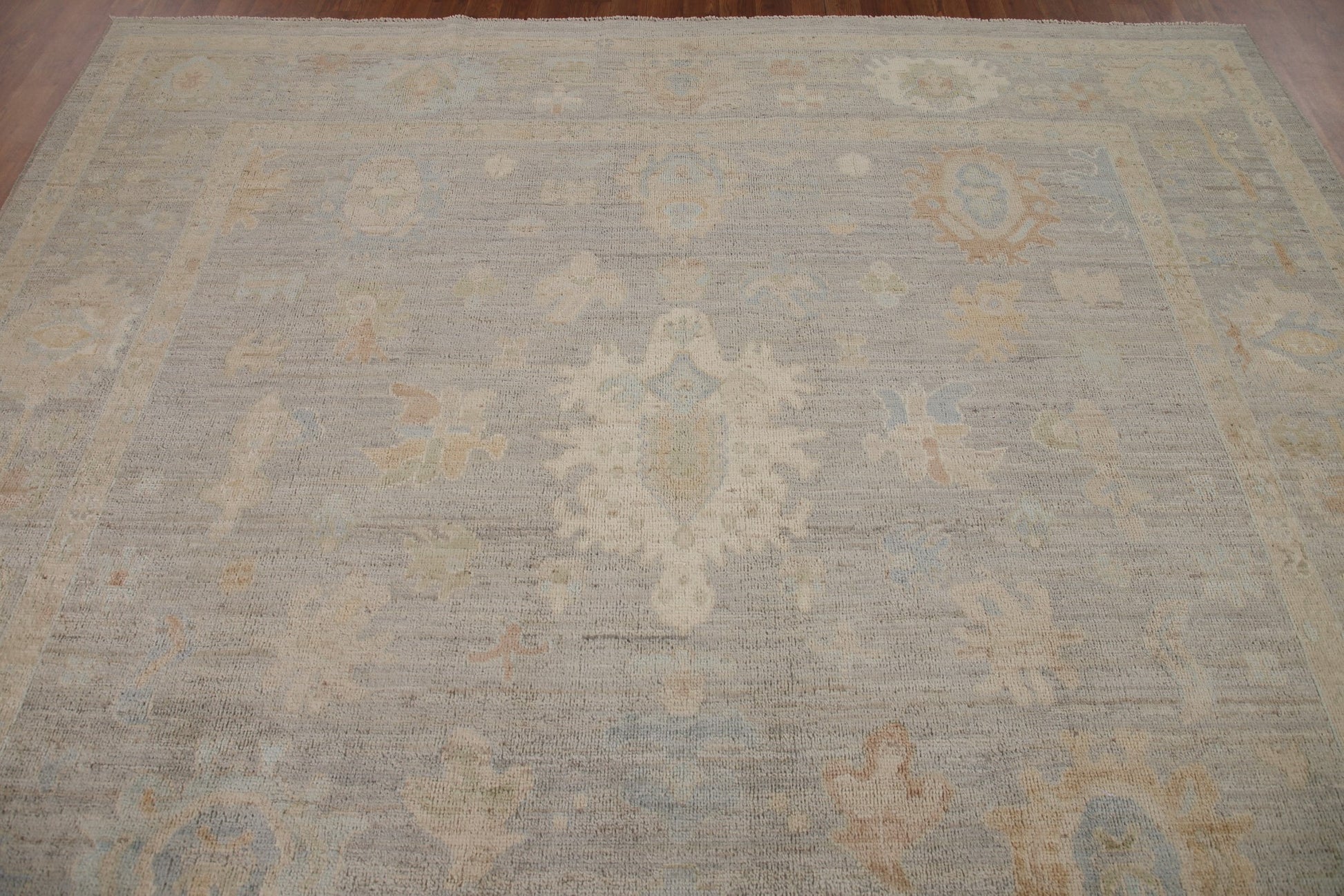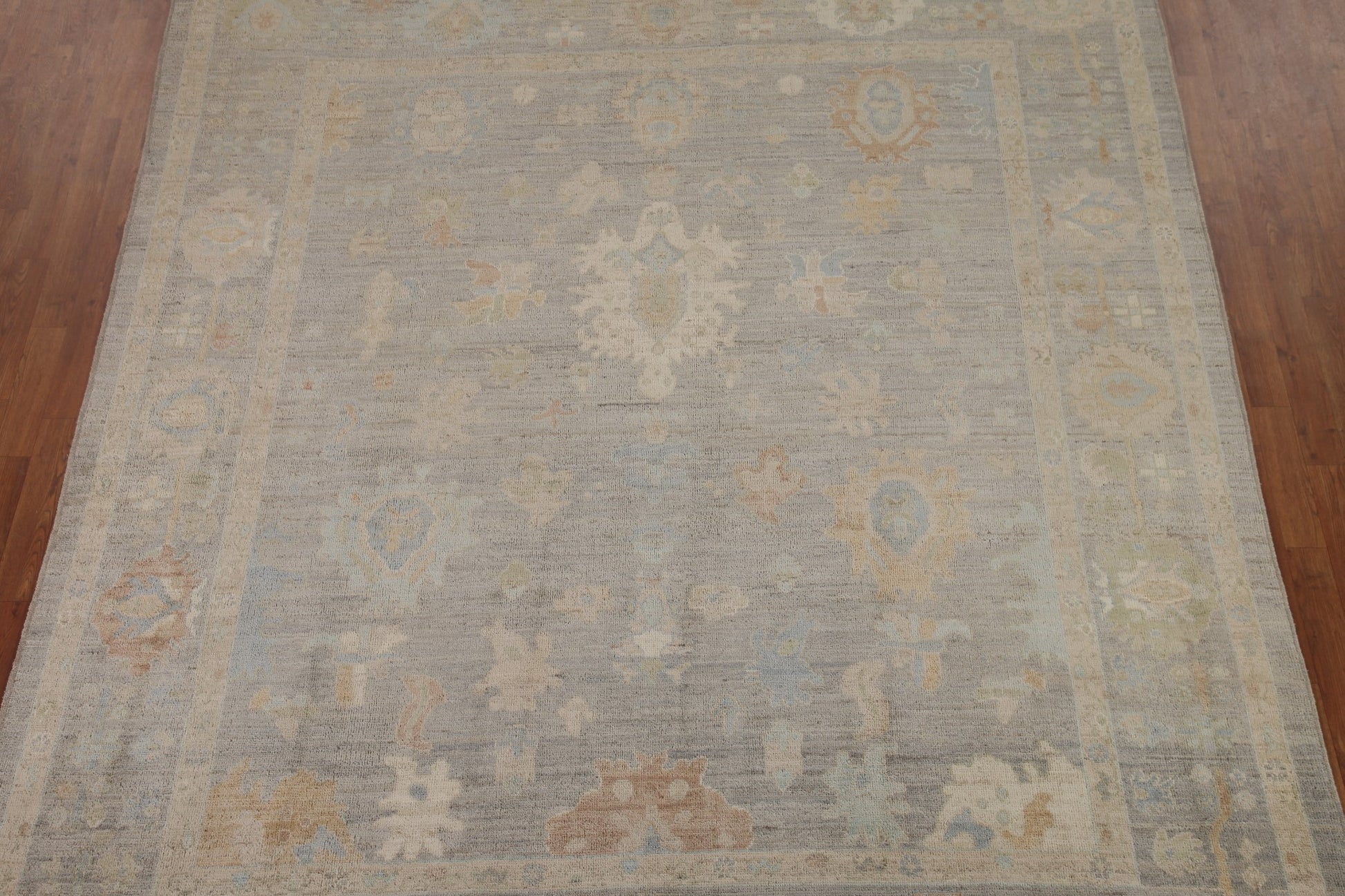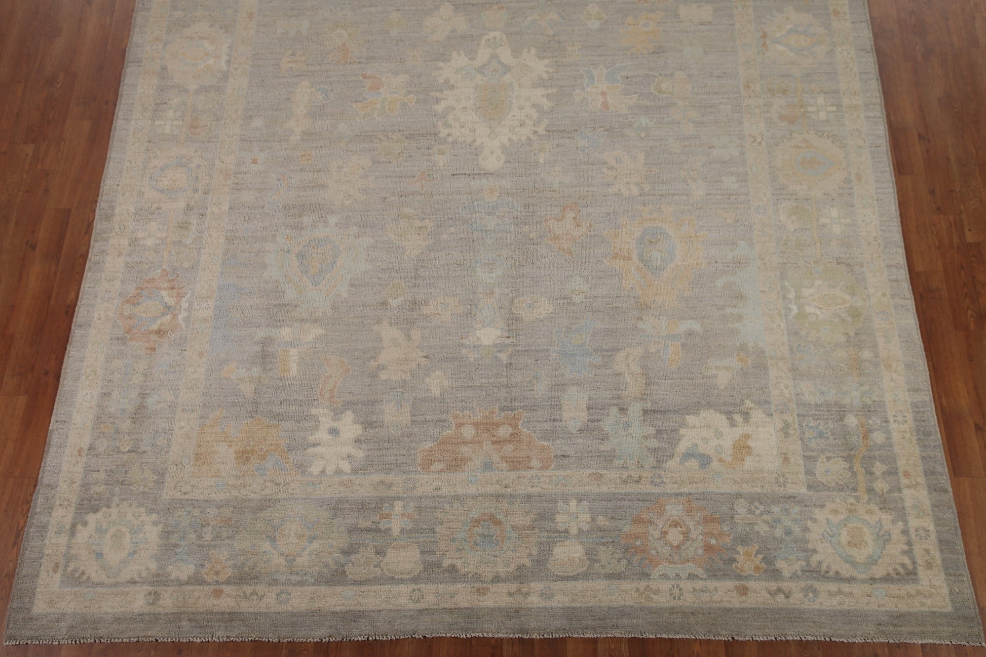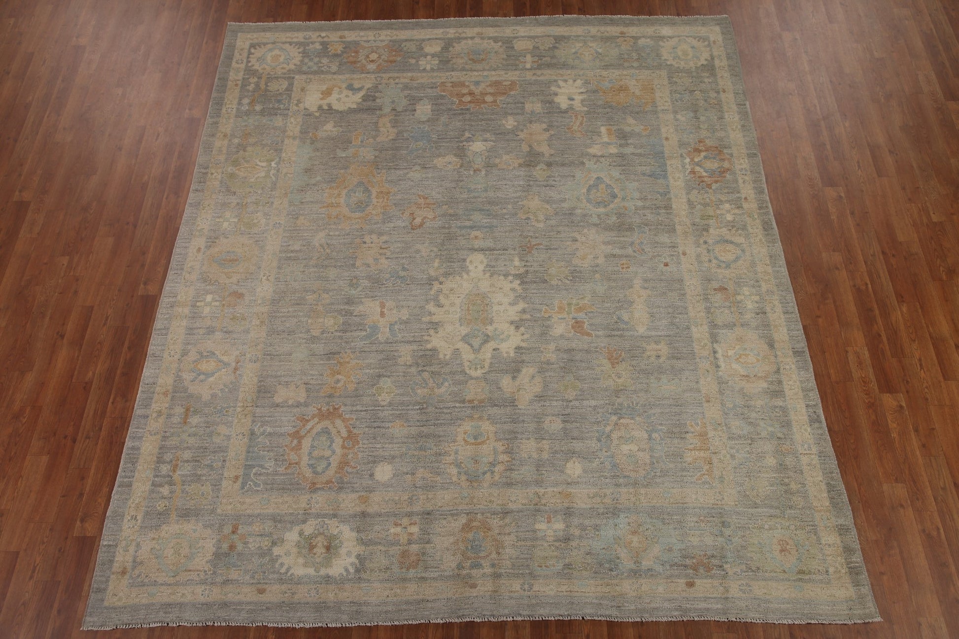 A Beautiful Genuine Turkey Oushak rug is Hand Knotted by skillful weavers in Turkey with 100% Wool Material. This rug is in New, First Quality condition. dimensions are 9' 8'' X 8' 6'' in foot and 295 X 259 in centimeter. the primary color is Greys & Charcoal.