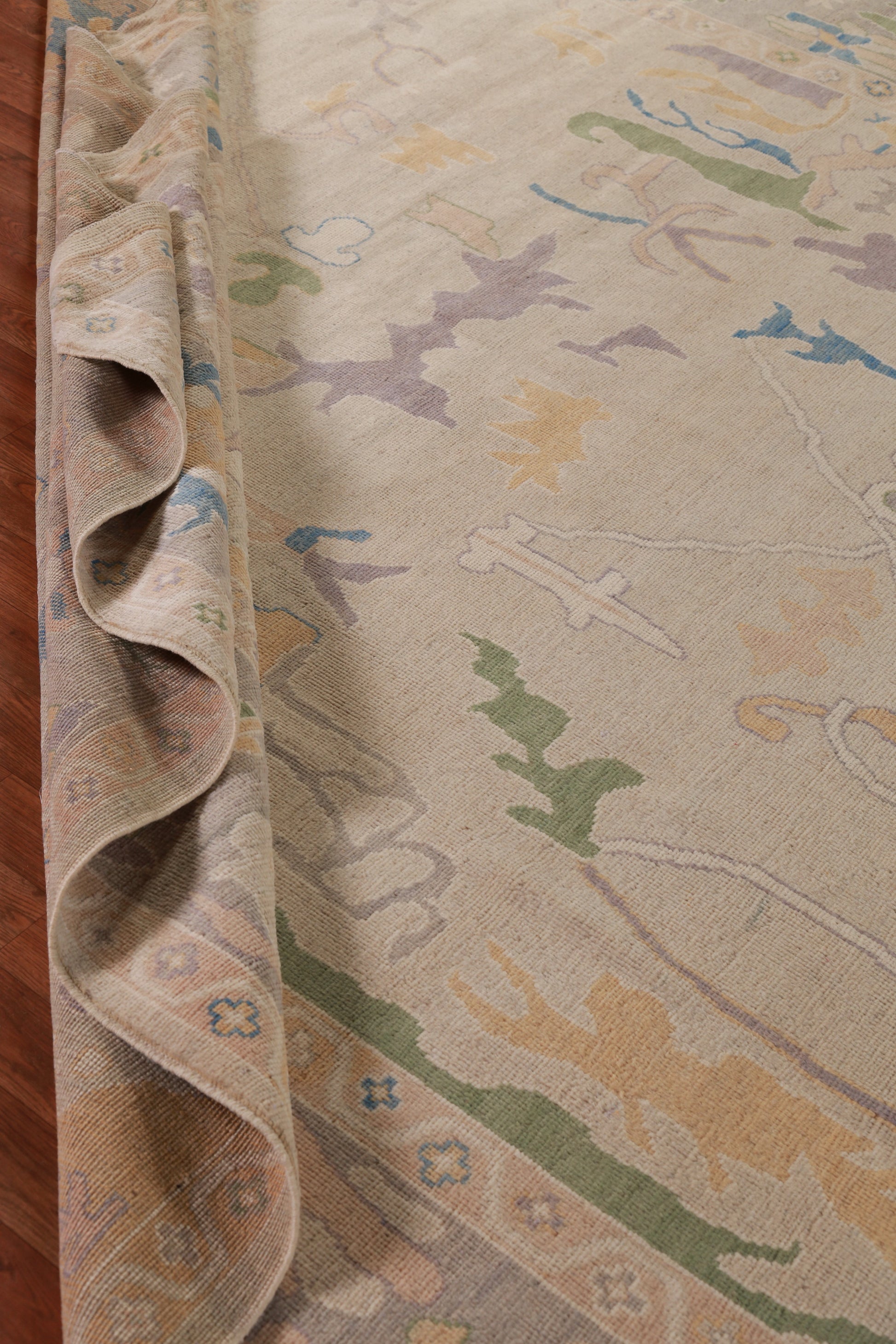 A Beautiful Genuine Turkey Oushak rug is Hand Knotted by skillful weavers in Turkey with 100% Wool Material. This rug is in New, First Quality condition. dimensions are 12' 3'' X 9' 4'' in foot and  373 X 284 in centimeter. the primary color is Beige & Ivories.