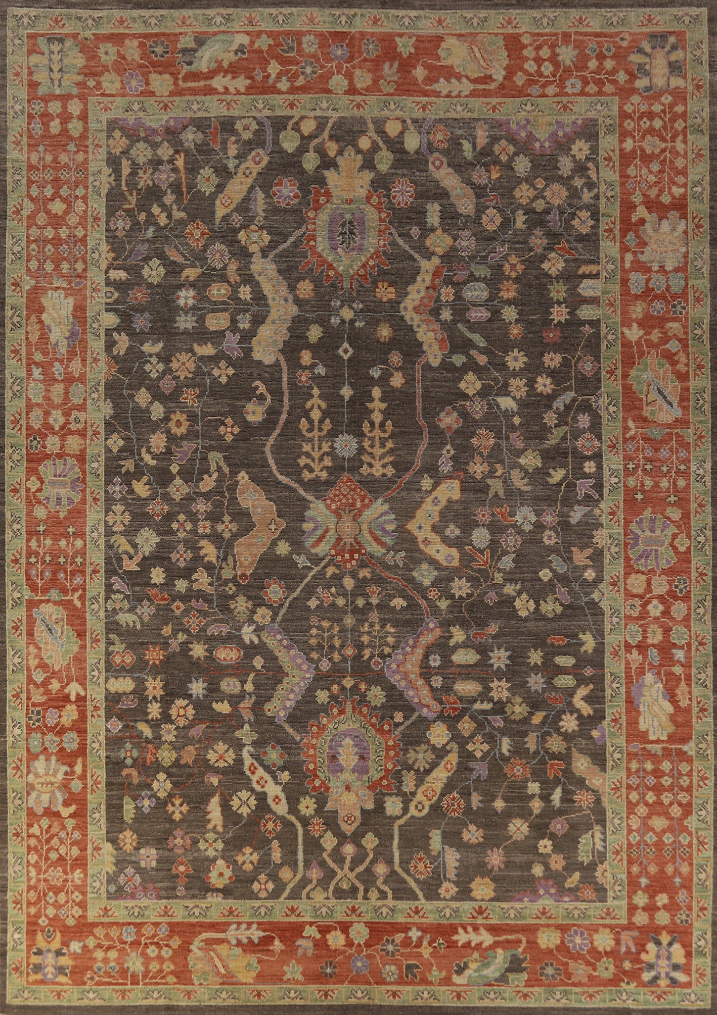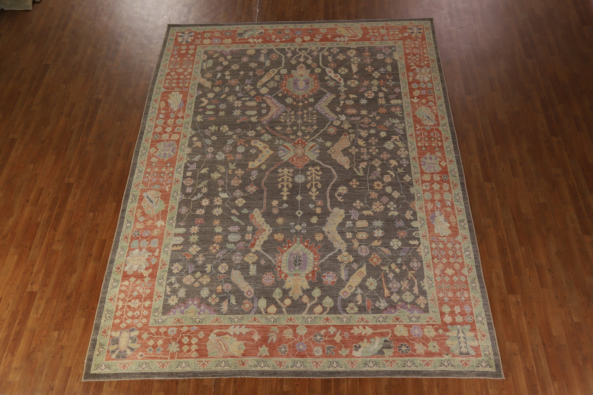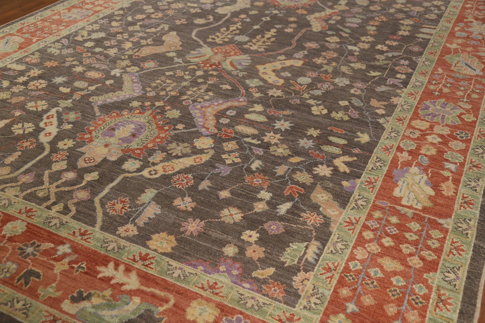 A Beautiful Genuine Turkey Oushak rug is Hand Knotted by skillful weavers in Turkey with 100% Wool Material. This rug is in New, First Quality condition. dimensions are 12' 3'' X 9' 4'' in foot and 373 X 284 in centimeter. the primary color is Greys & Charcoal.