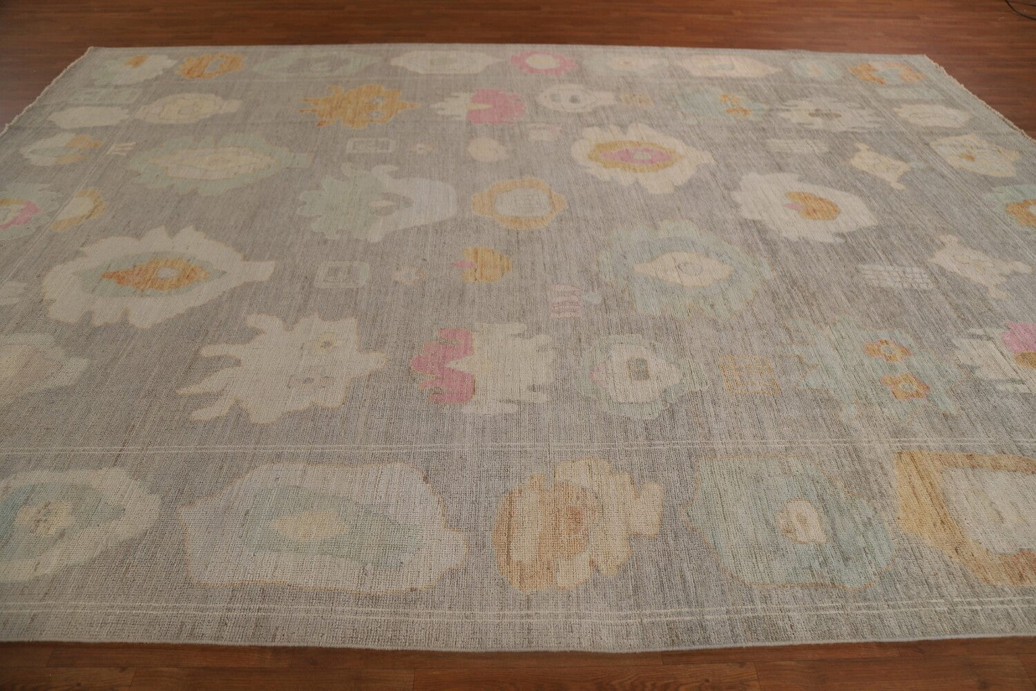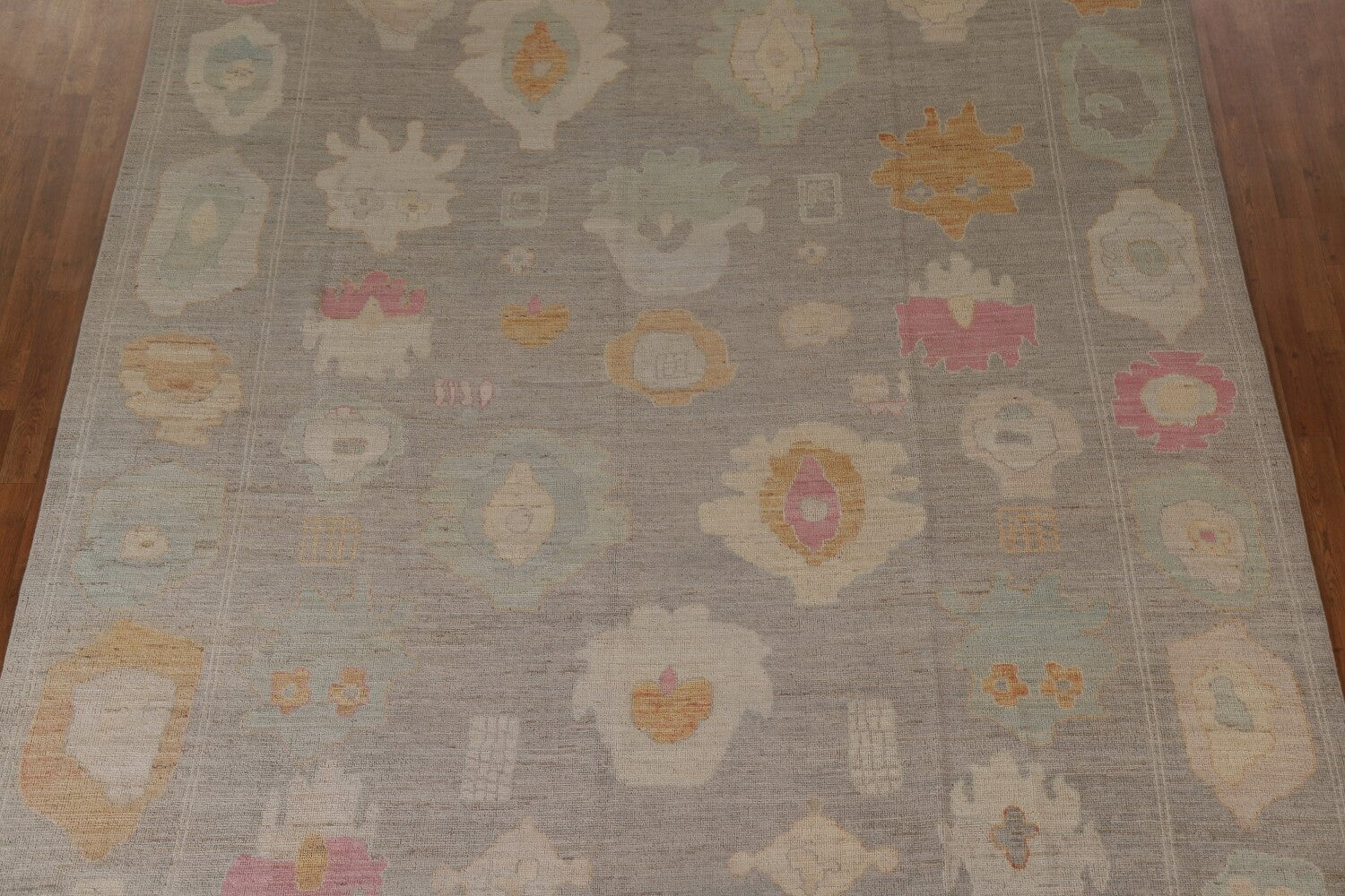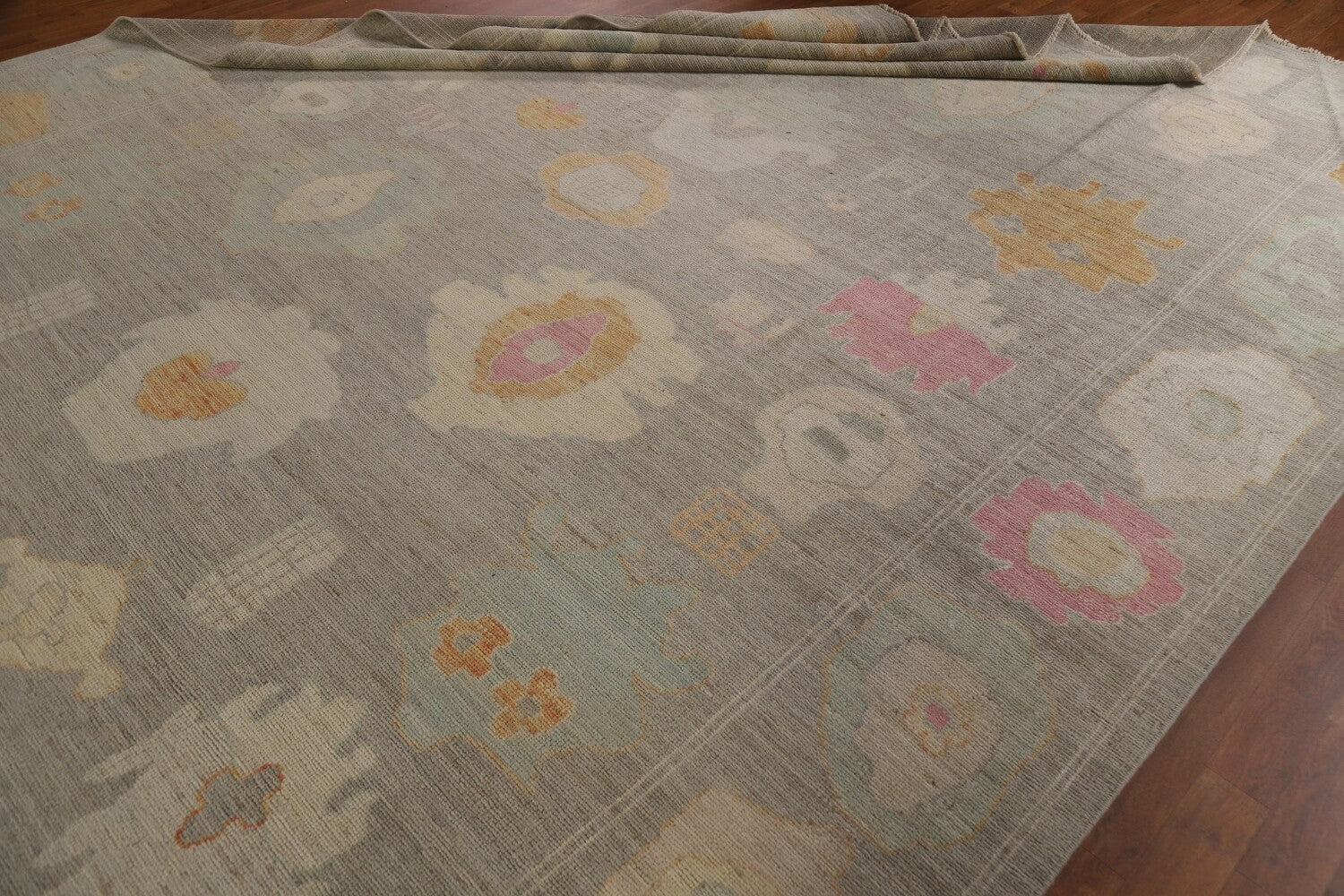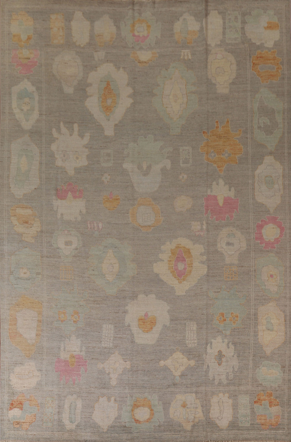 A Beautiful Genuine Turkey Oushak rug is Hand Knotted by skillful weavers in Turkey with 100% Wool Material. This rug is in condition. dimensions are 12' 4'' X 9' 3'' in foot and 376 X 282 in centimeter. the primary color is Greys & Charcoal.