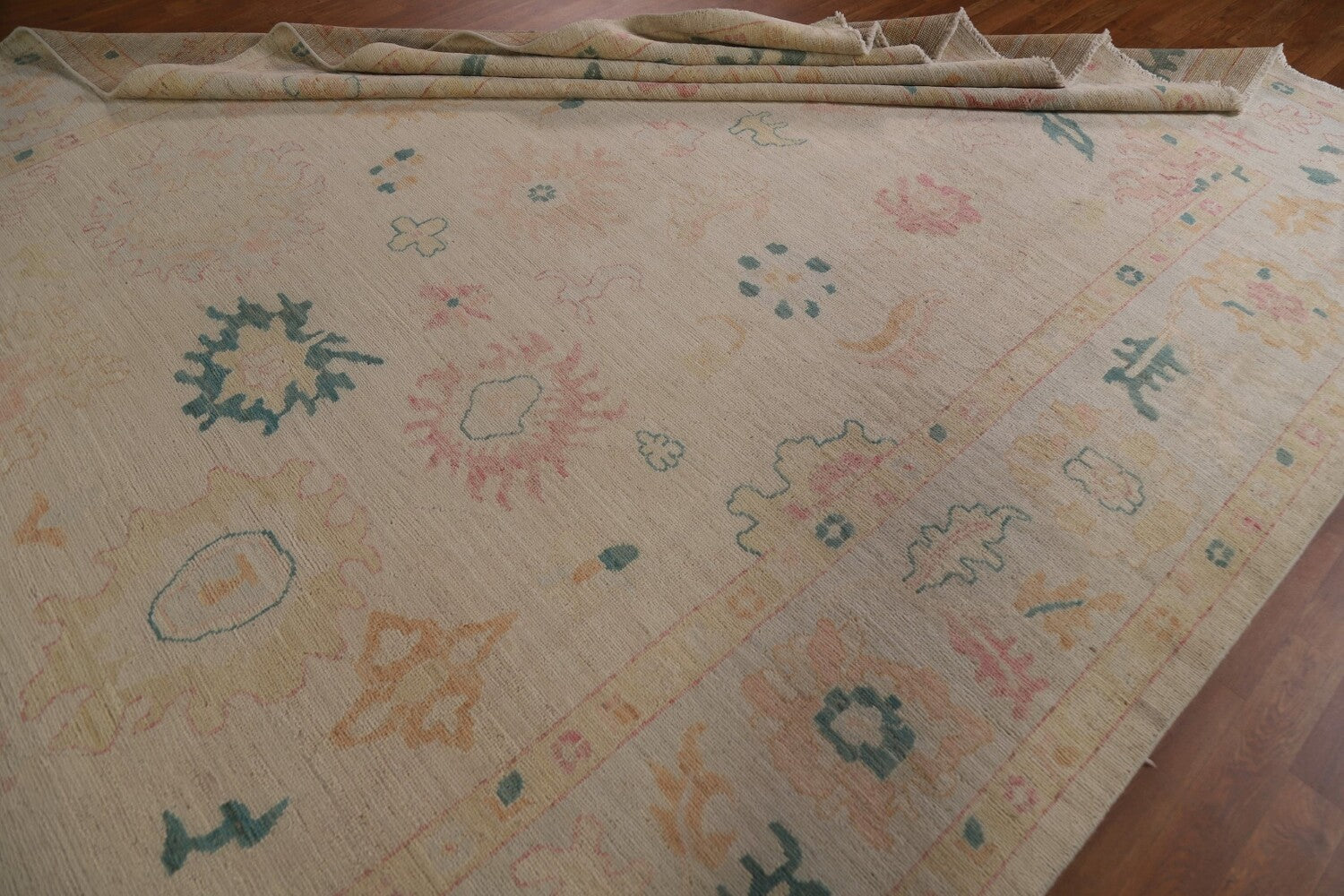 A Beautiful Genuine Turkey Oushak rug is Hand Knotted by skillful weavers in Turkey with 100% Wool Material. This rug is in New, First Quality condition. dimensions are 11' 10'' X 8' 10'' in foot and 361 X 269 in centimeter. the primary color is Beige & Ivories.