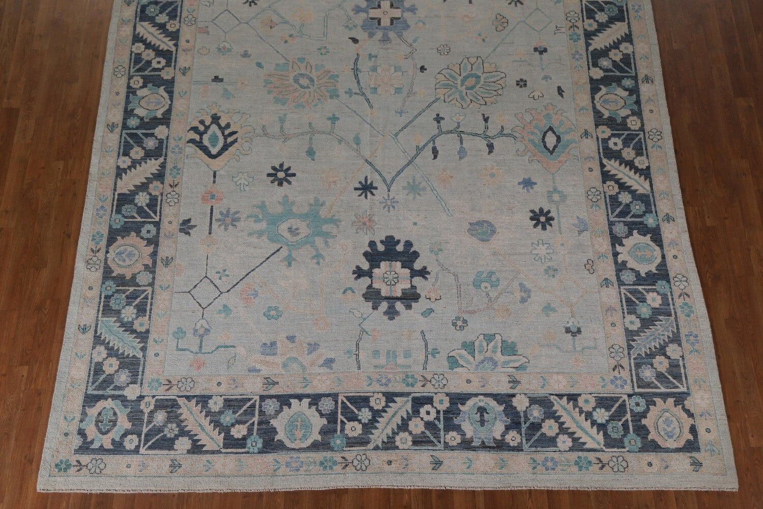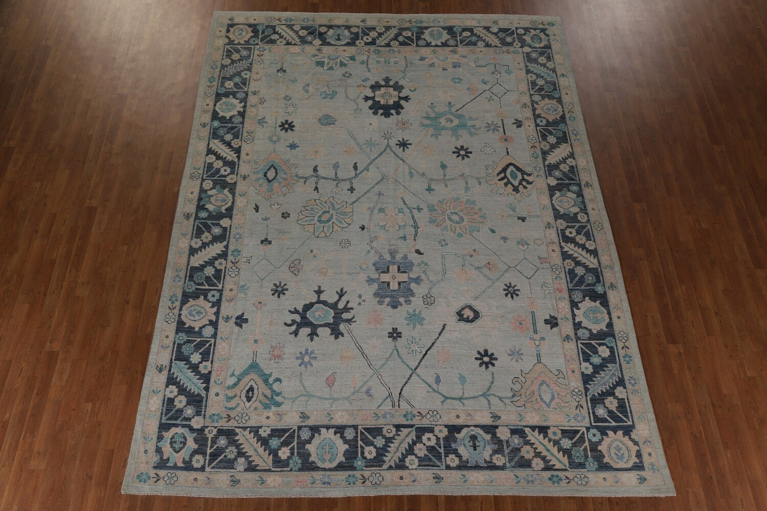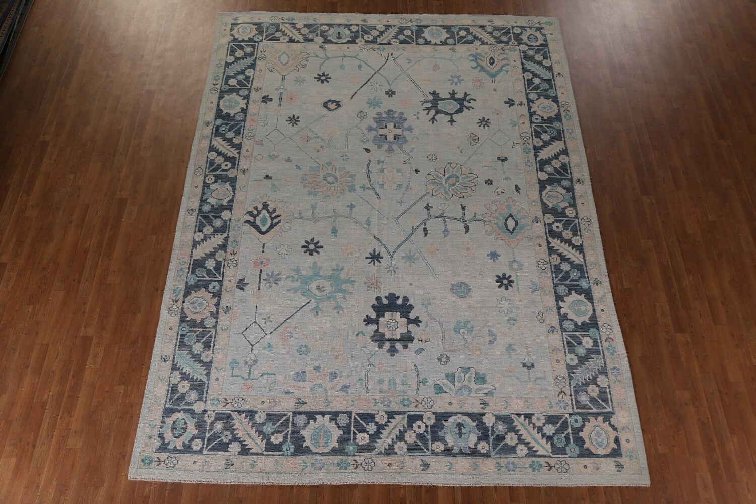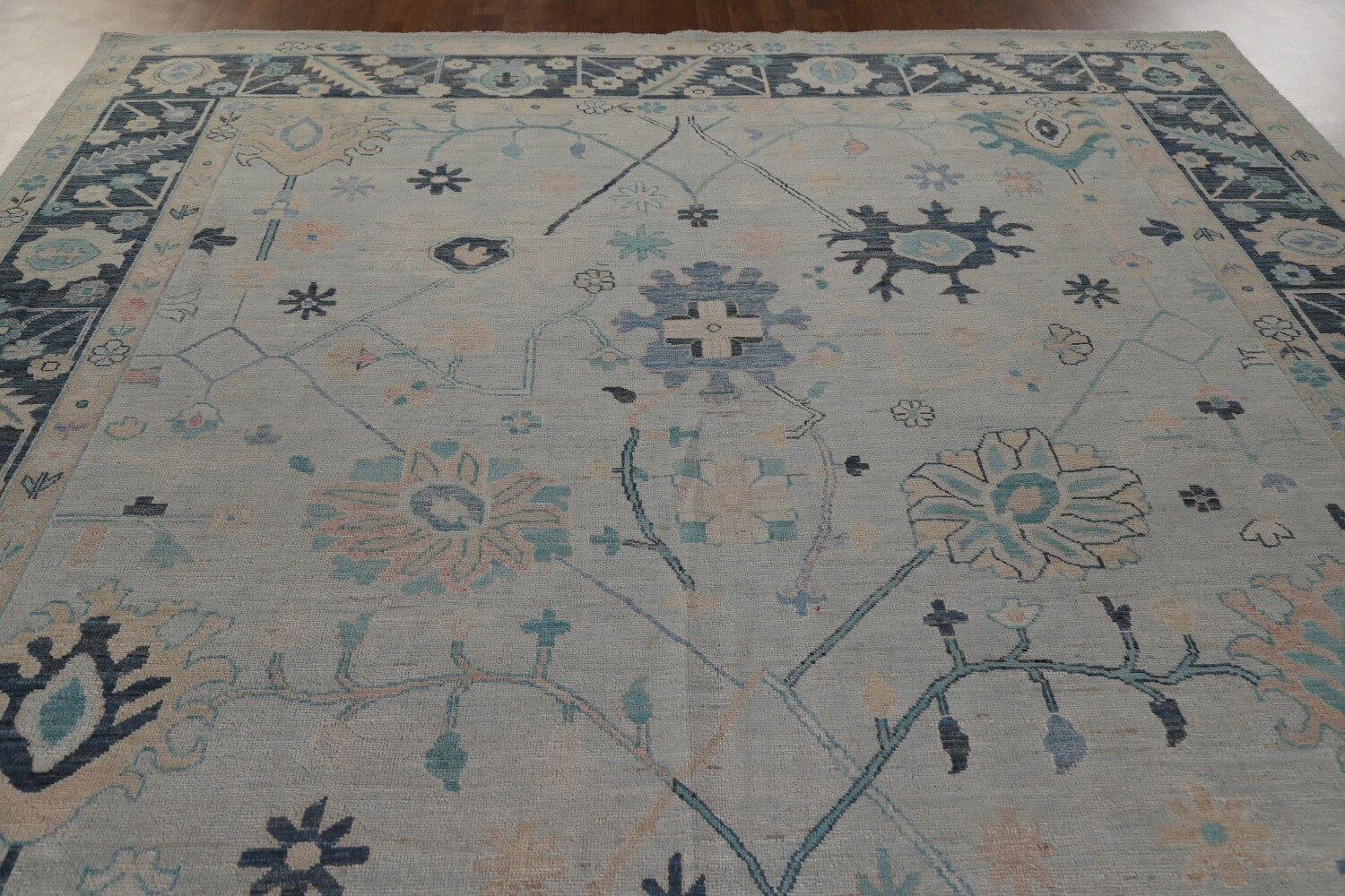 A Beautiful Genuine Turkey Oushak rug is Hand Knotted by skillful weavers in Turkey with 100% Wool Material. This rug is in New, First Quality condition. dimensions are 11' 11'' X 9' 0'' in foot and 363 X 274 in centimeter. the primary color is Navy Blue & Blues.