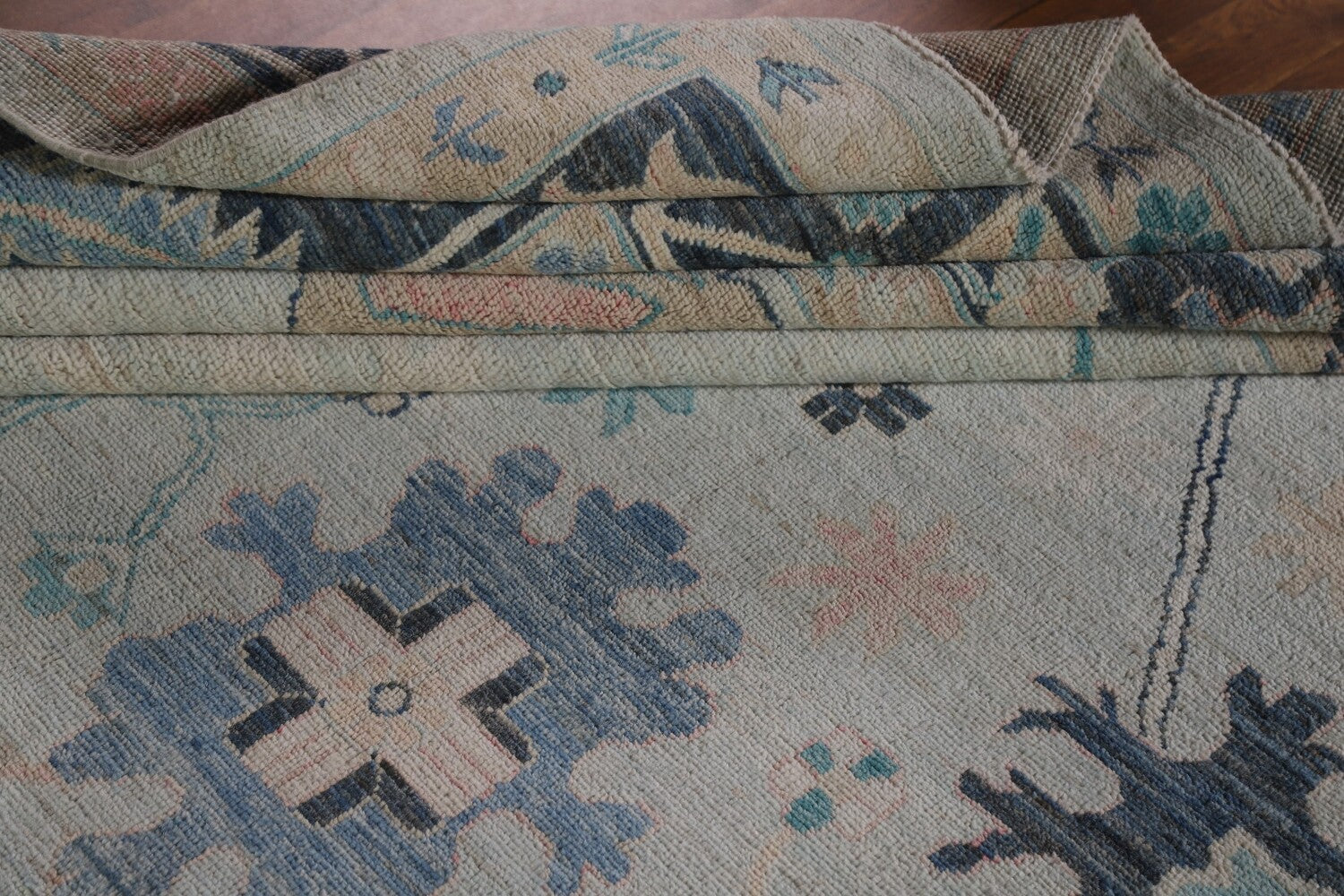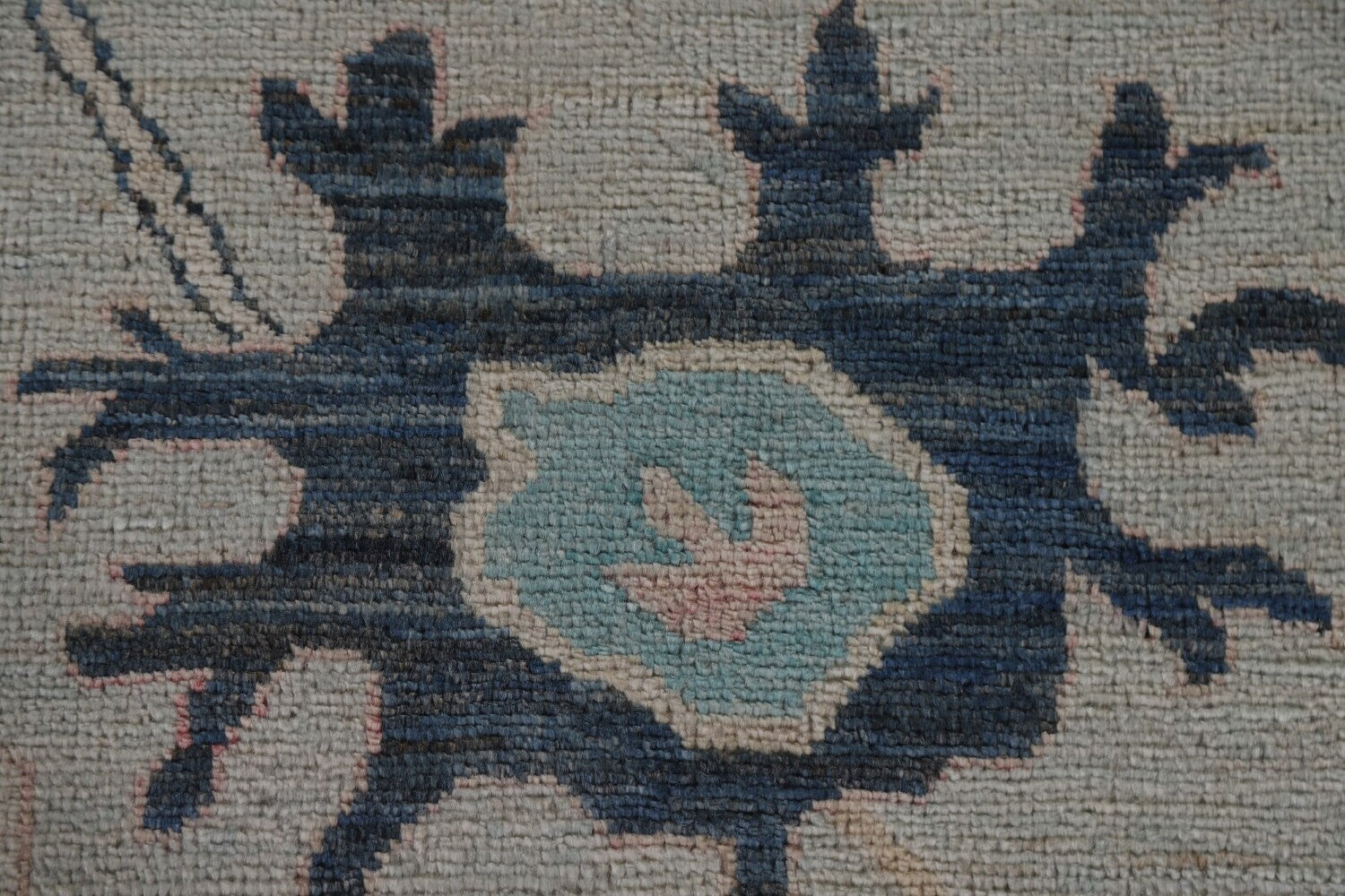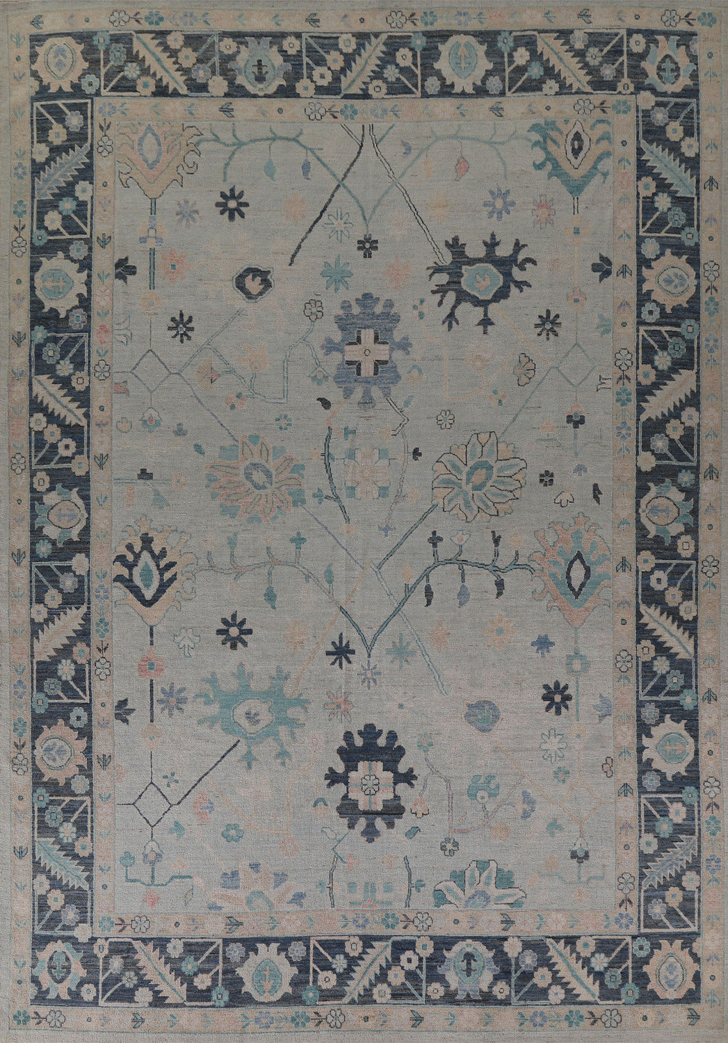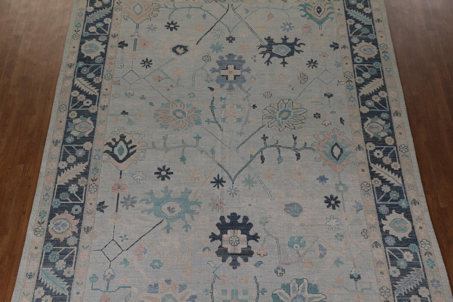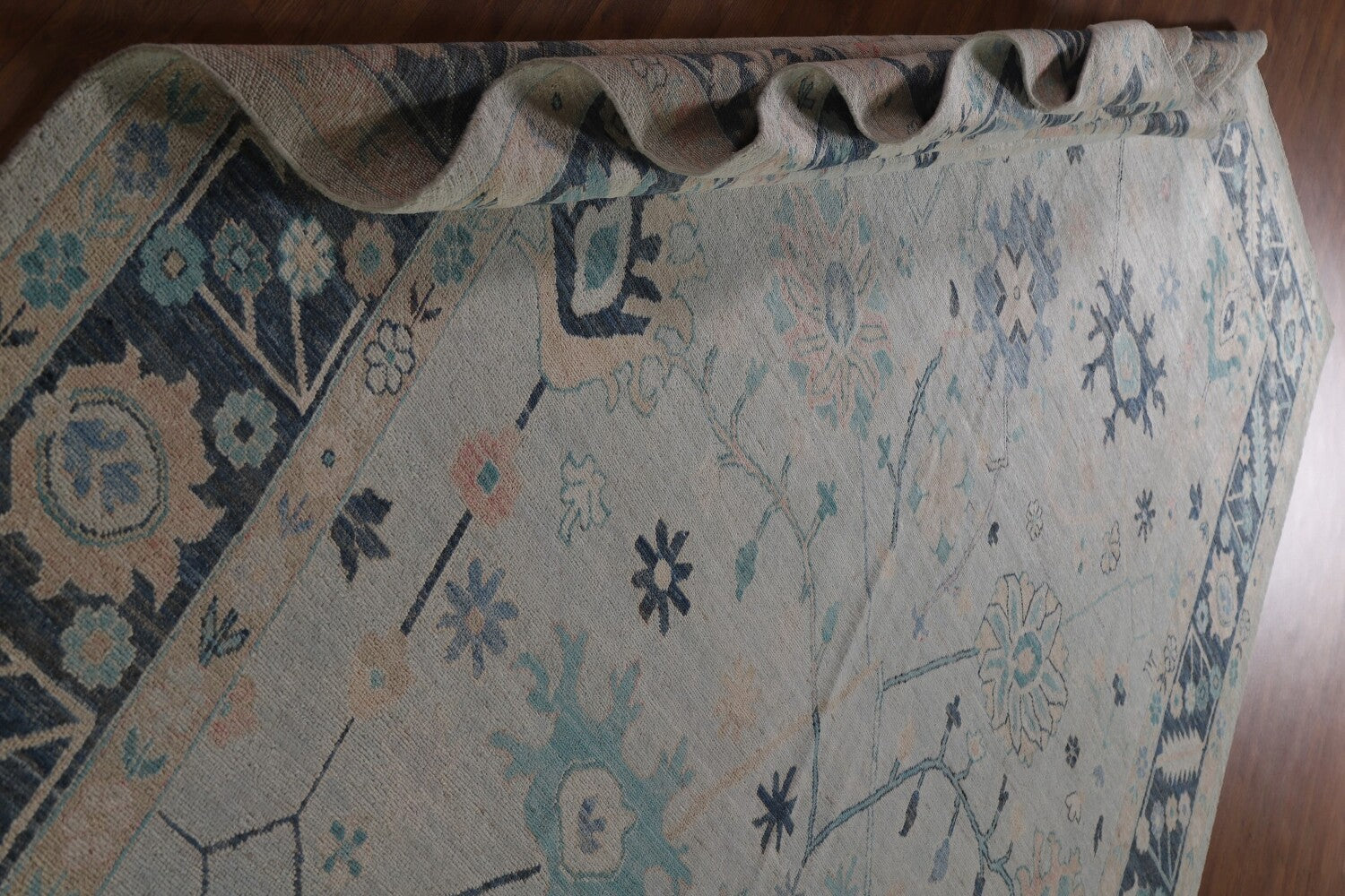 A Beautiful Genuine Turkey Oushak rug is Hand Knotted by skillful weavers in Turkey with 100% Wool Material. This rug is in New, First Quality condition. dimensions are 11' 11'' X 9' 0'' in foot and 363 X 274 in centimeter. the primary color is Navy Blue & Blues.
