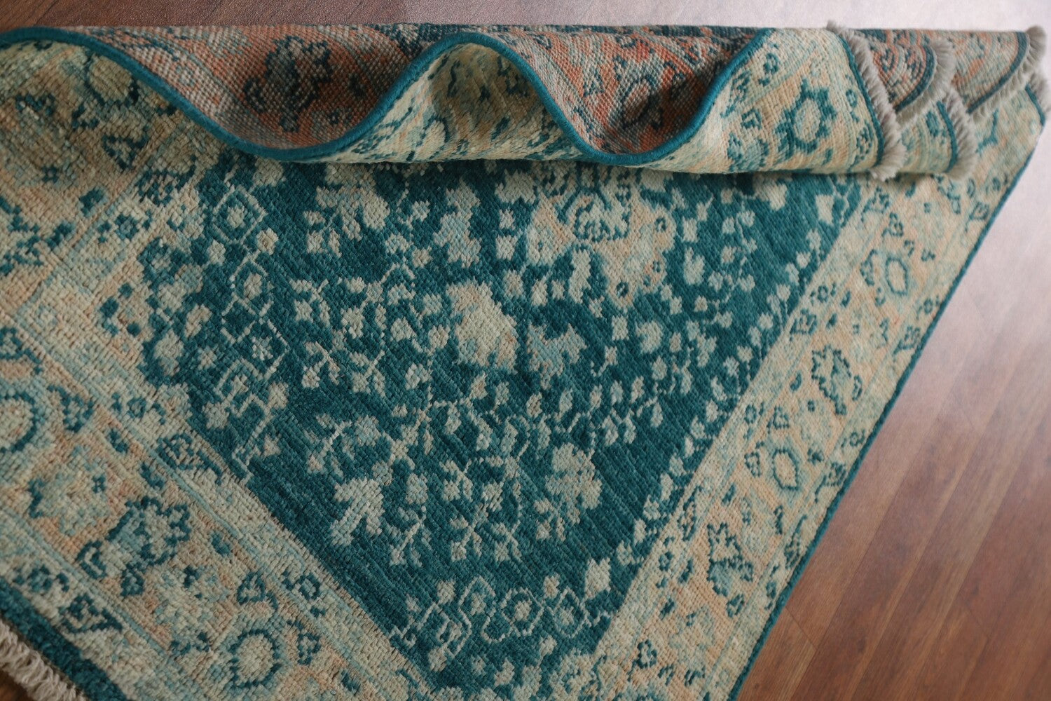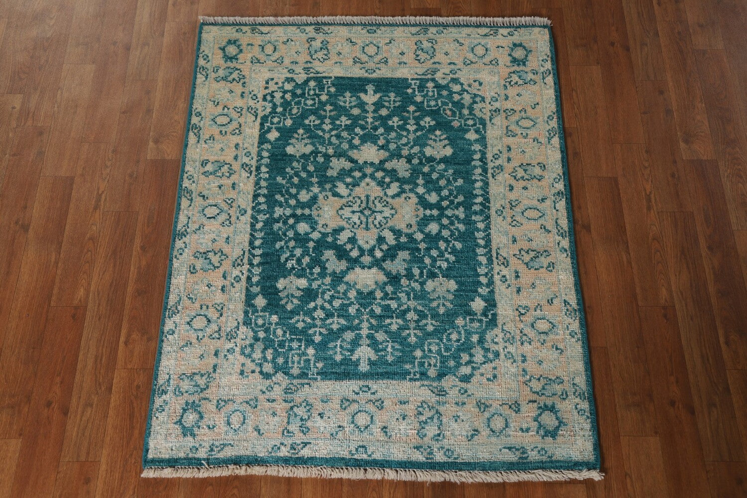 A Beautiful Genuine Turkey Oushak rug is Hand Knotted by skillful weavers in Turkey with 100% Wool Material. This rug is in New, First Quality condition. dimensions are 3' 11'' X 3' 1'' in foot and 119 X 94 in centimeter. the primary color is Green.