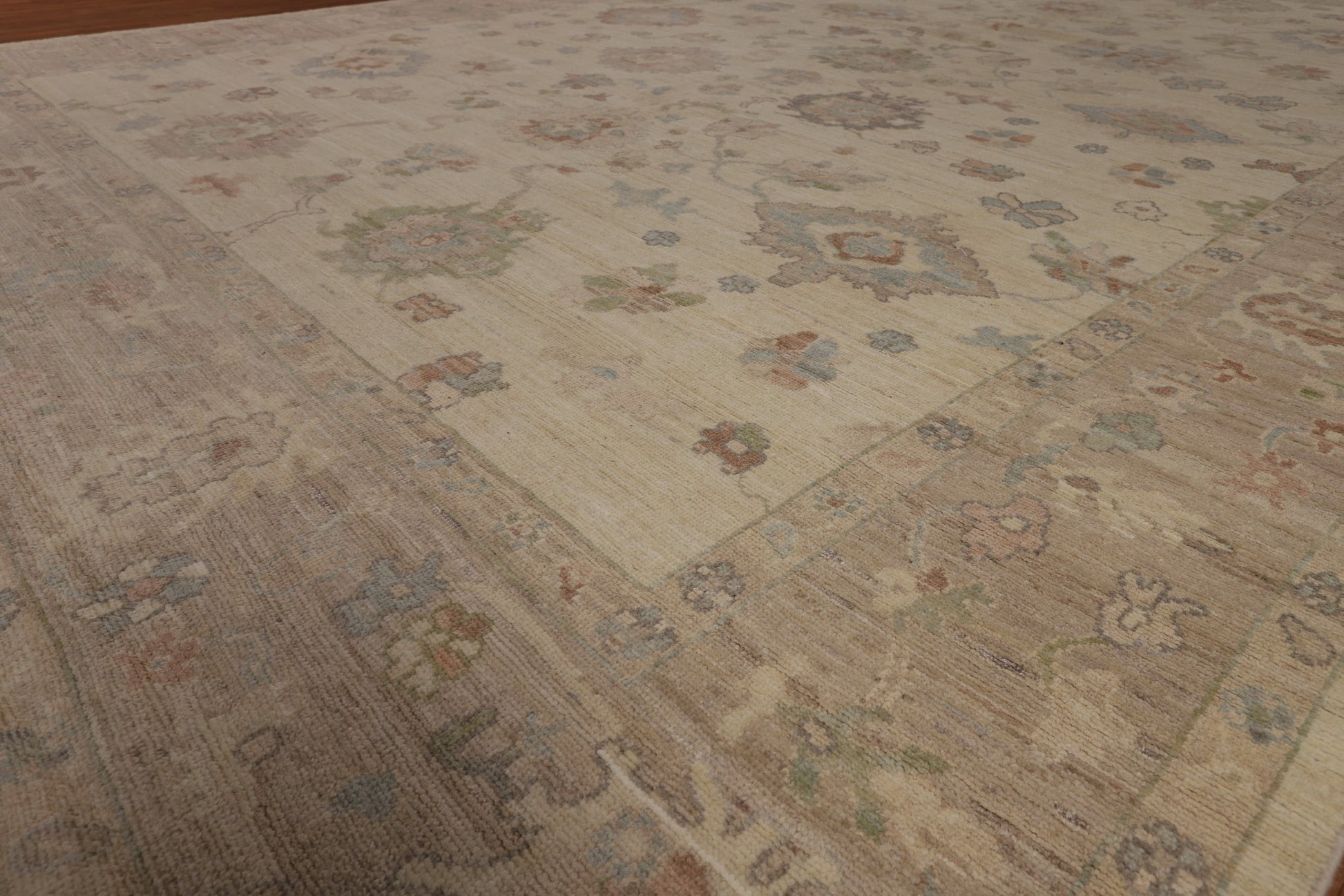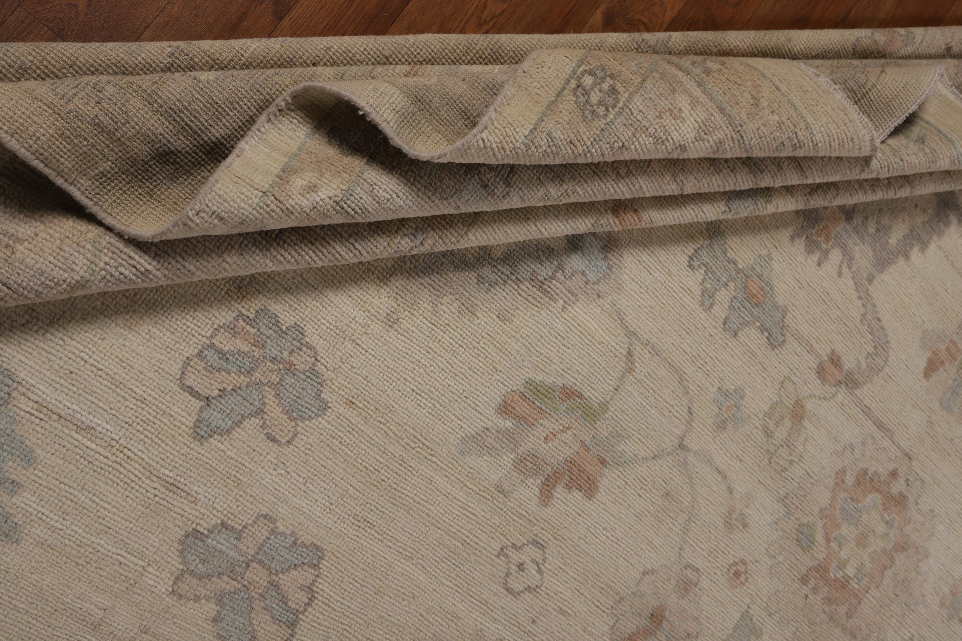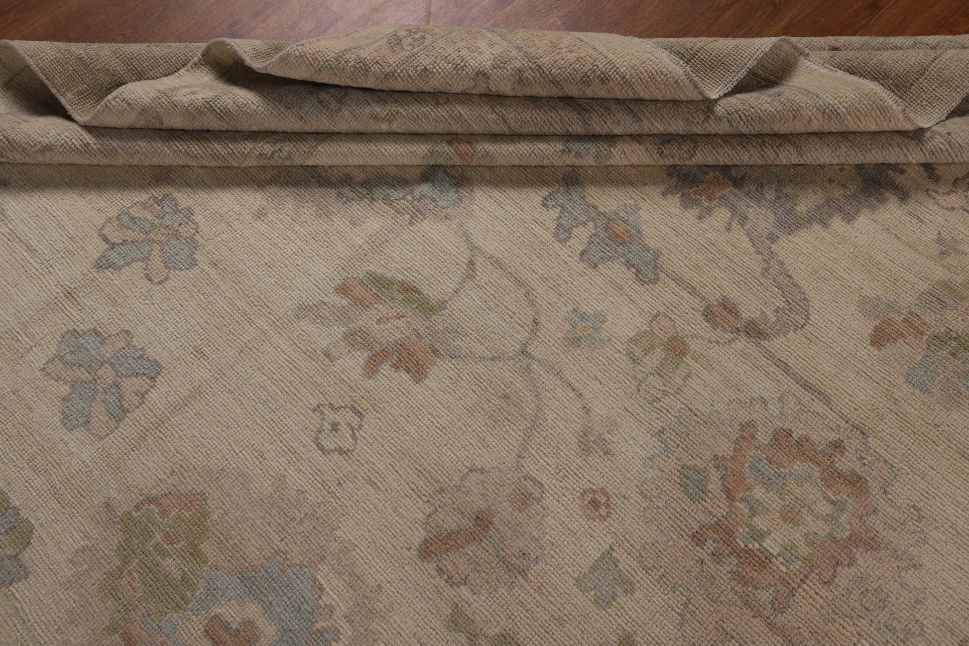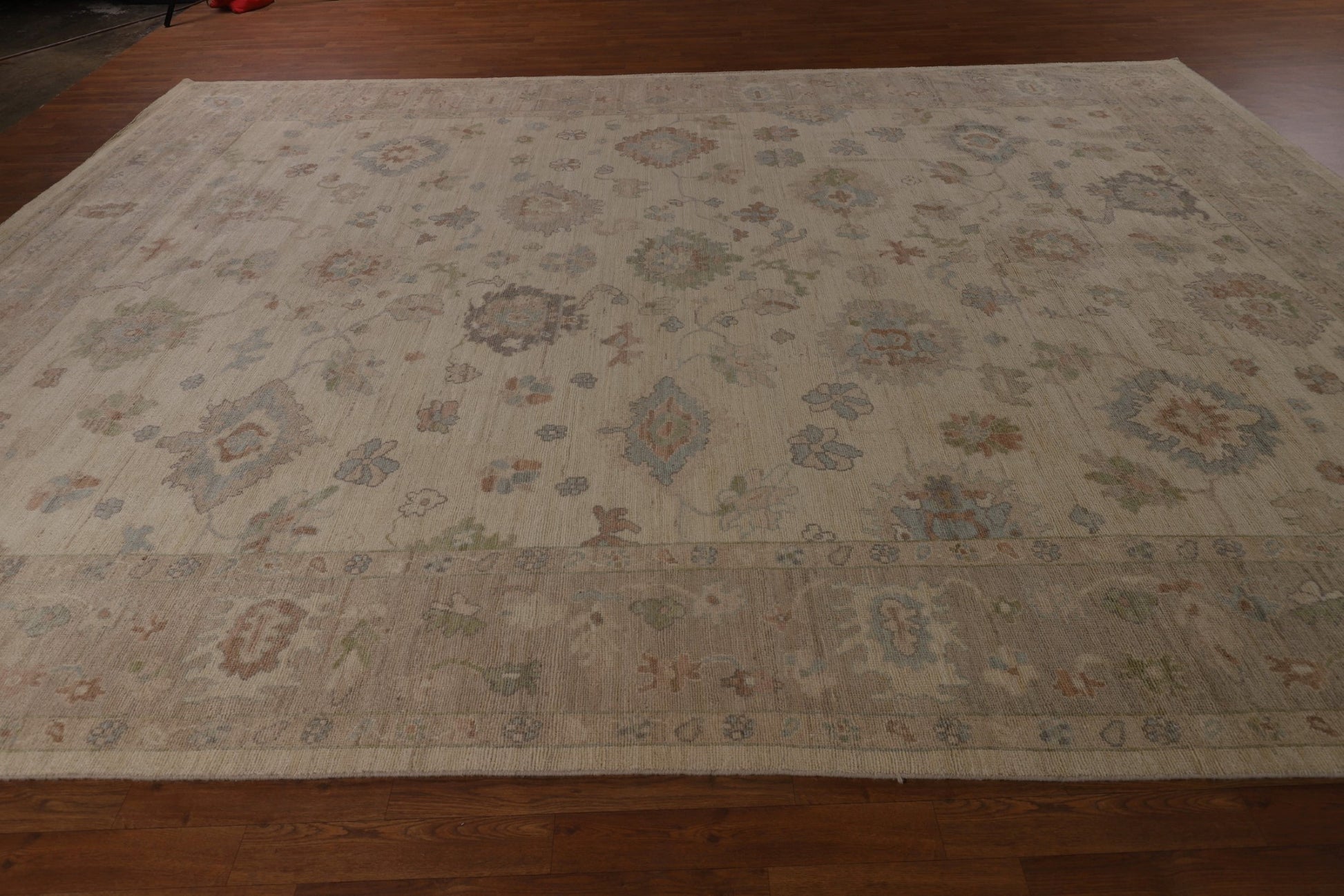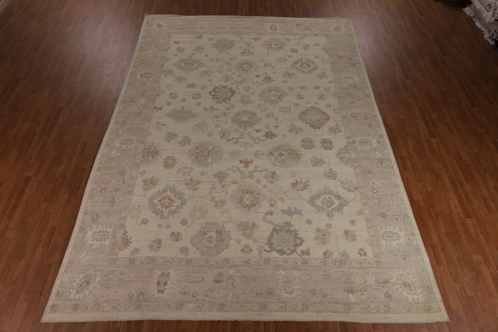 A Beautiful Genuine Turkey Oushak rug is Hand Knotted by skillful weavers in Turkey with 100% Wool Material. This rug is in New, First Quality condition. dimensions are 14' 1'' X 10' 3'' in foot and 429 X 312 in centimeter. the primary color is Beige & Ivories.