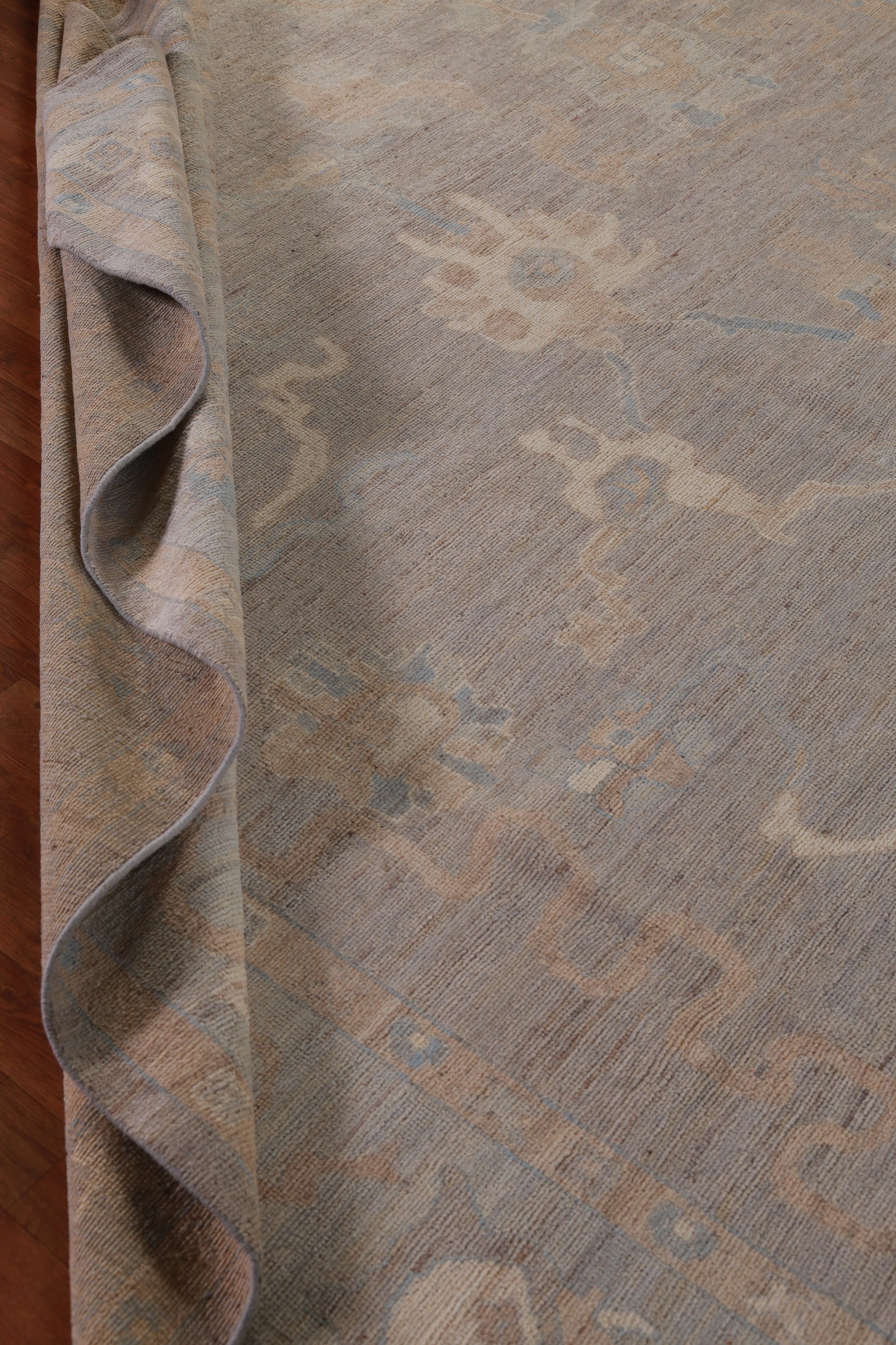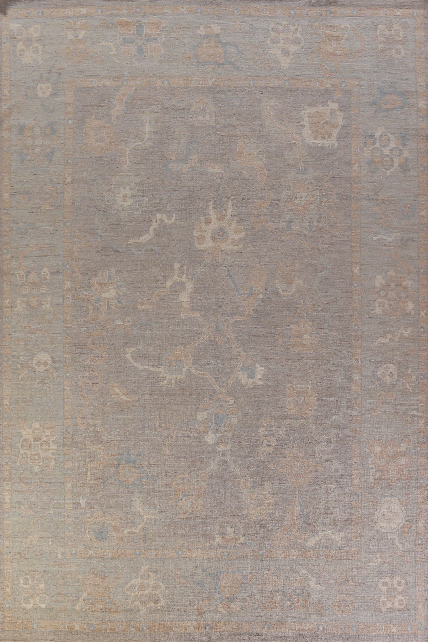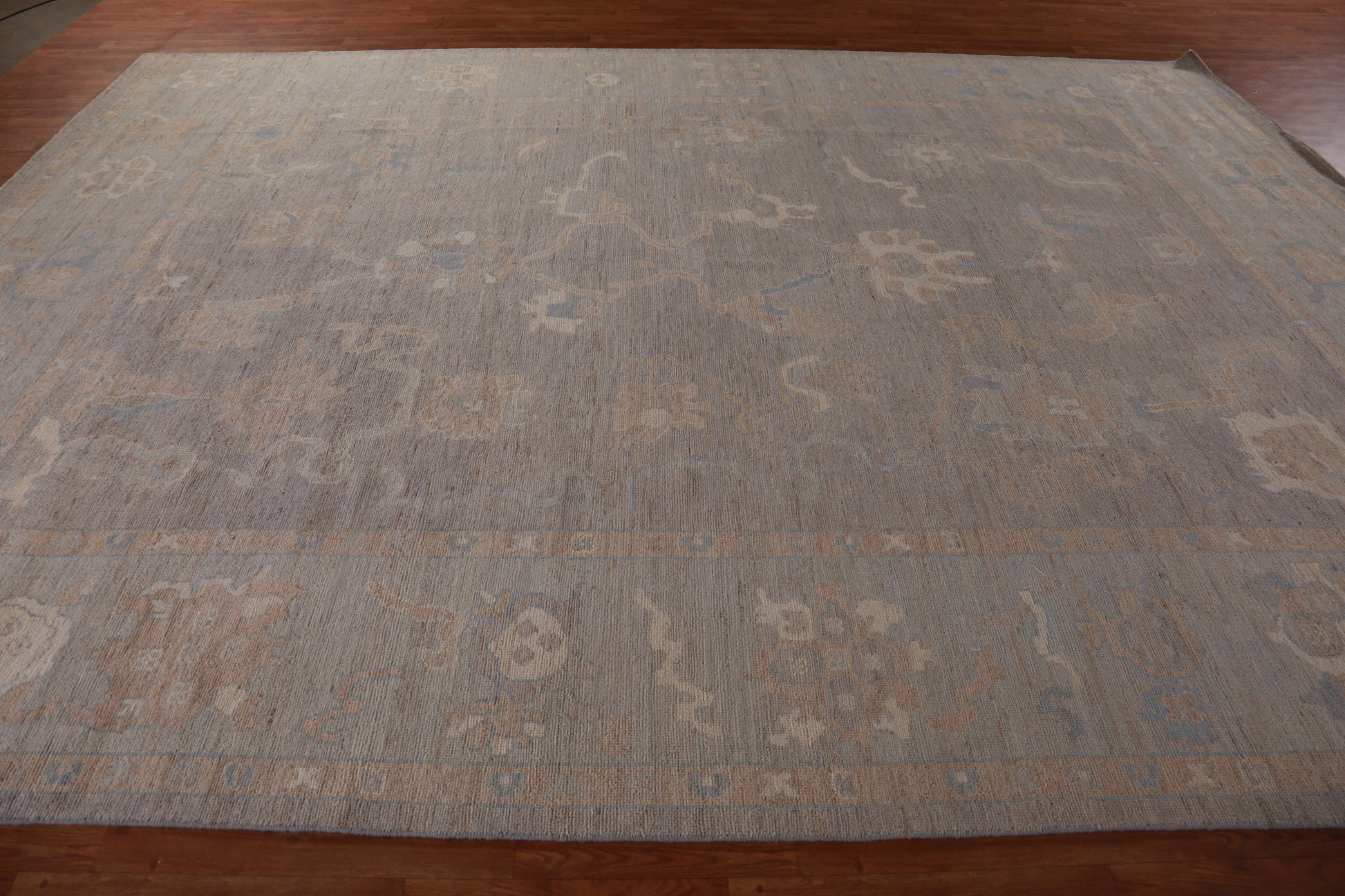 A Beautiful Genuine Turkey Oushak rug is Hand Knotted by skillful weavers in Turkey with 100% Wool Material. This rug is in New, First Quality condition. dimensions are 13' 11'' X 10' 1'' in foot and 424 X 307 in centimeter. the primary color is Greys & Charcoal.