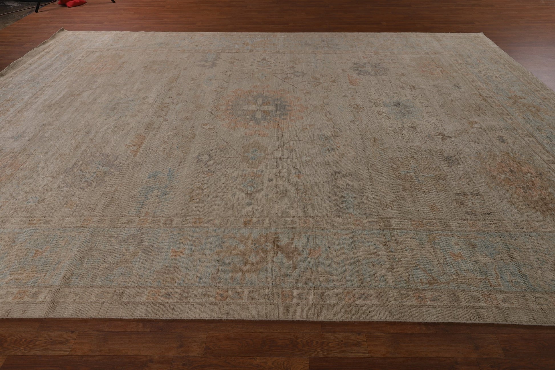 A Beautiful Genuine Turkey Oushak rug is Hand Knotted by skillful weavers in Turkey with 100% Wool Material. This rug is in New, First Quality condition. dimensions are 13' 9'' X 10' 3'' in foot and 419 X 312 in centimeter. the primary color is Beige & Ivories.