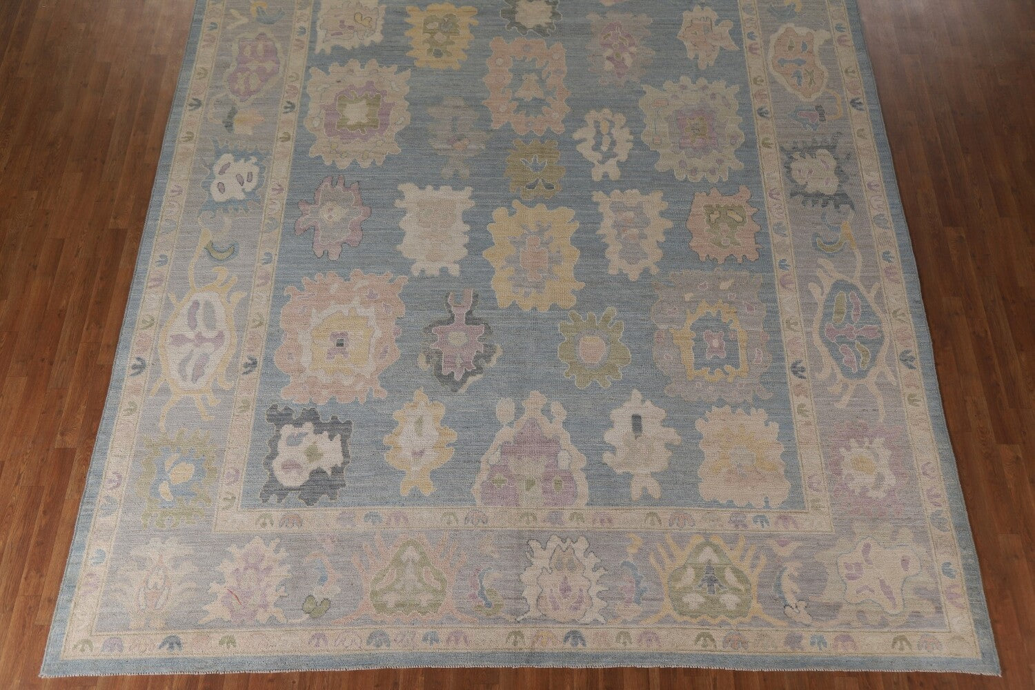 A Beautiful Genuine Turkey Oushak rug is Hand Knotted by skillful weavers in Turkey with 100% Wool Material. This rug is in New, First Quality condition. dimensions are 13' 9'' X 10' 7'' in foot and 419 X 323 in centimeter. the primary color is Navy Blue & Blues.
