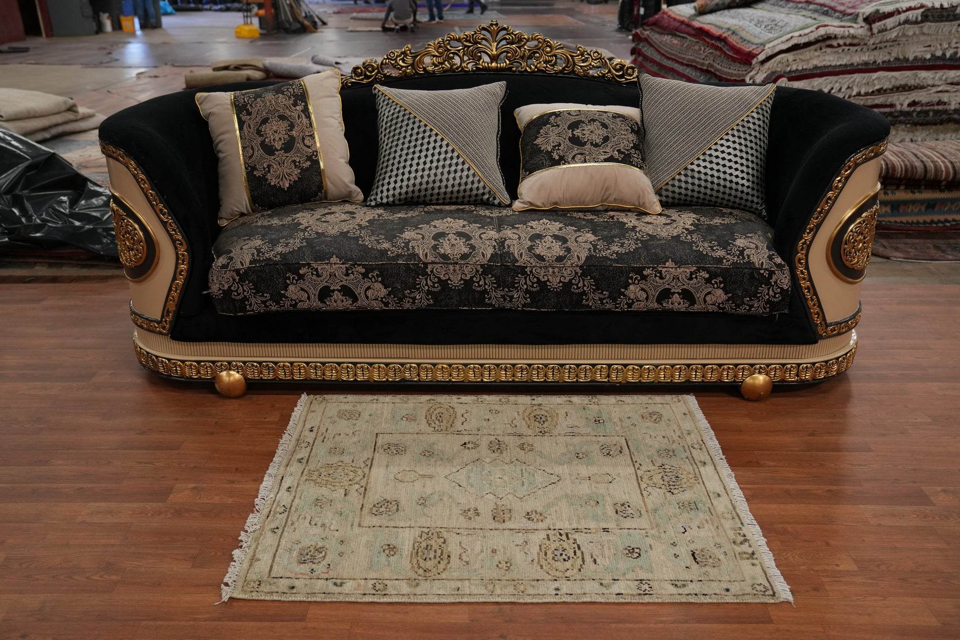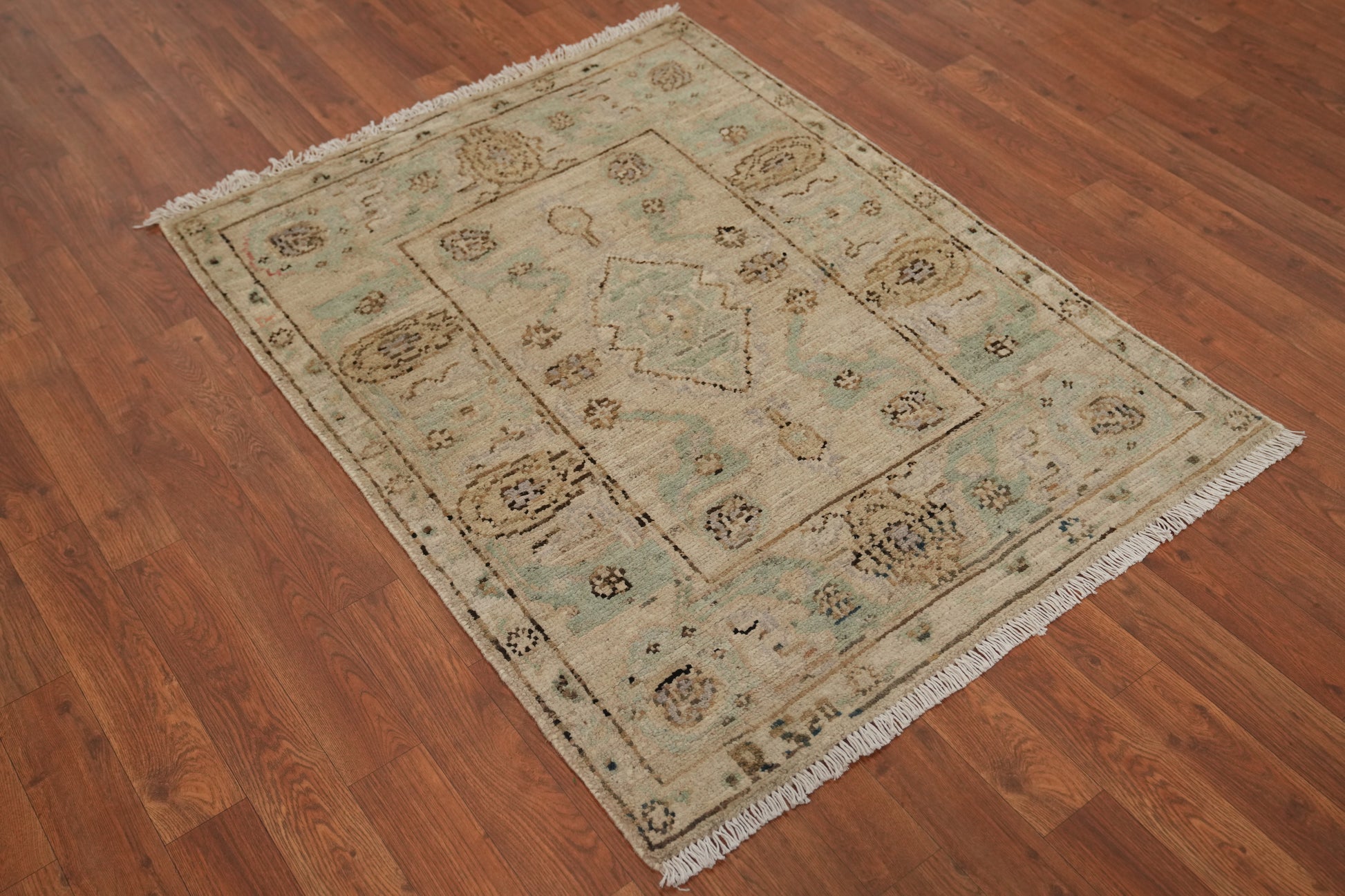 A Beautiful Genuine Turkey Oushak rug is Hand Knotted by skillful weavers in Turkey with 100% Wool Material. This rug is in New, First Quality condition. dimensions are 4' 0'' X 3' 1'' in foot and 122 X 94 in centimeter. the primary color is Beige & Ivories.