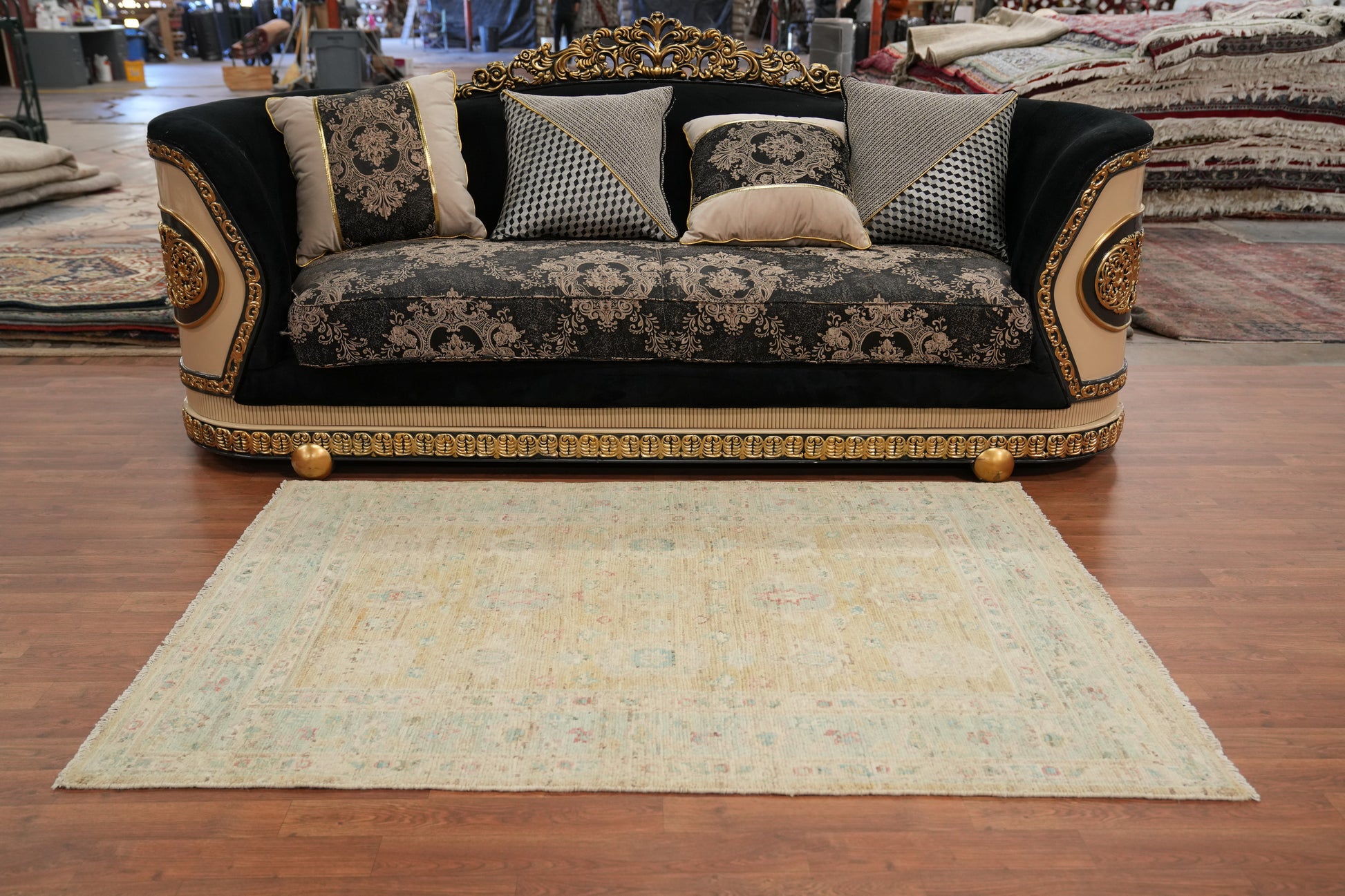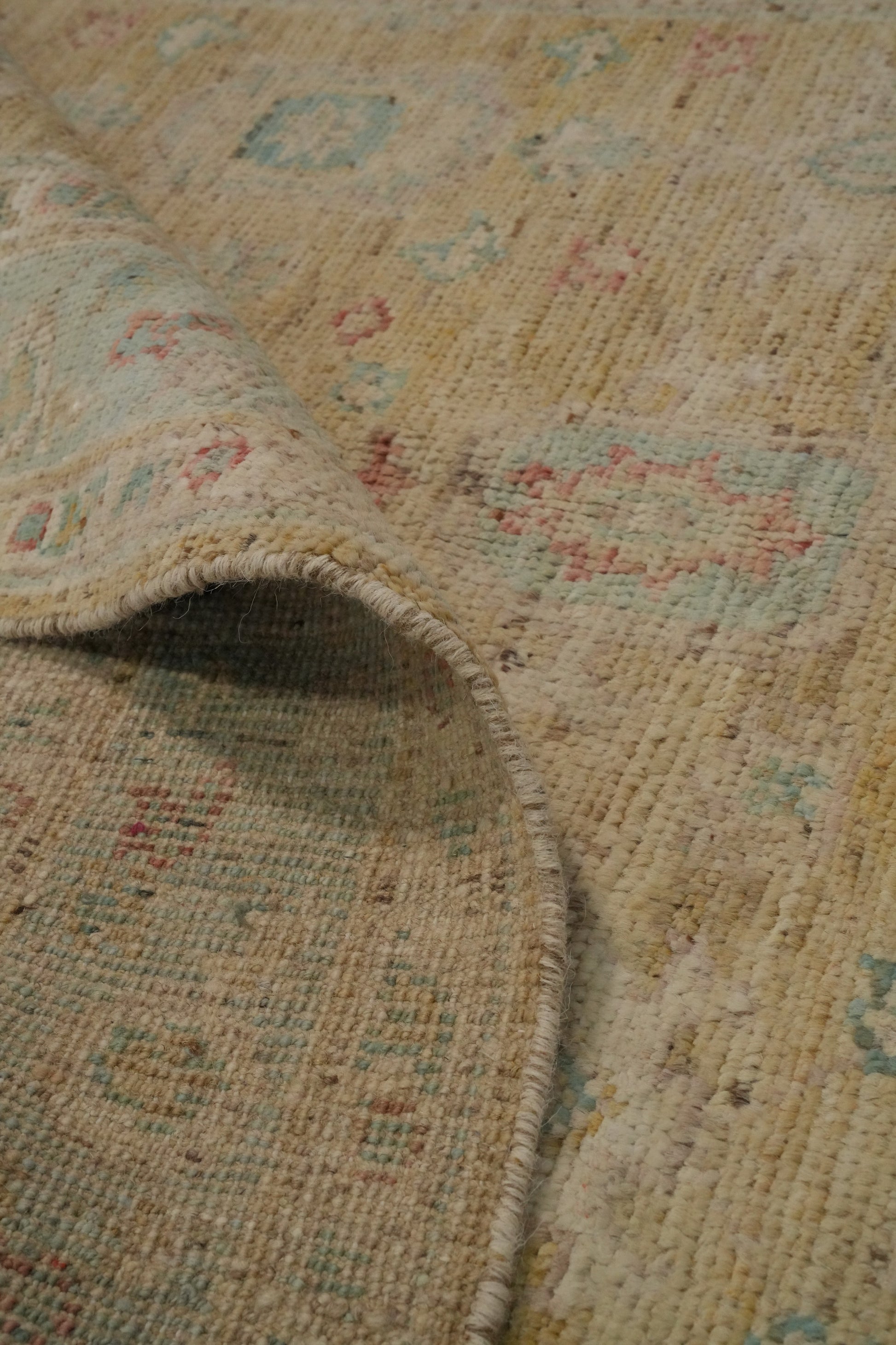 A Beautiful Genuine Turkey Oushak rug is Hand Knotted by skillful weavers in Turkey with 100% Wool Material. This rug is in New, First Quality condition. dimensions are 5' 11'' X 4' 0'' in foot and 180 X 122 in centimeter. the primary color is Yellow & Gold.