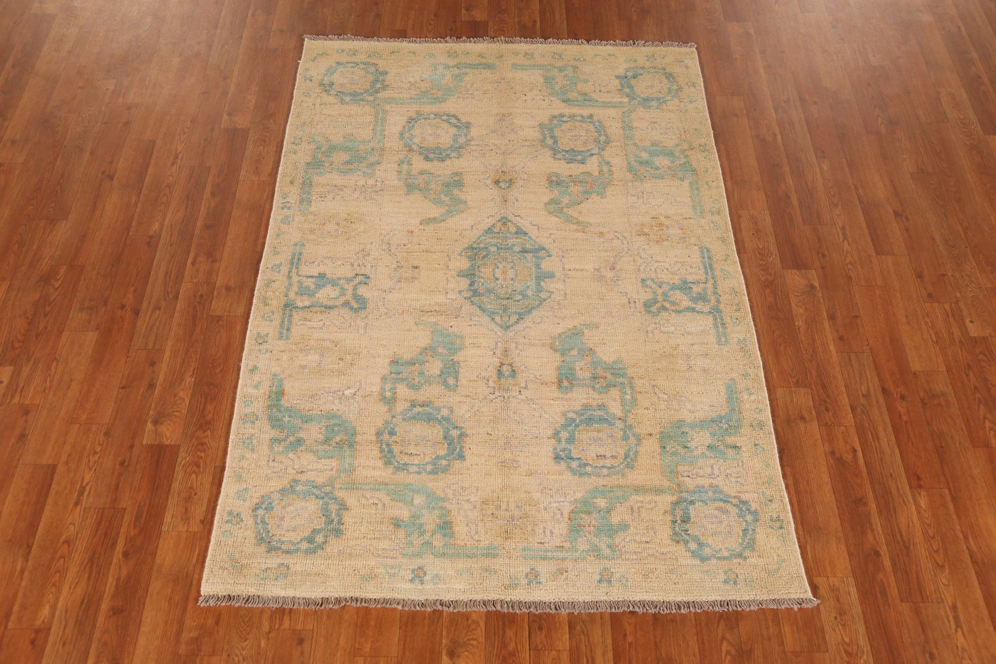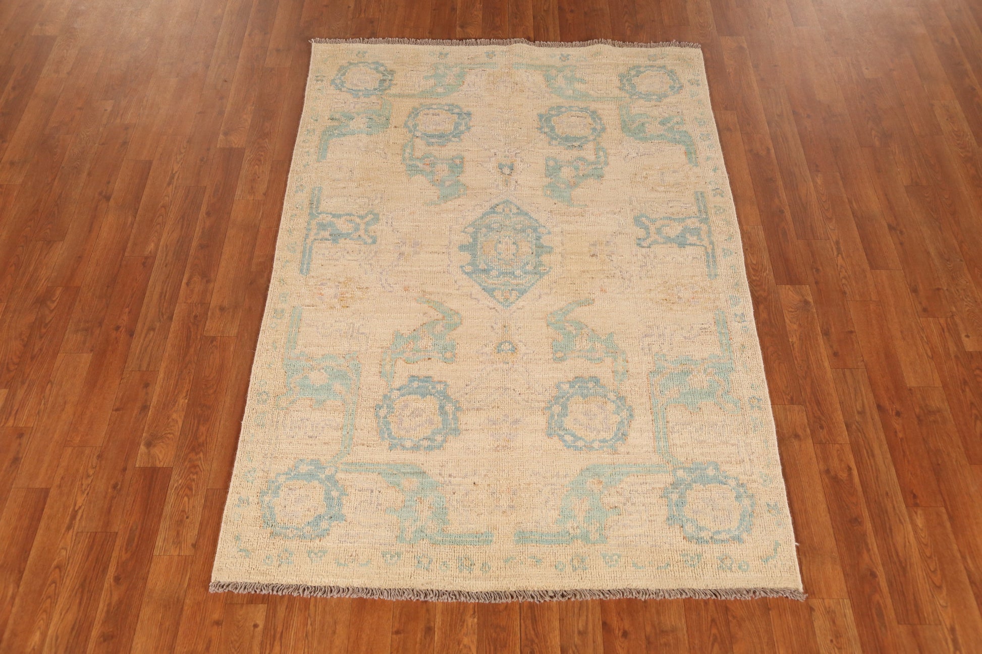 A Beautiful Genuine Turkey Oushak rug is Hand Knotted by skillful weavers in Turkey with 100% Wool Material. This rug is in New, First Quality condition. dimensions are 5' 8'' X 4' 0'' in foot and 173 X 122 in centimeter. the primary color is Beige & Ivories.