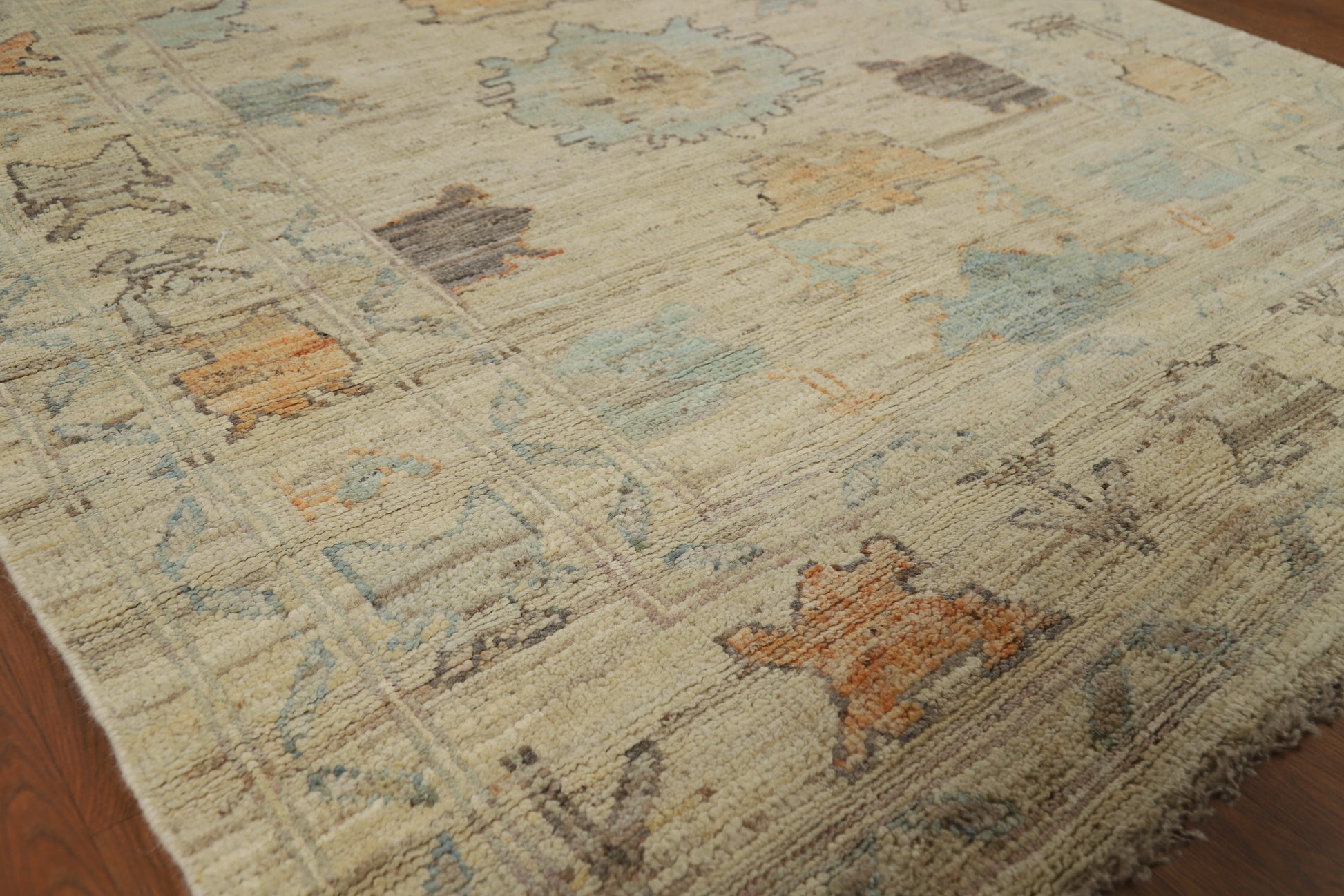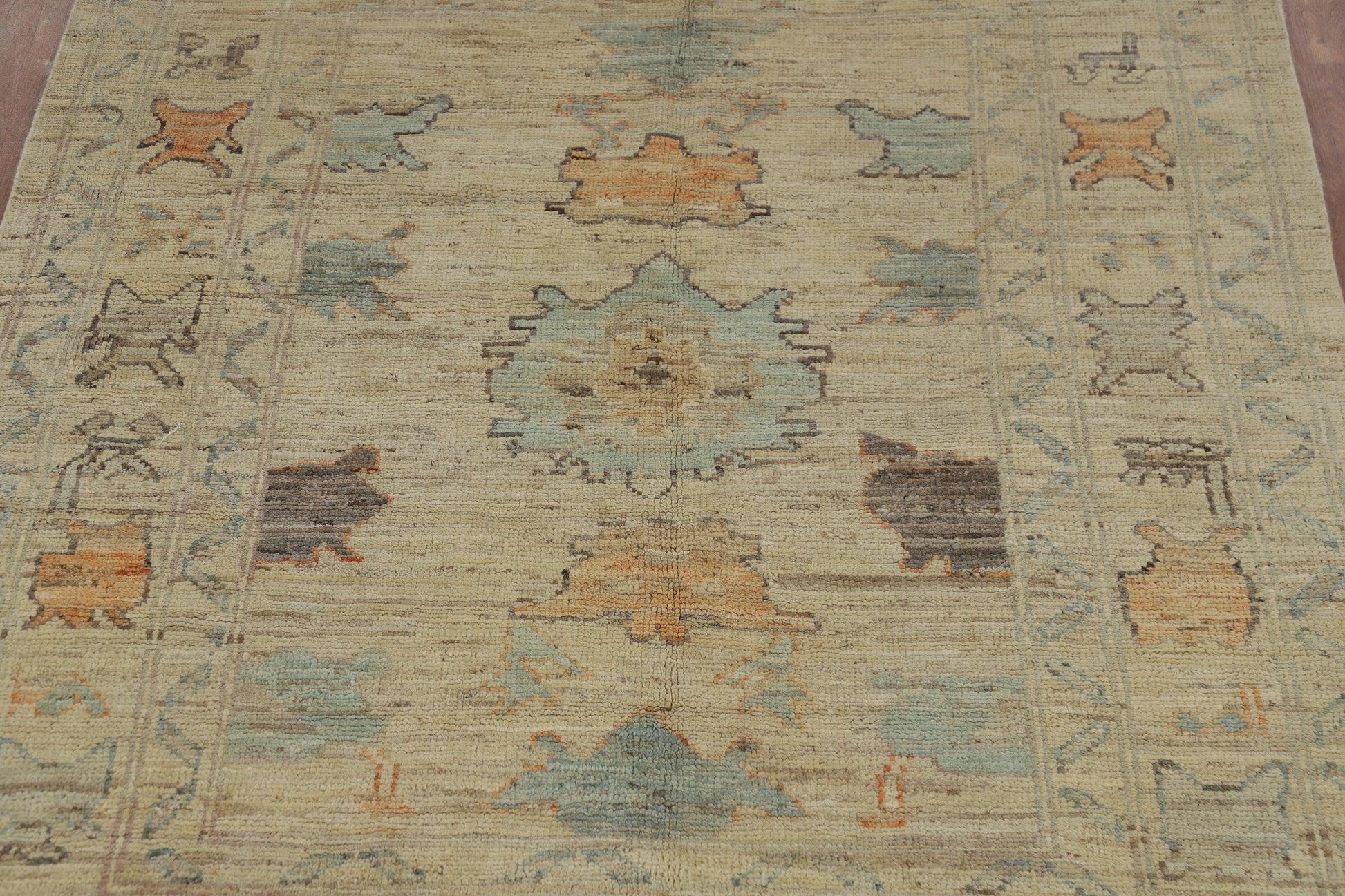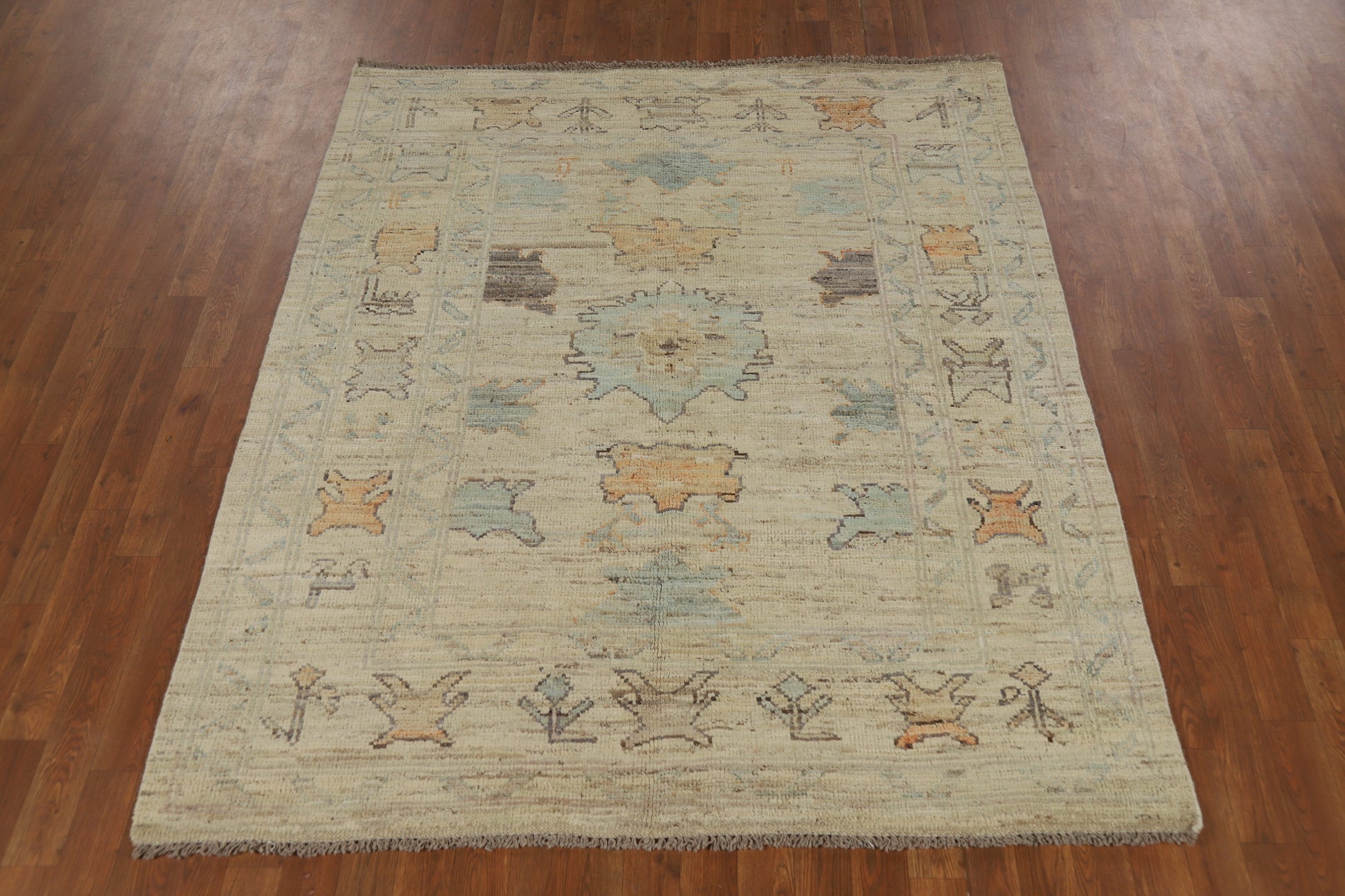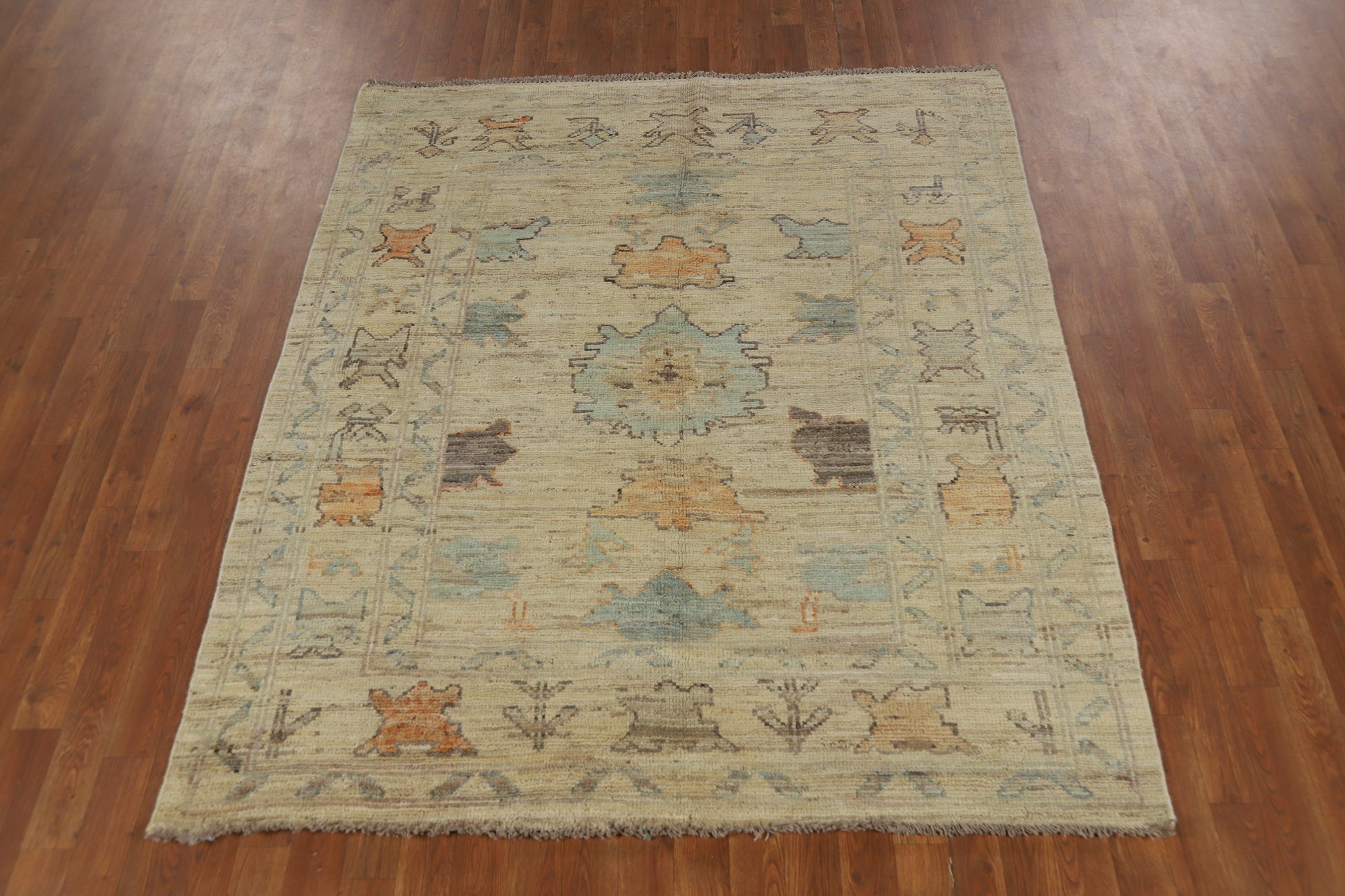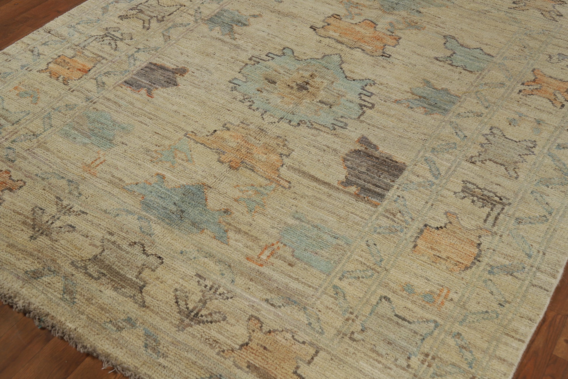 A Beautiful Genuine Turkey Oushak rug is Hand Knotted by skillful weavers in Turkey with 100% Wool Material. This rug is in New, First Quality condition. dimensions are 6' 4'' X 5' 3'' in foot and 193 X 160 in centimeter. the primary color is Yellow & Gold.