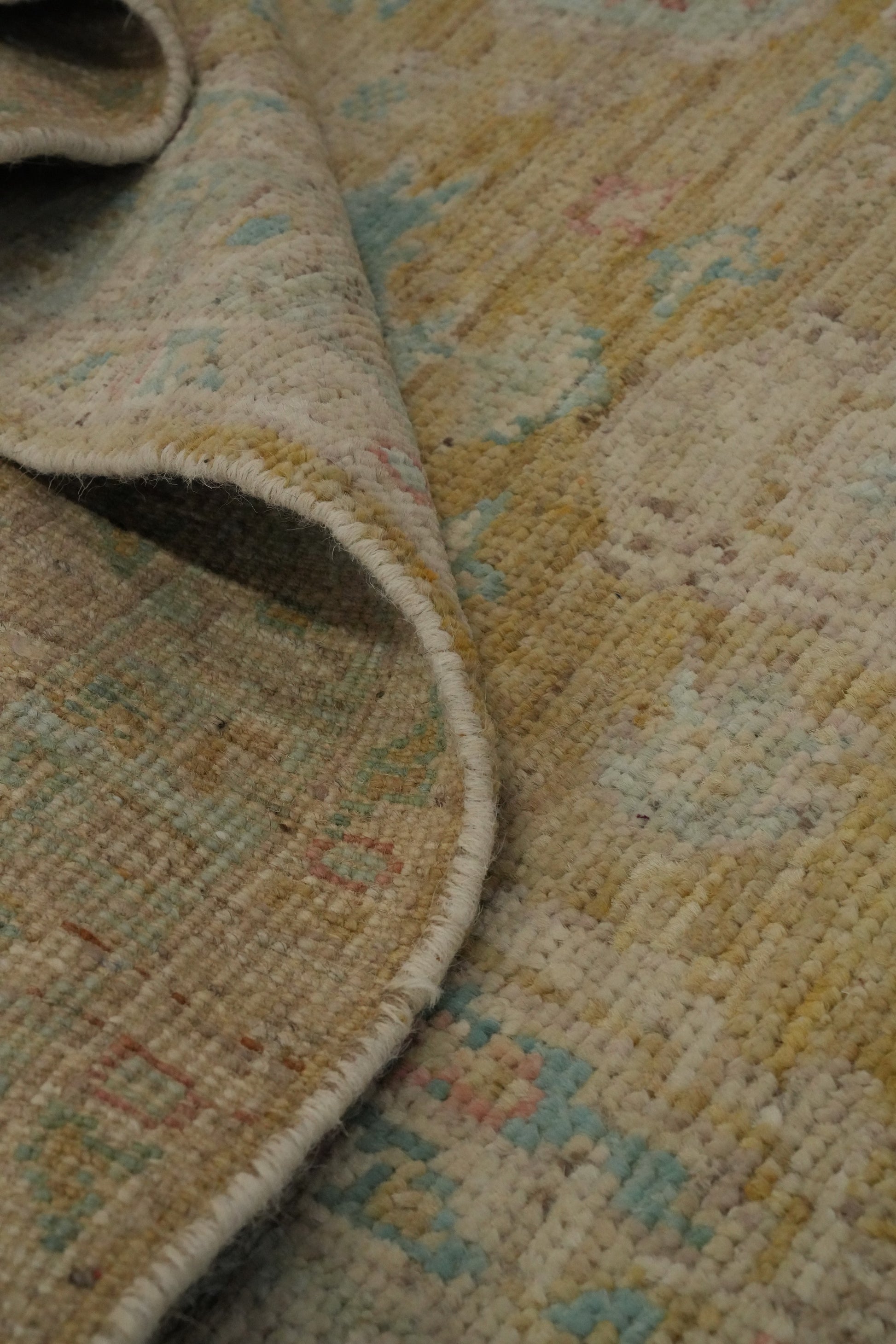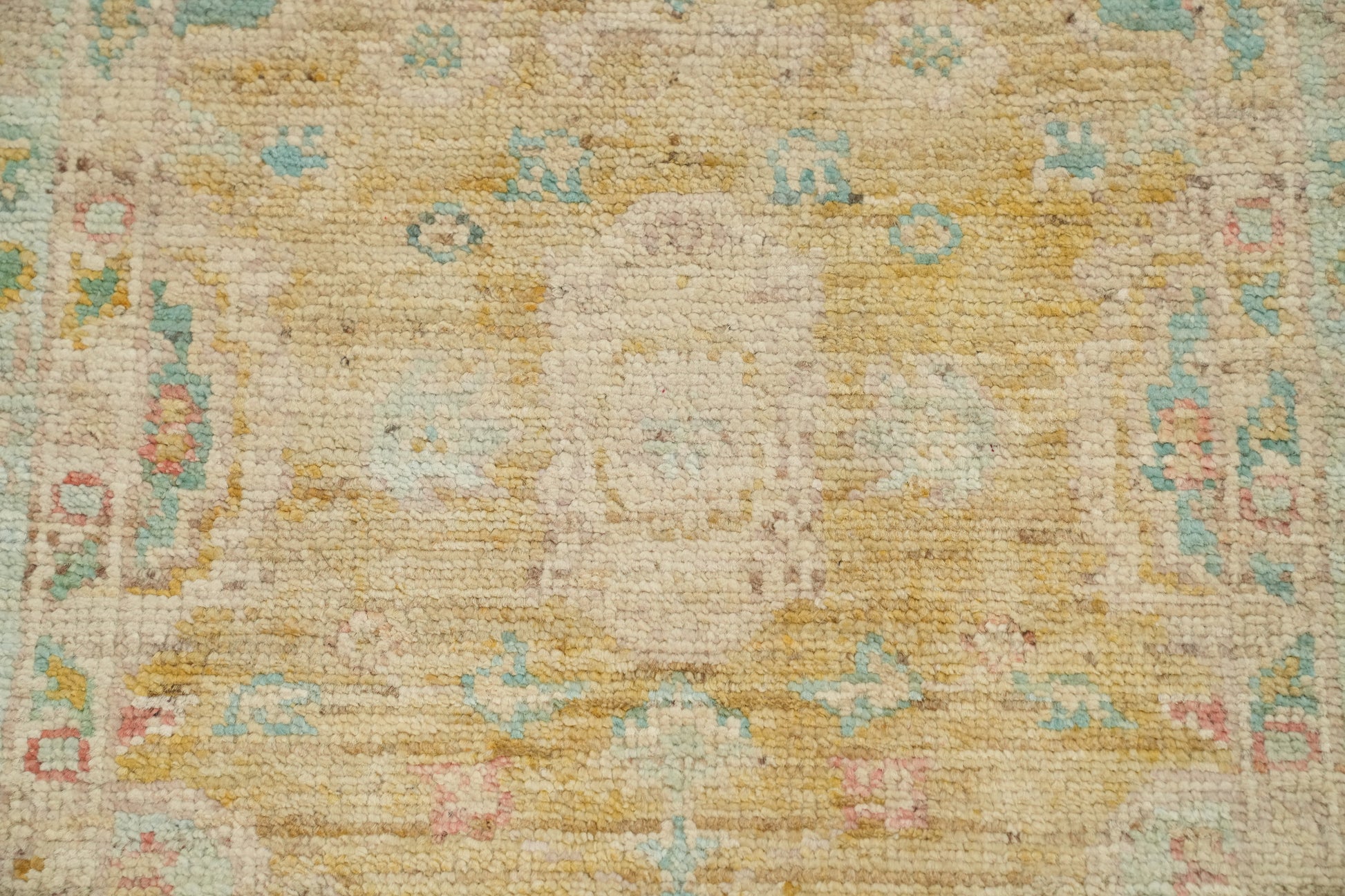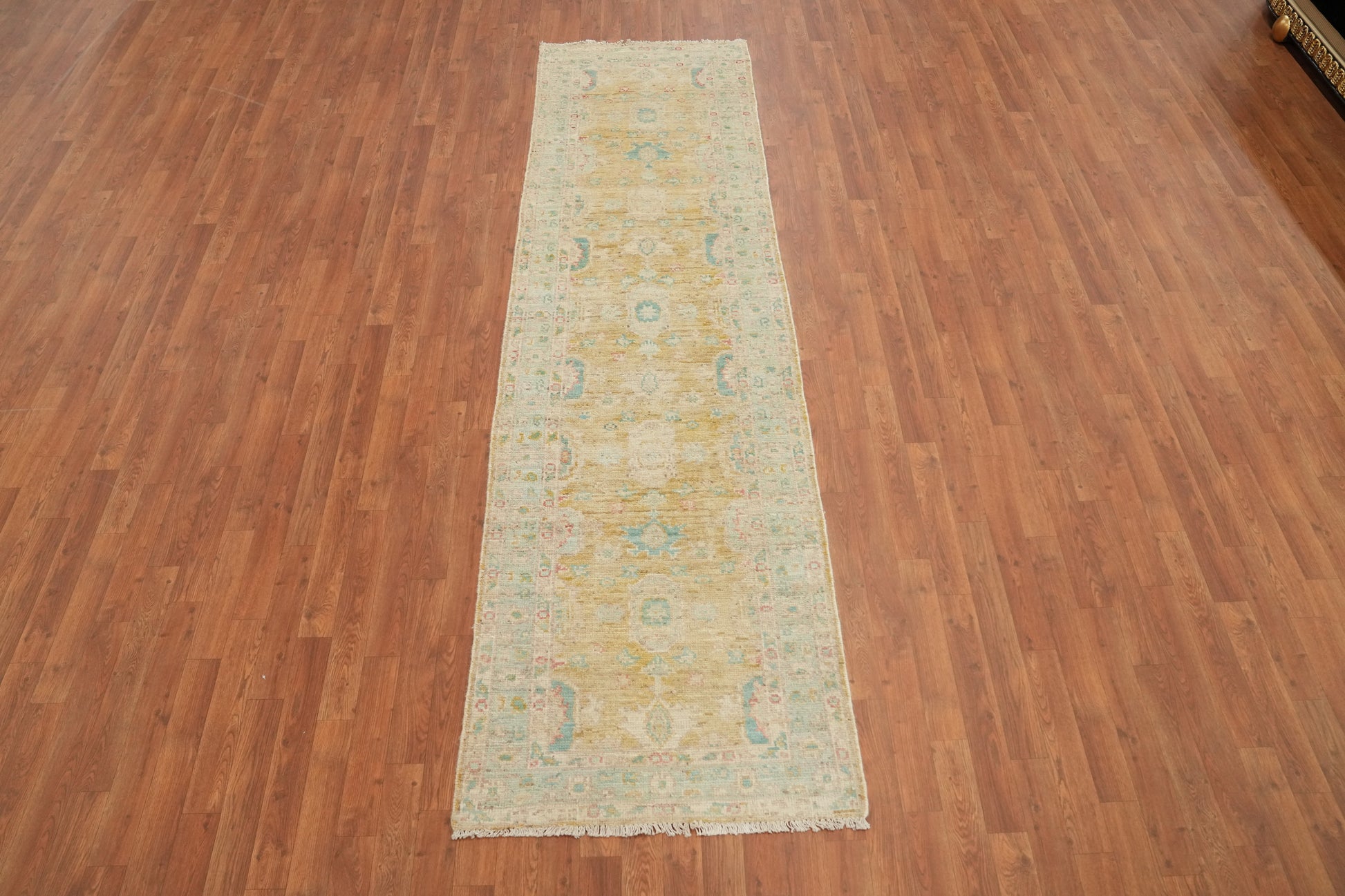 A Beautiful Genuine Turkey Oushak rug is Hand Knotted by skillful weavers in Turkey with 100% Wool Material. This rug is in New, First Quality condition. dimensions are 9' 8'' X 2' 9'' in foot and 295 X 84 in centimeter. the primary color is Yellow & Gold.