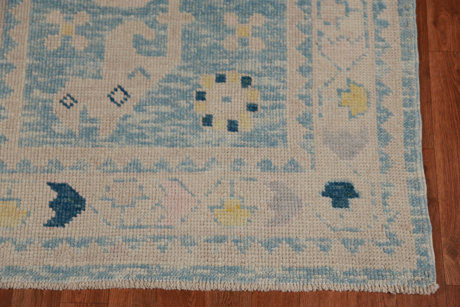 A Beautiful Genuine Turkey Oushak rug is Hand Knotted by skillful weavers in Turkey with 100% Wool Material. This rug is in New, First Quality condition. dimensions are 14' 0'' X 3' 4'' in foot and 427 X 102 in centimeter. the primary color is Navy Blue & Blues.
