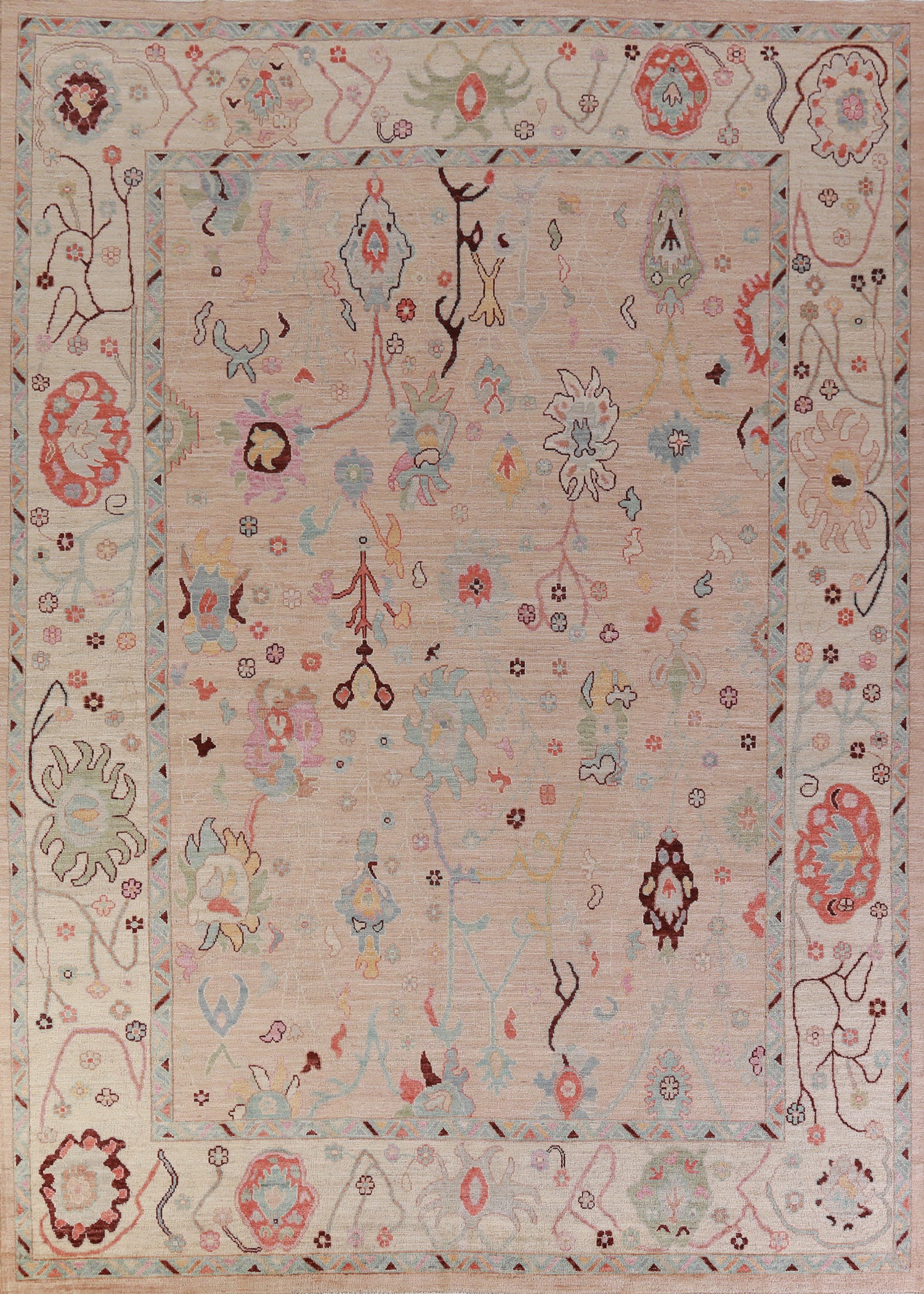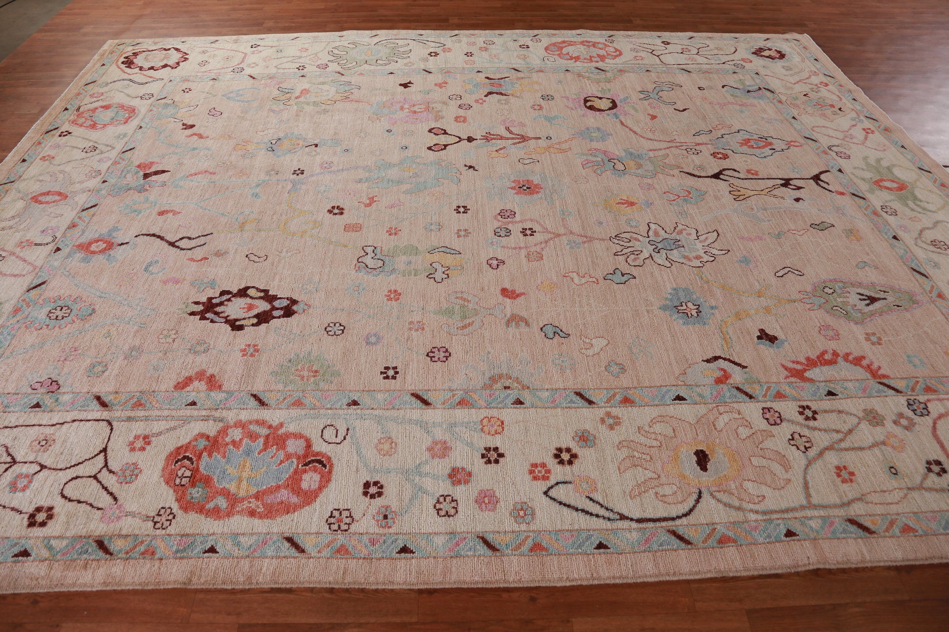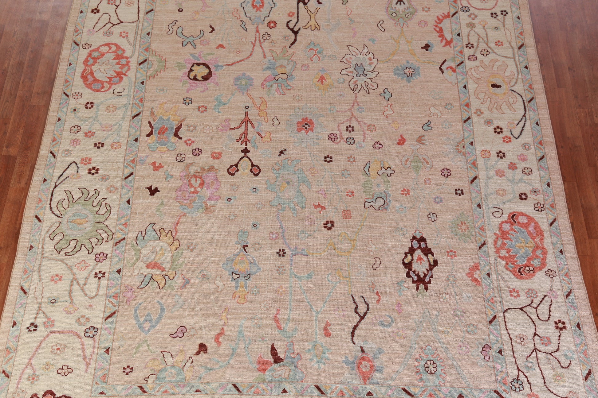 A Beautiful Genuine Turkey Oushak rug is Hand Knotted by skillful weavers in Turkey with 100% Wool Material. This rug is in New, First Quality condition. dimensions are 12' 0'' X 9' 4'' in foot and 366 X 284 in centimeter. the primary color is Peach.