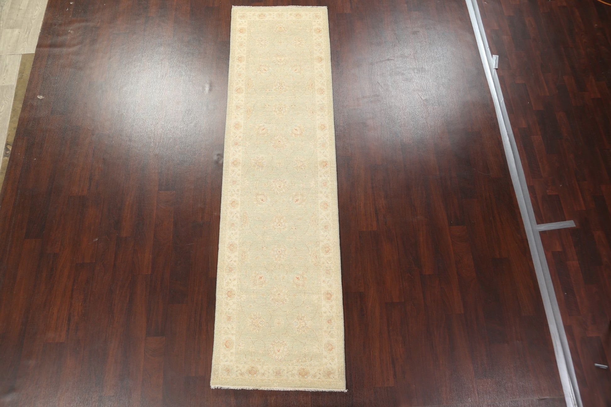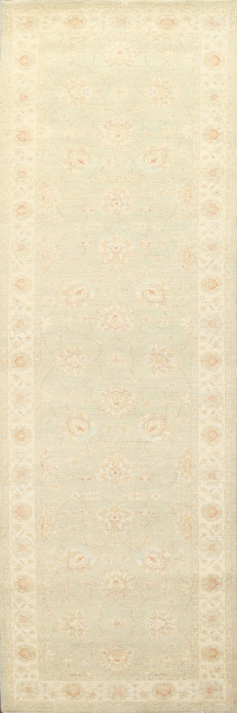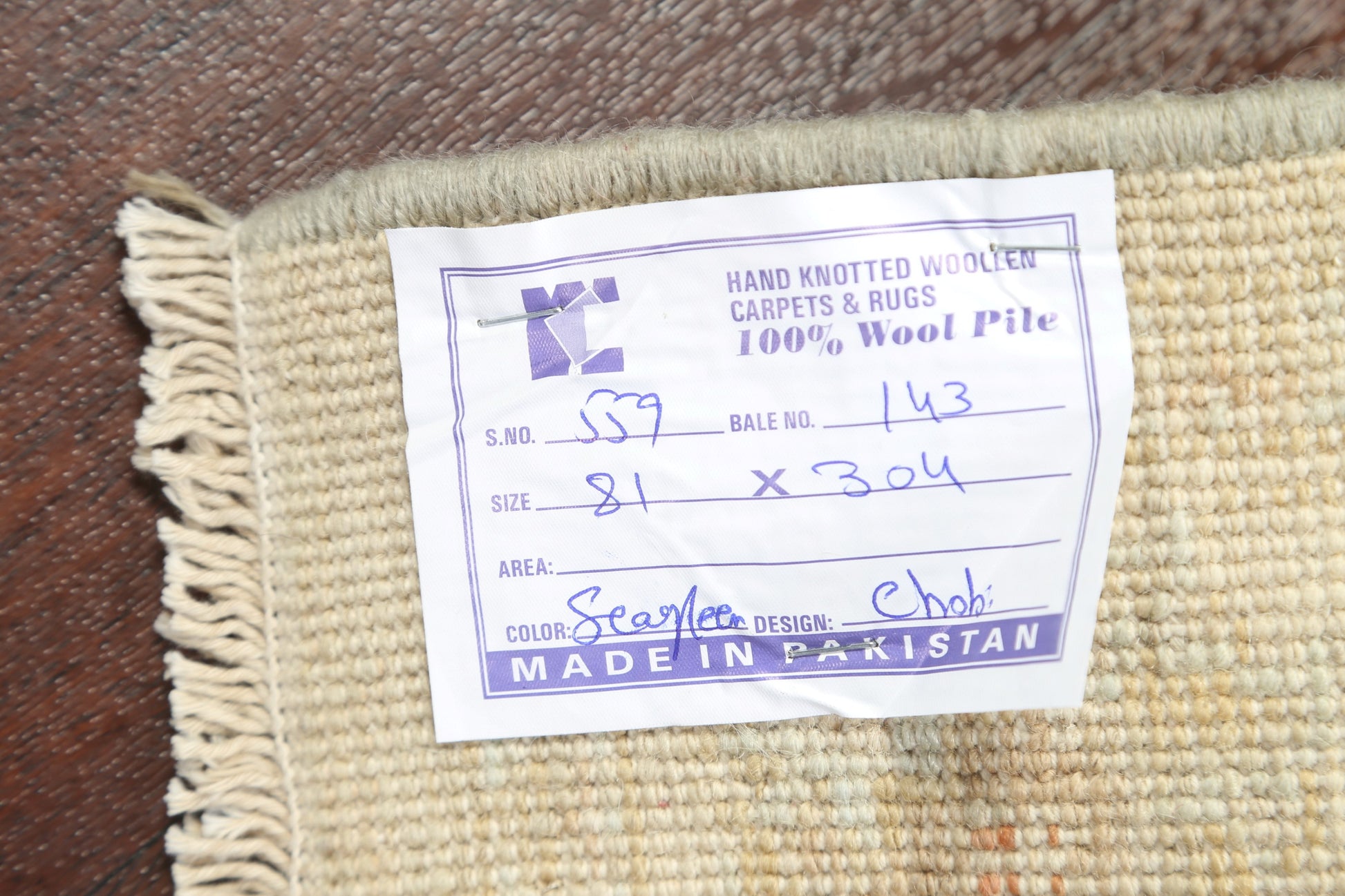 A Beautiful Genuine Pakistan Peshawar-Chobi rug is Hand Knotted by skillful weavers in Pakistan with 100% Wool Material. This rug is in New, First Quality condition. dimensions are 10' 0'' X 2' 8'' in foot and 305 X 81 in centimeter. the primary color is Green.