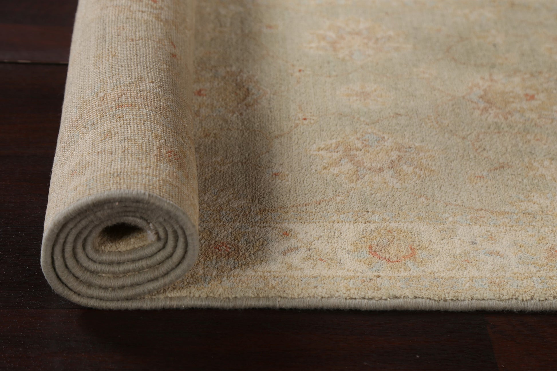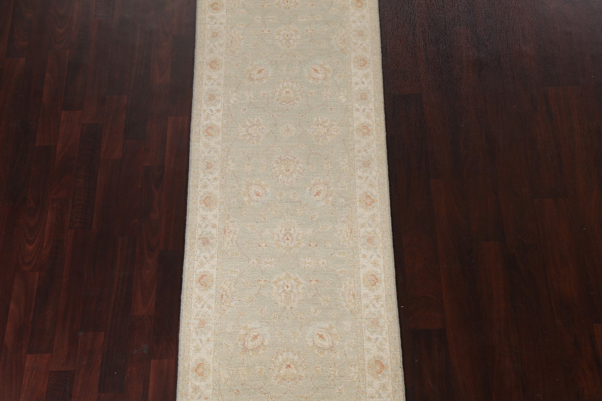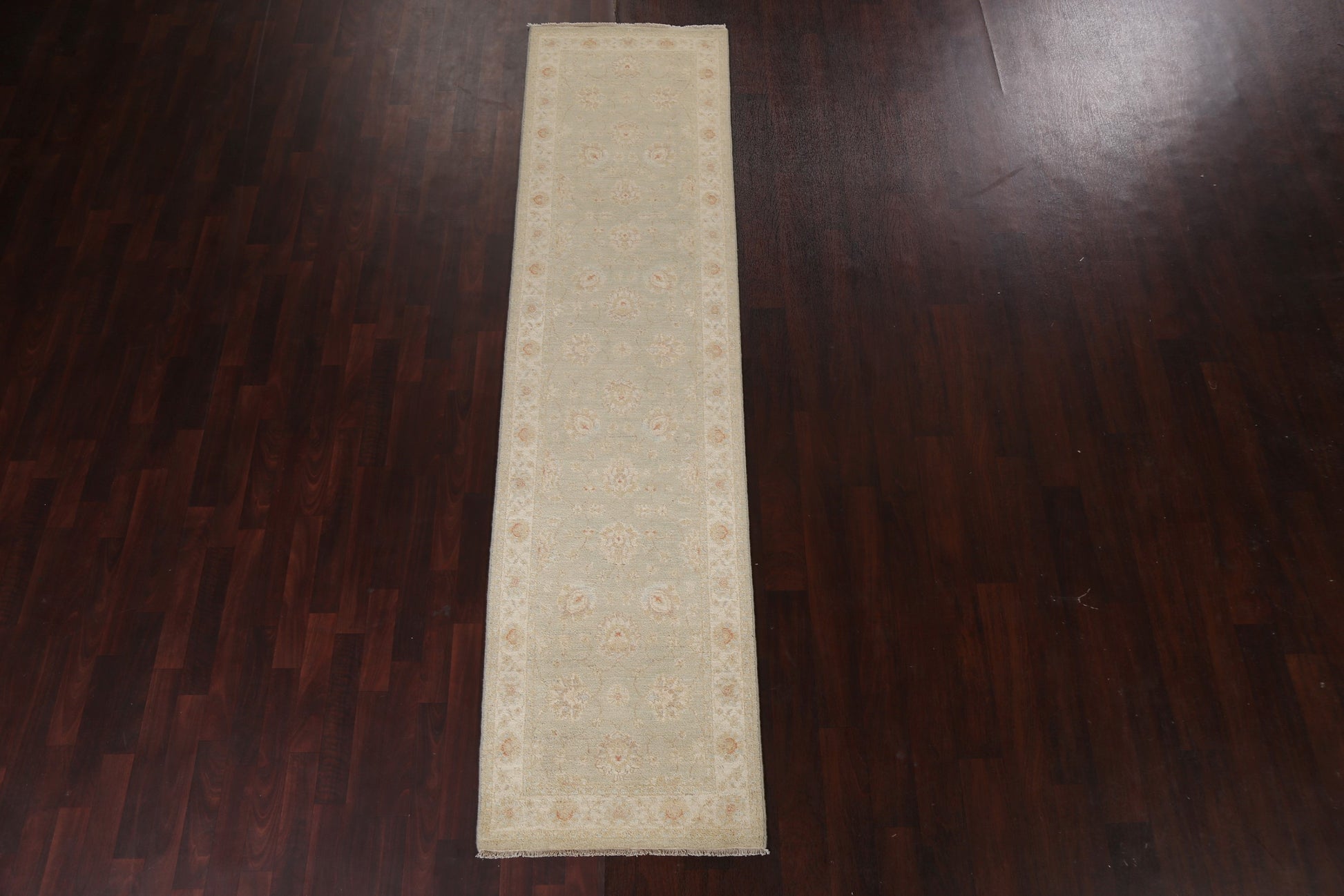A Beautiful Genuine Pakistan Peshawar-Chobi rug is Hand Knotted by skillful weavers in Pakistan with 100% Wool Material. This rug is in New, First Quality condition. dimensions are 10' 1'' X 2' 7'' in foot and 307 X 79 in centimeter. the primary color is Green.