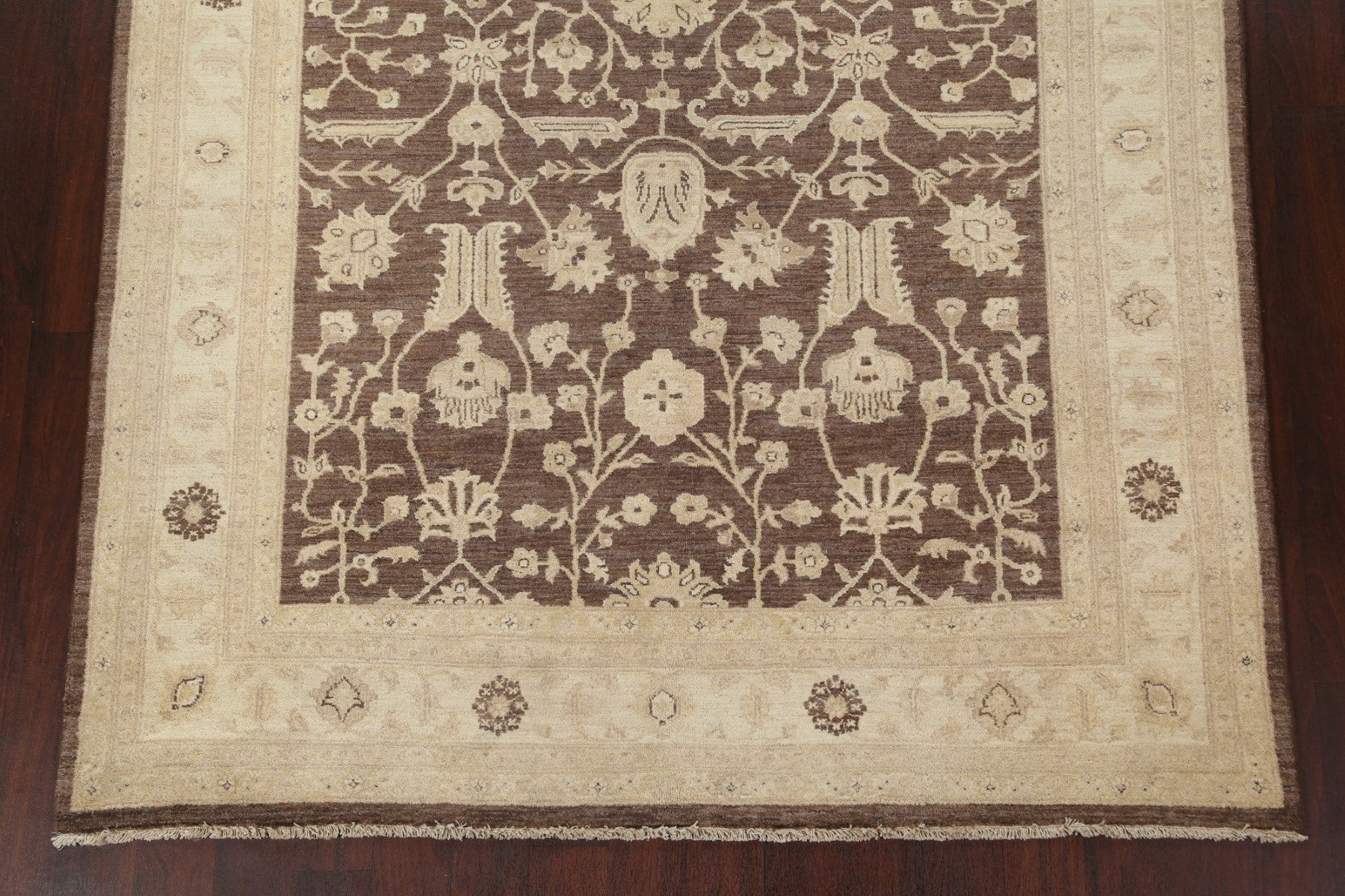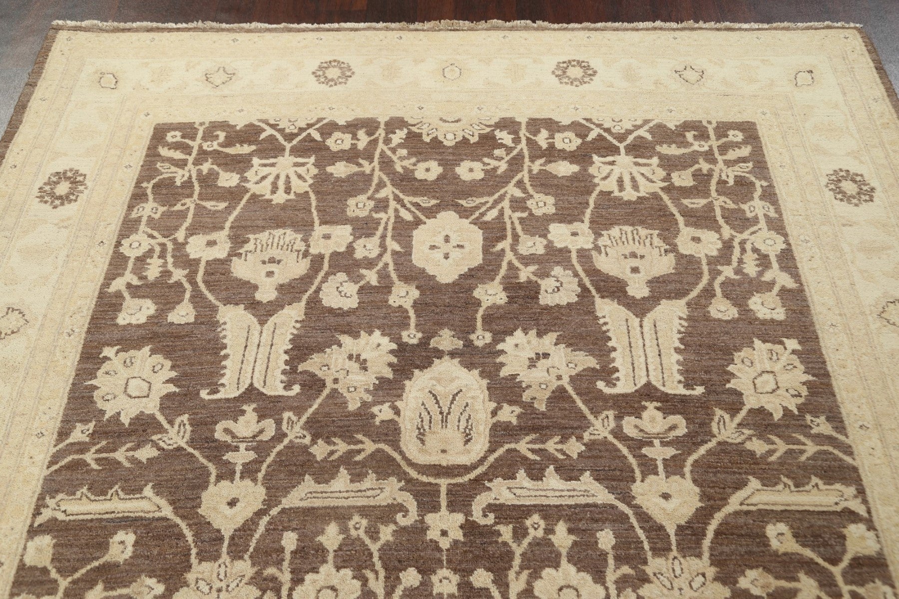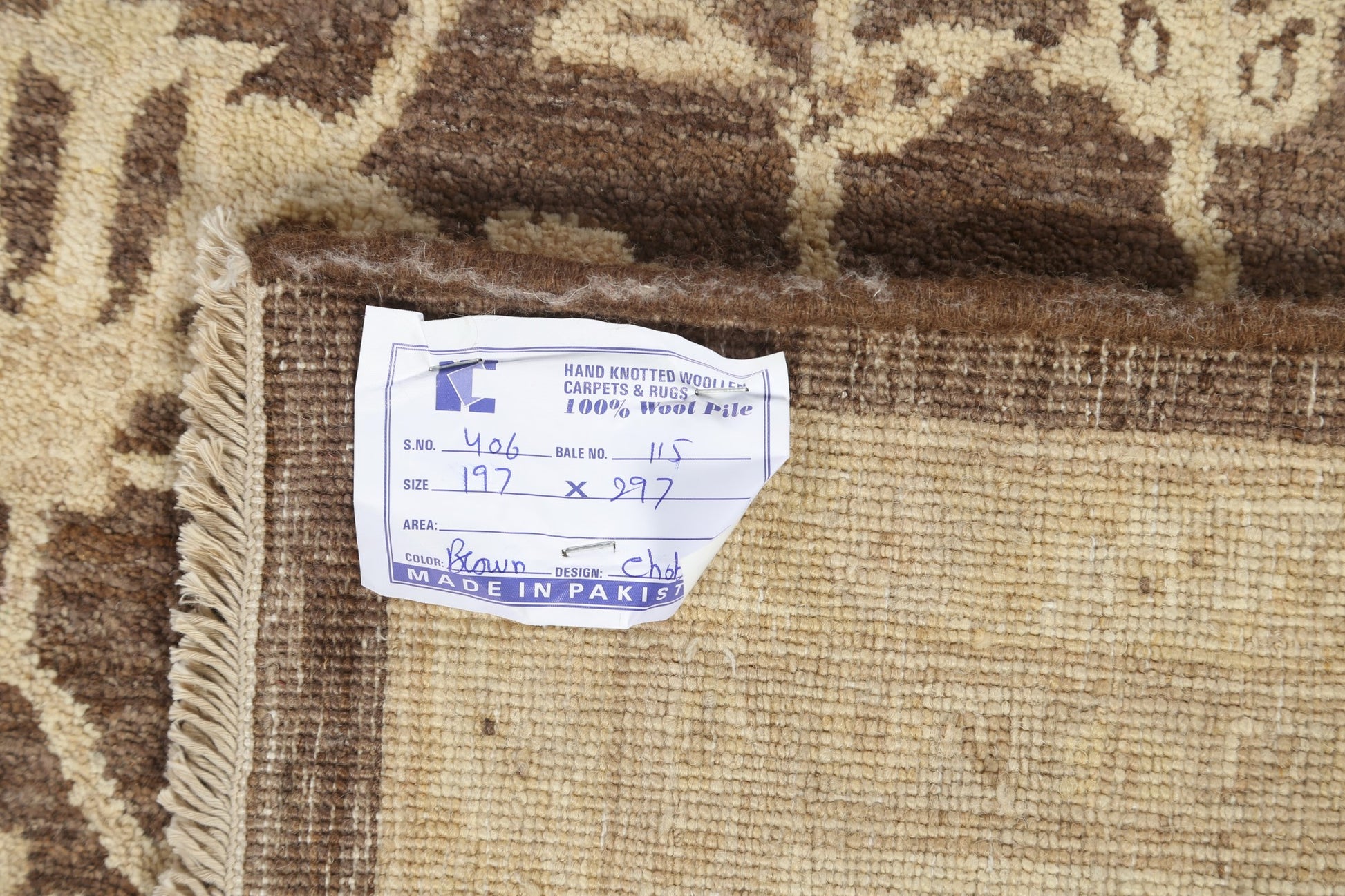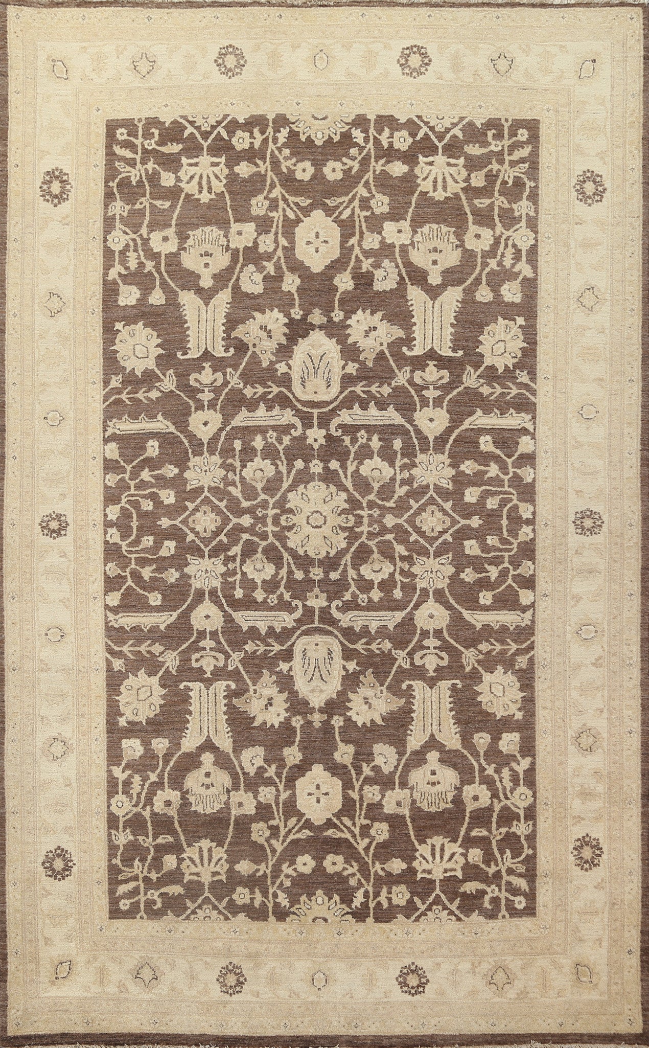 A Beautiful Genuine Pakistan Peshawar-Chobi rug is Hand Knotted by skillful weavers in Pakistan with 100% Wool Material. This rug is in New, First Quality condition. dimensions are 9' 9'' X 6' 6'' in foot and 297 X 198 in centimeter. the primary color is Brown.