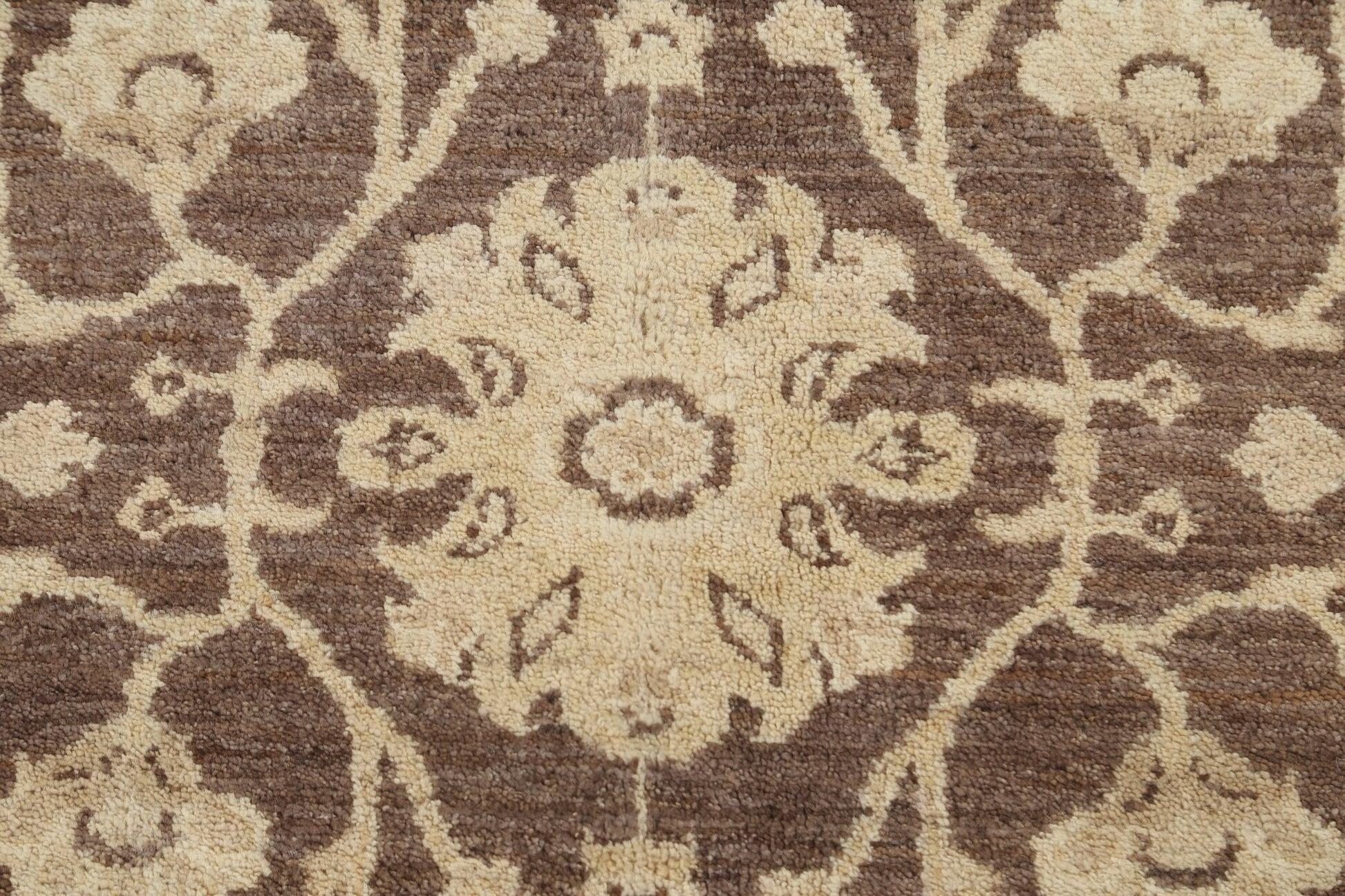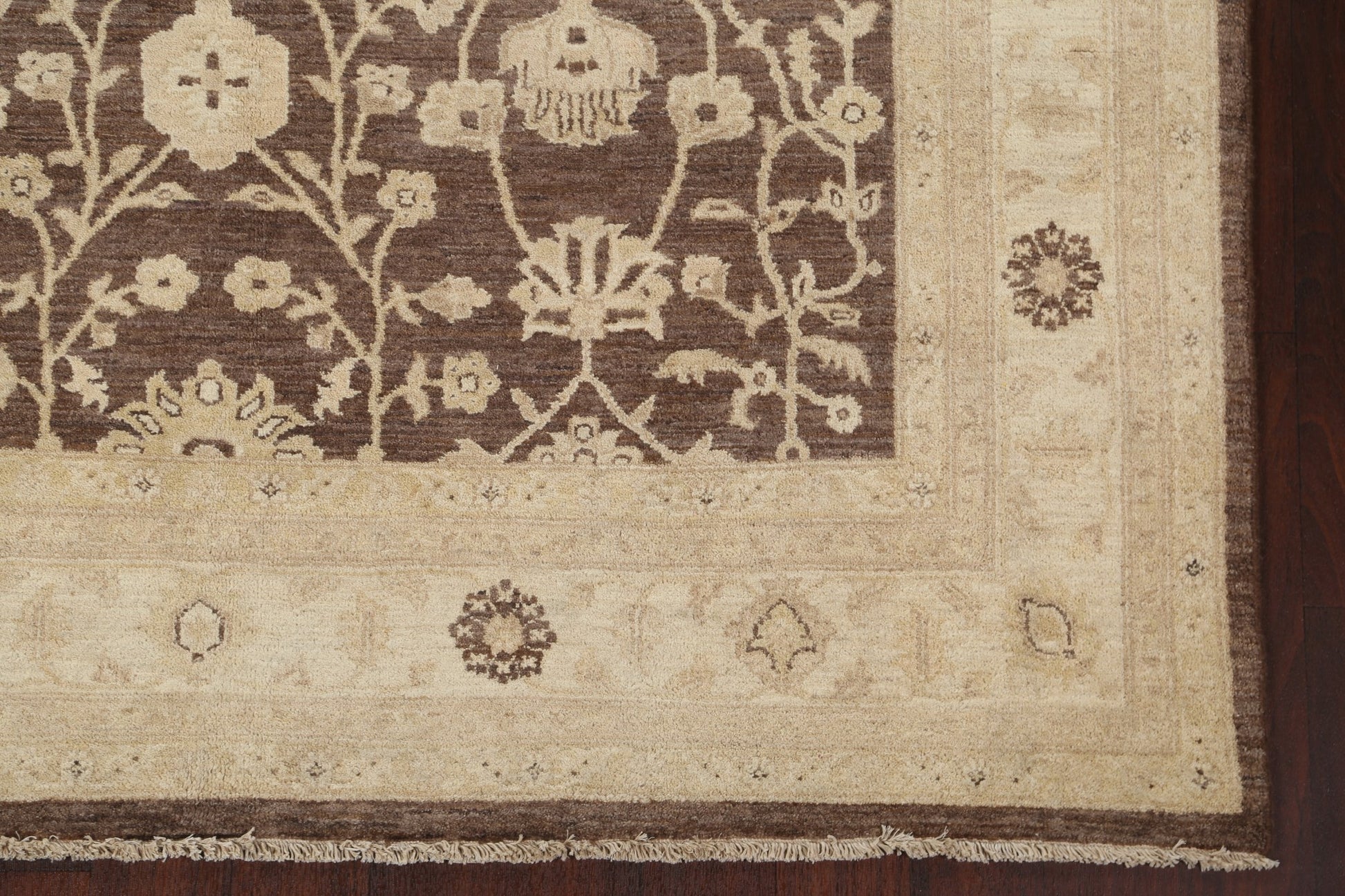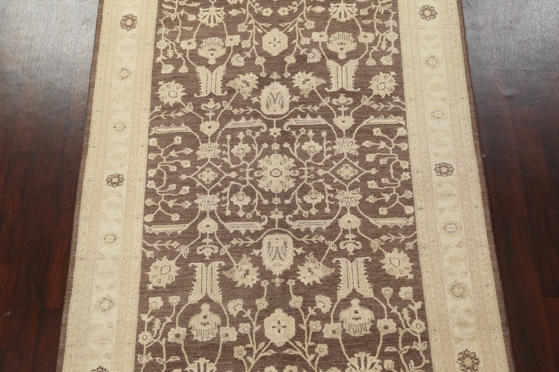 A Beautiful Genuine Pakistan Peshawar-Chobi rug is Hand Knotted by skillful weavers in Pakistan with 100% Wool Material. This rug is in New, First Quality condition. dimensions are 9' 9'' X 6' 6'' in foot and 297 X 198 in centimeter. the primary color is Brown.