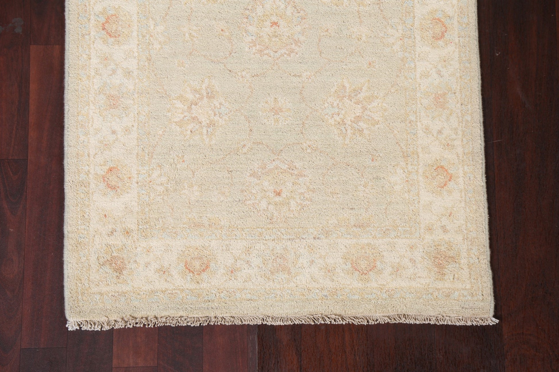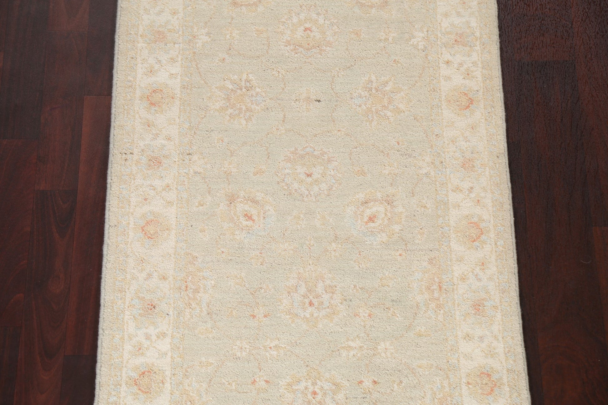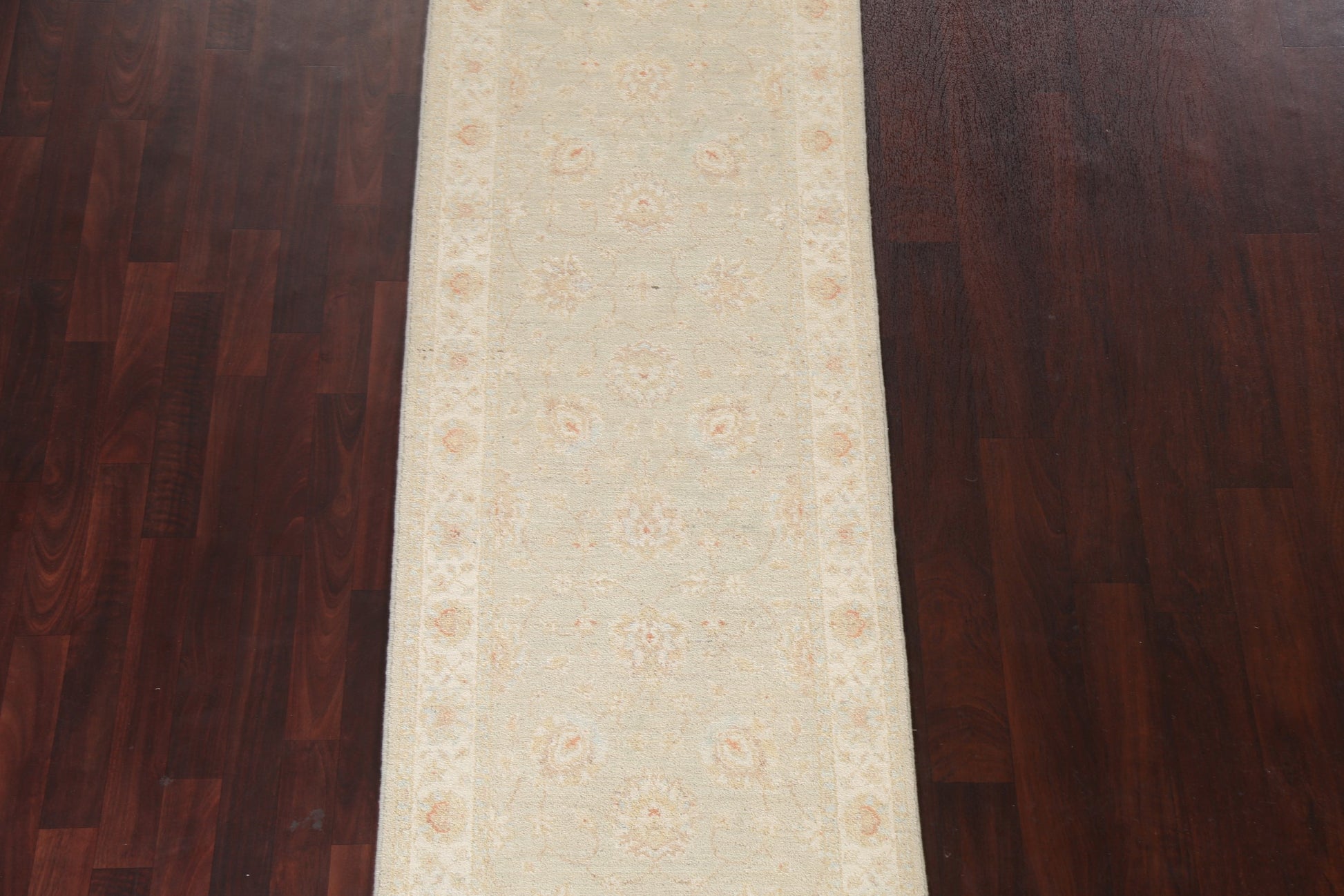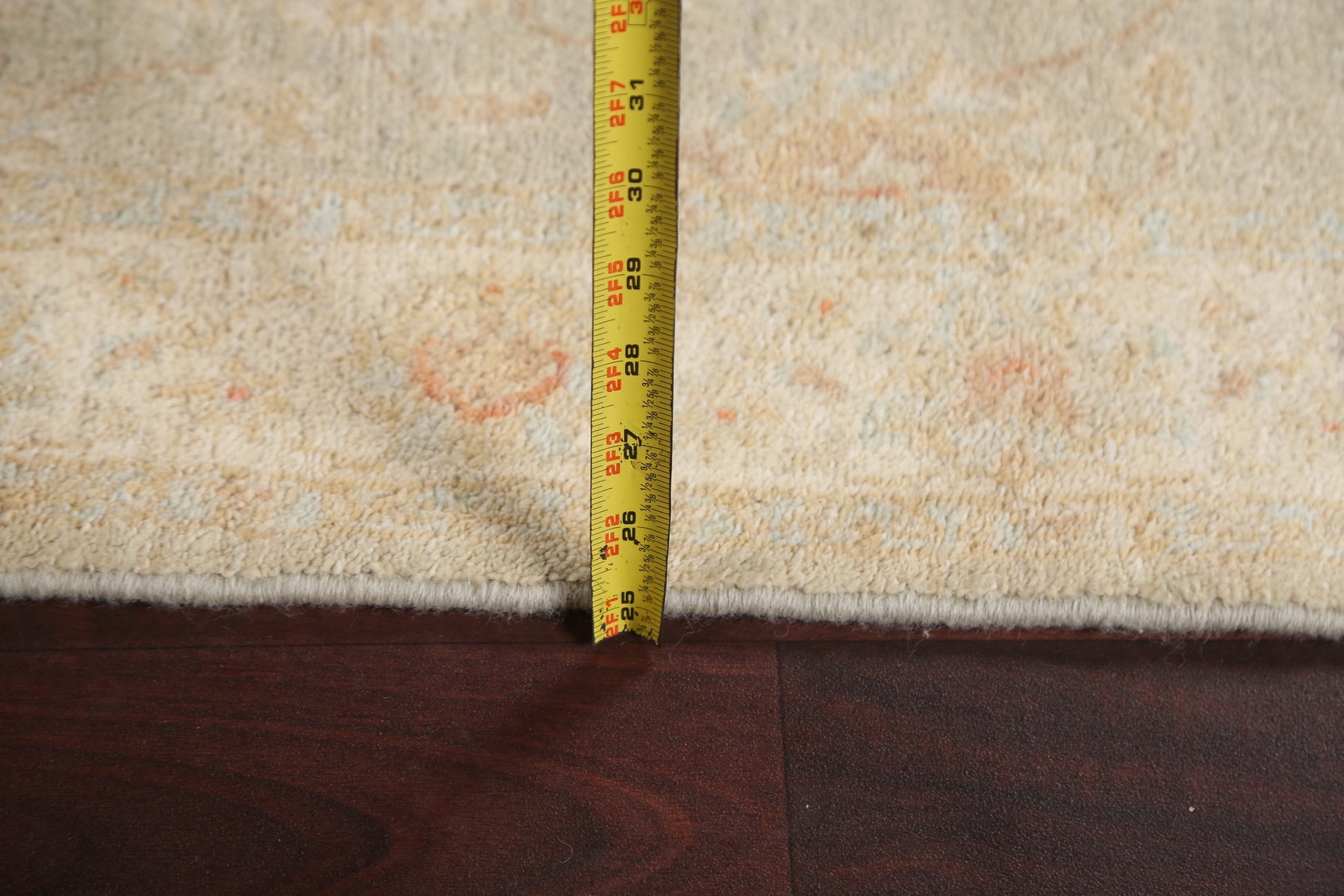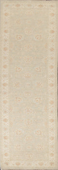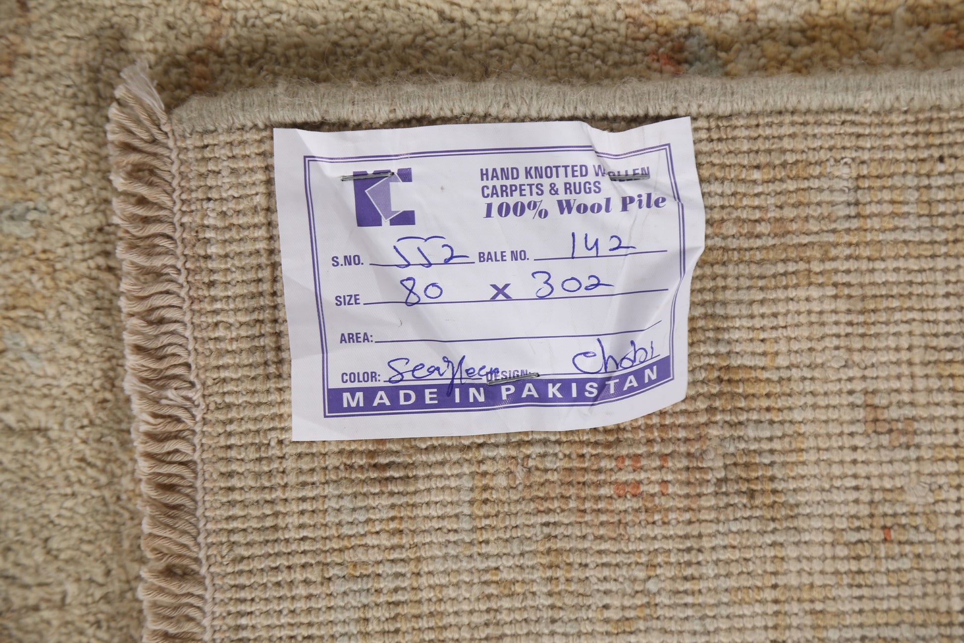 A Beautiful Genuine Pakistan Peshawar-Chobi rug is Hand Knotted by skillful weavers in Pakistan with 100% Wool Material. This rug is in New, First Quality condition. dimensions are 10' 0'' X 2' 8'' in foot and 305 X 81 in centimeter. the primary color is Beige & Ivories.