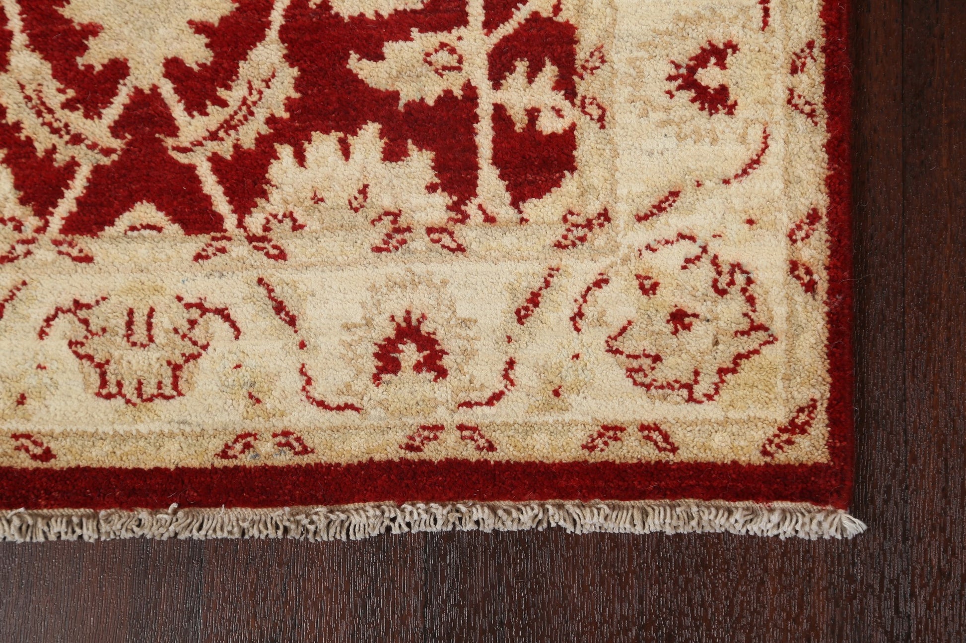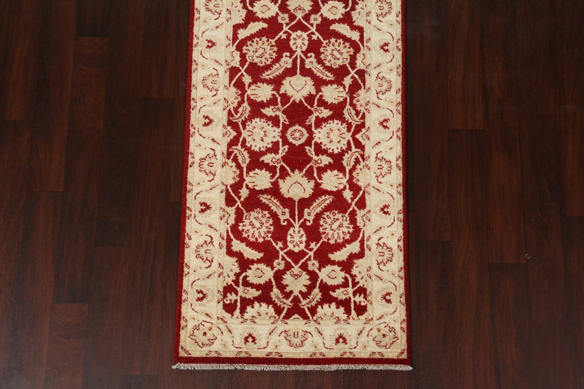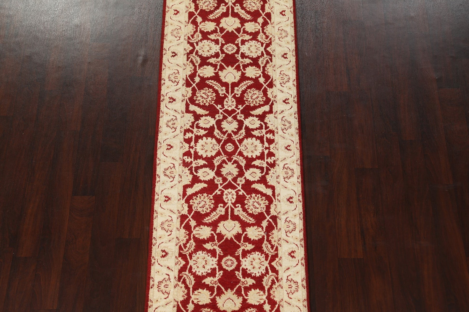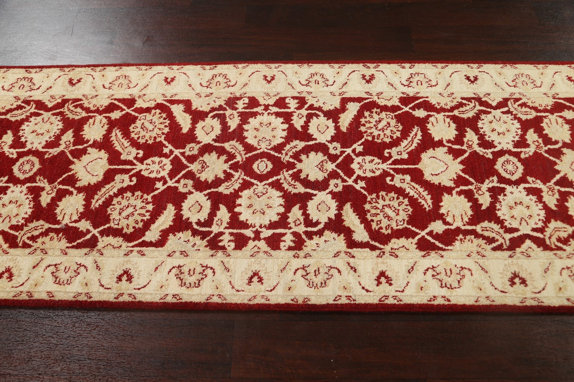 A Beautiful Genuine Pakistan Peshawar-Chobi rug is Hand Knotted by skillful weavers in Pakistan with 100% Wool Material. This rug is in New, First Quality condition. dimensions are 9' 9'' X 2' 8'' in foot and 297 X 81 in centimeter. the primary color is Red.