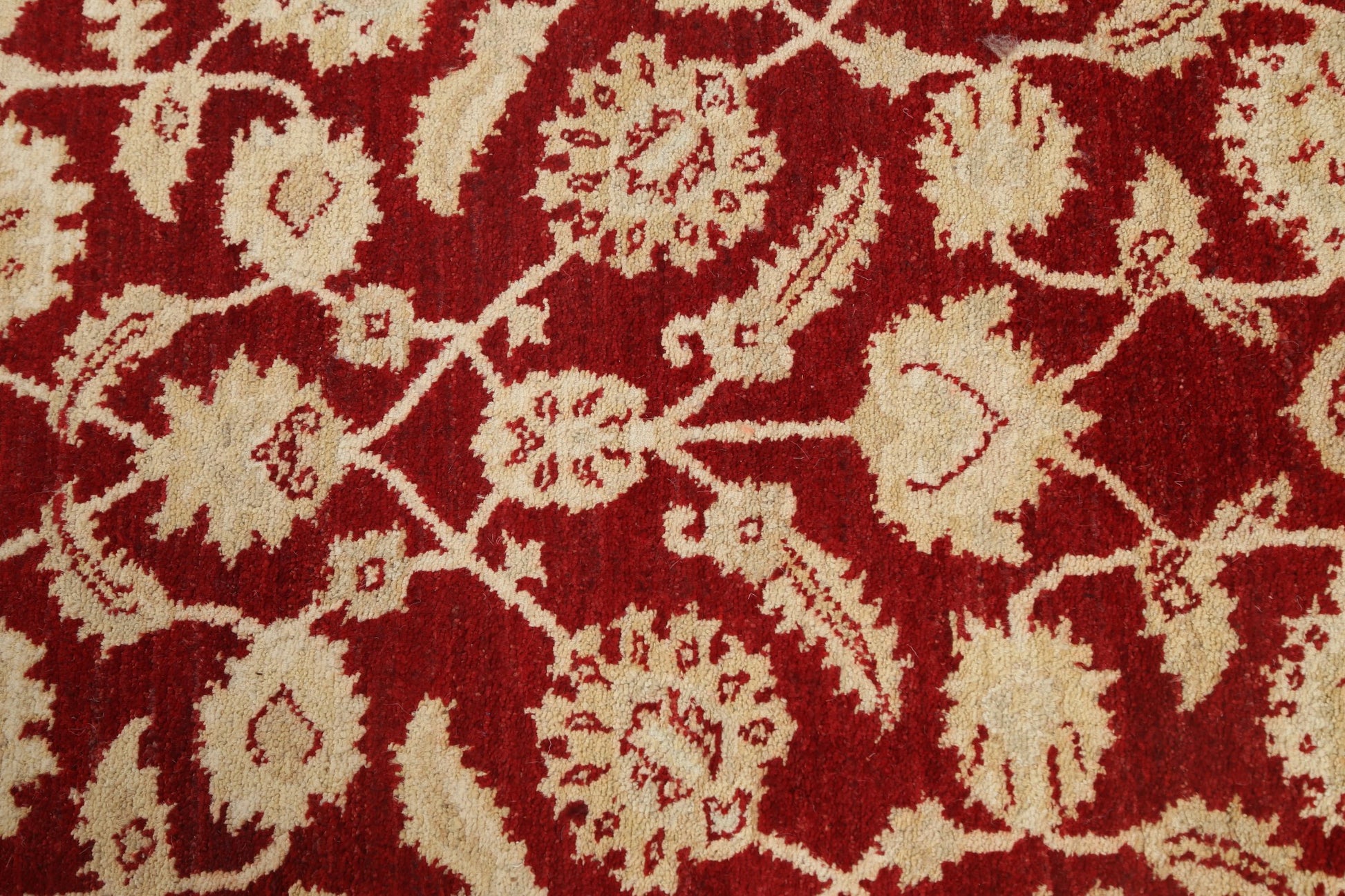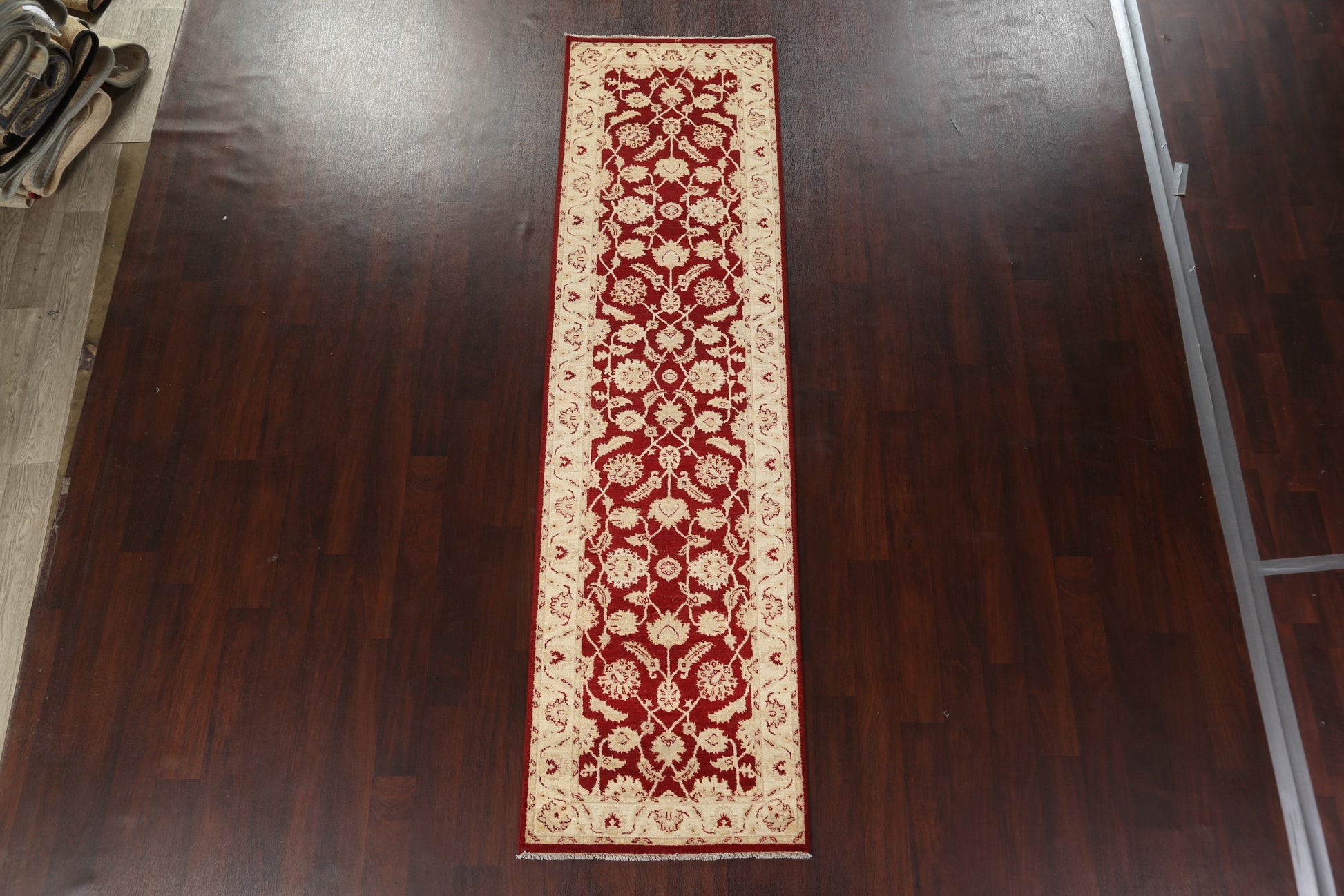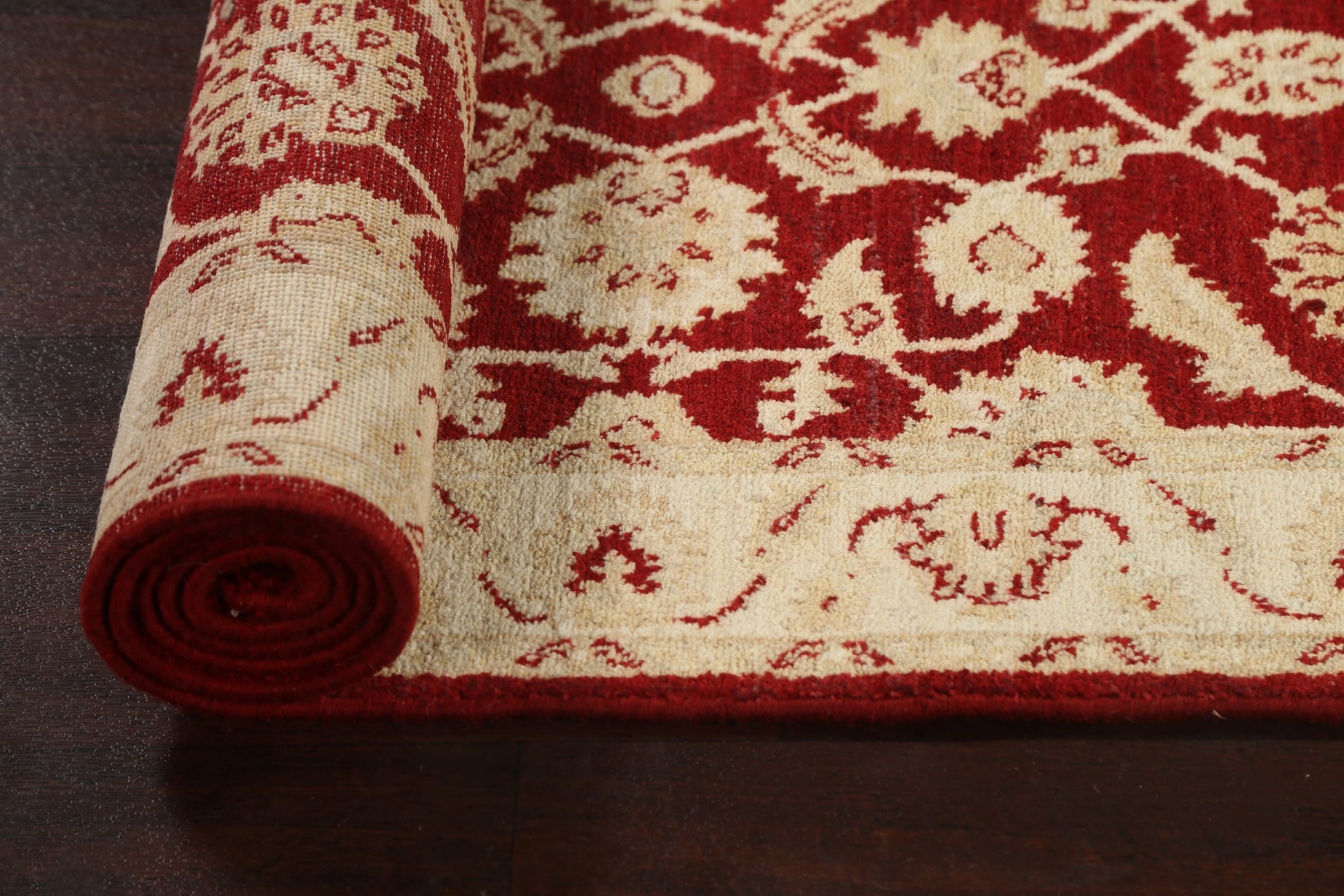 A Beautiful Genuine Pakistan Peshawar-Chobi rug is Hand Knotted by skillful weavers in Pakistan with 100% Wool Material. This rug is in New, First Quality condition. dimensions are 9' 9'' X 2' 8'' in foot and 297 X 81 in centimeter. the primary color is Red.