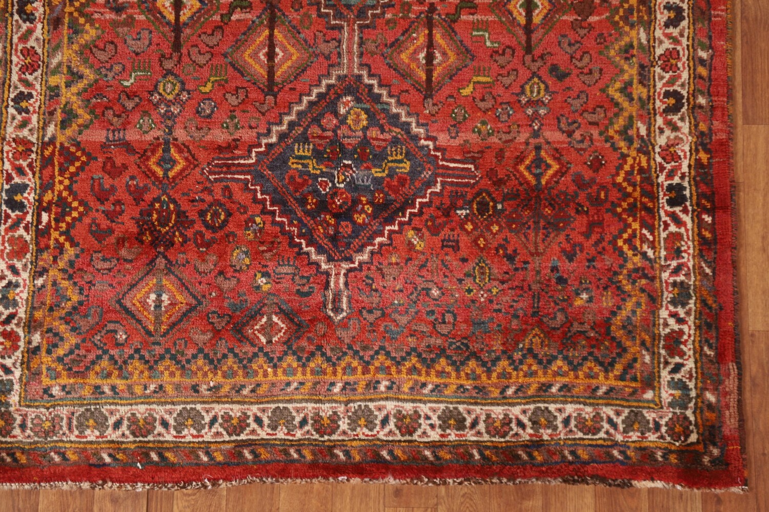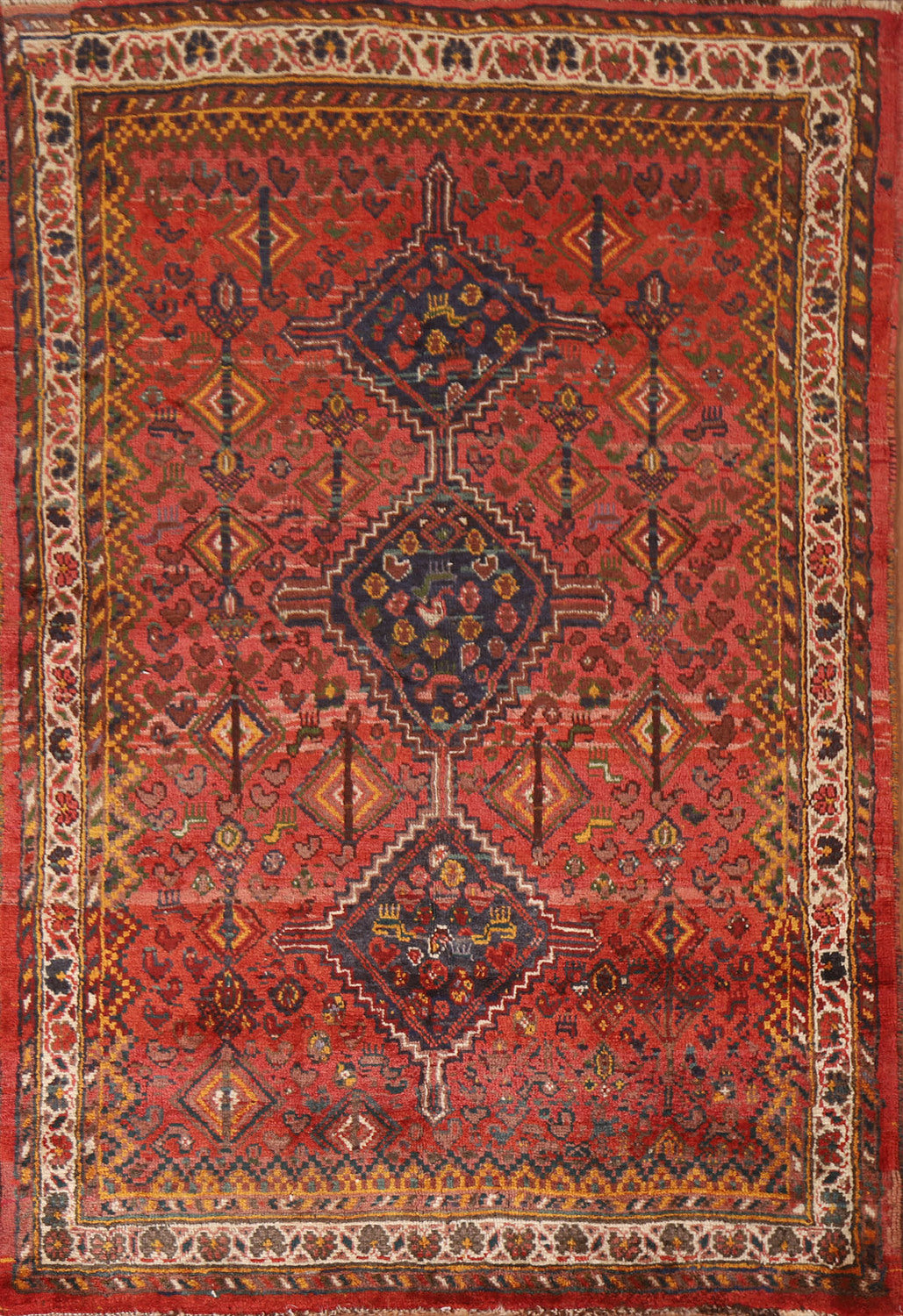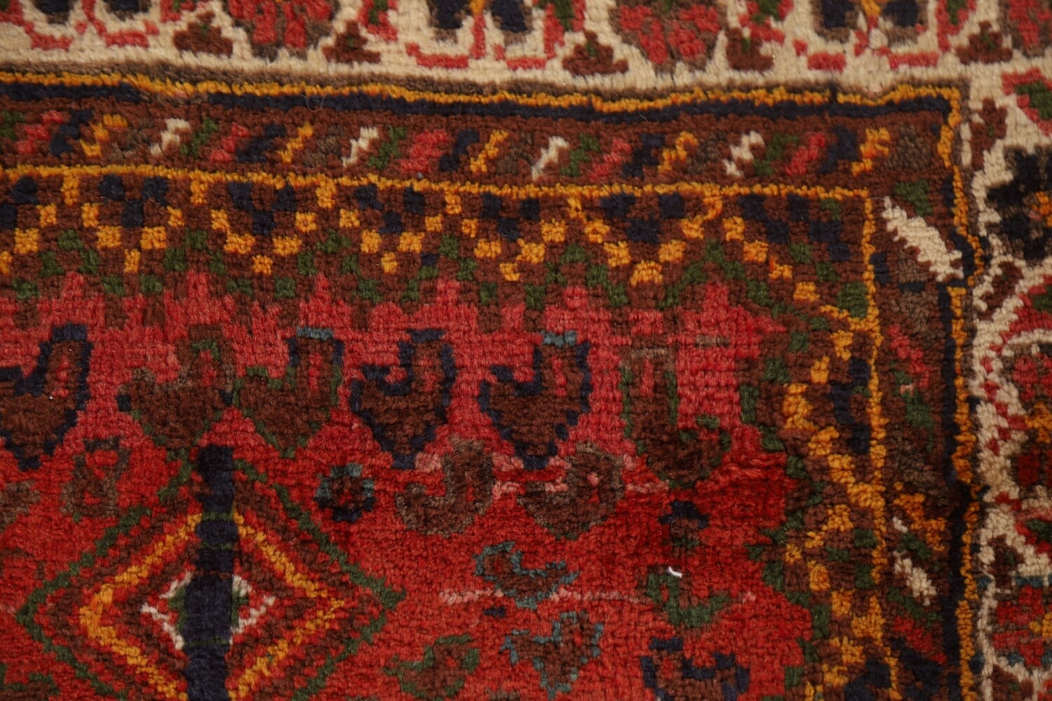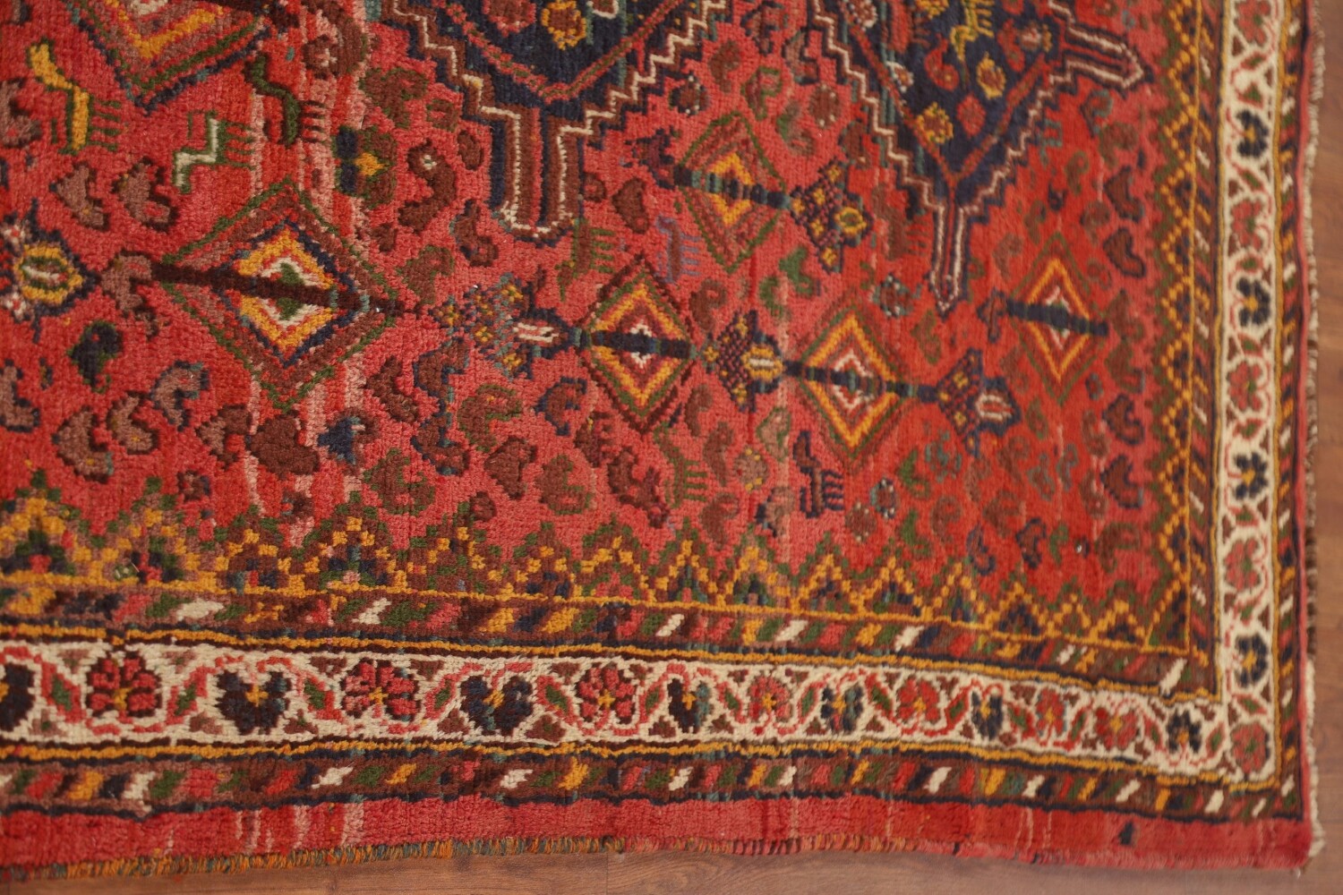 A Beautiful Genuine Persia ( Persia ) Qashqai rug is Hand Knotted by skillful weavers in Persia ( Persia ) with 100% Wool Material. This rug is in Very Good (Abrash) condition. dimensions are 6' 0'' X 4' 1'' in foot and 183 X 124 in centimeter. the primary color is Red.