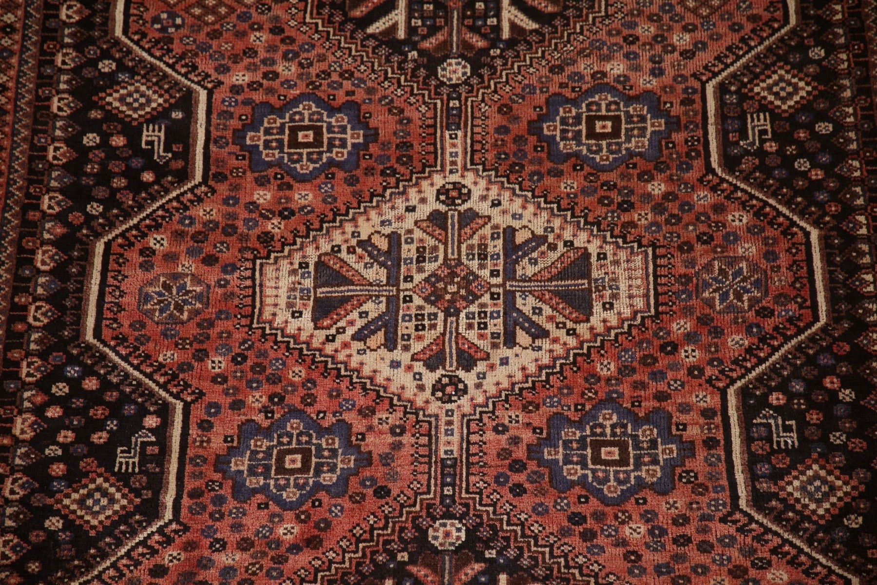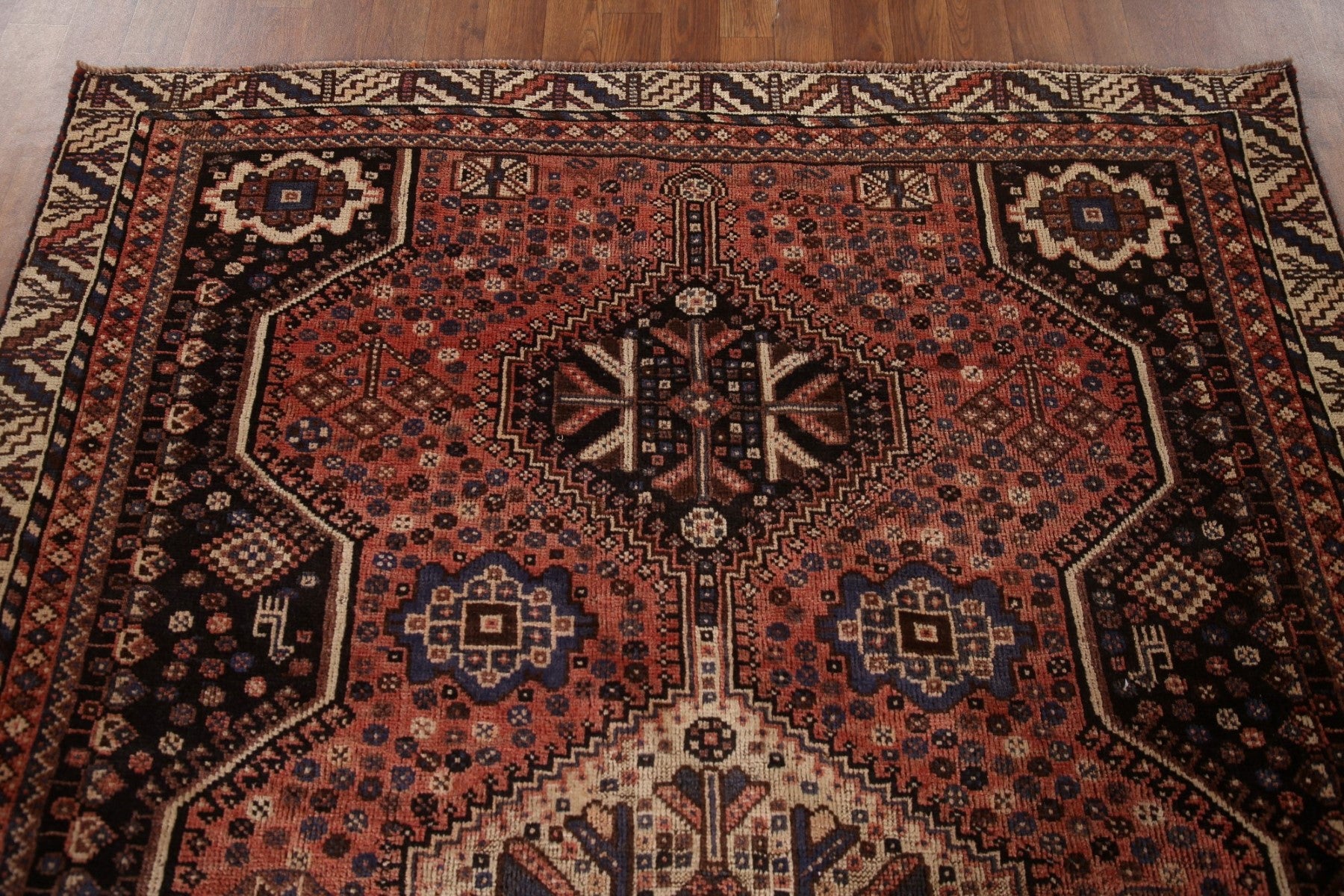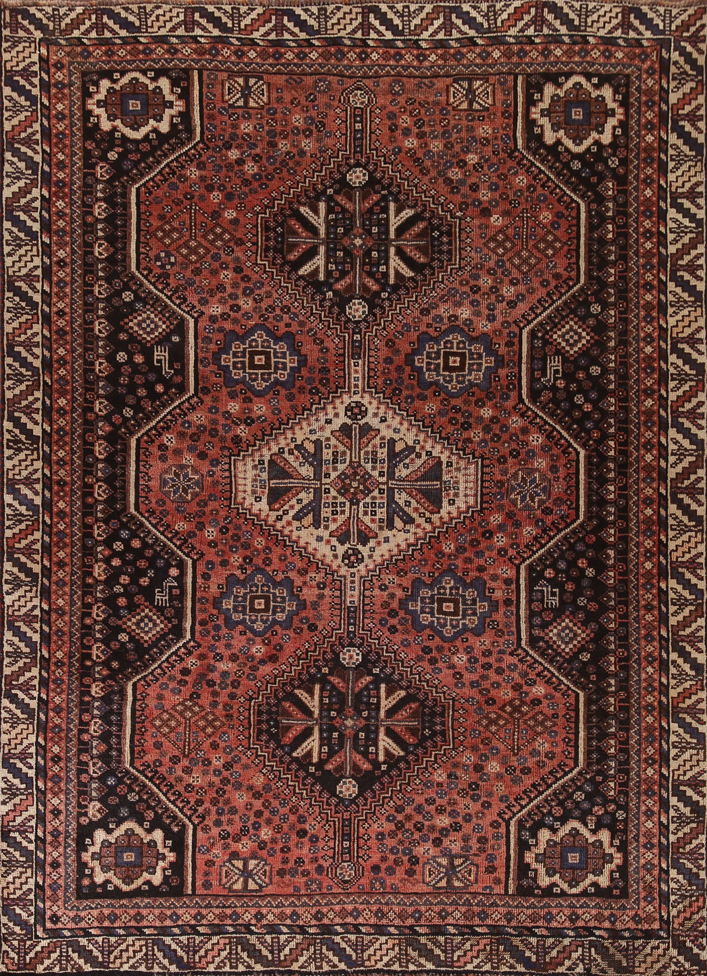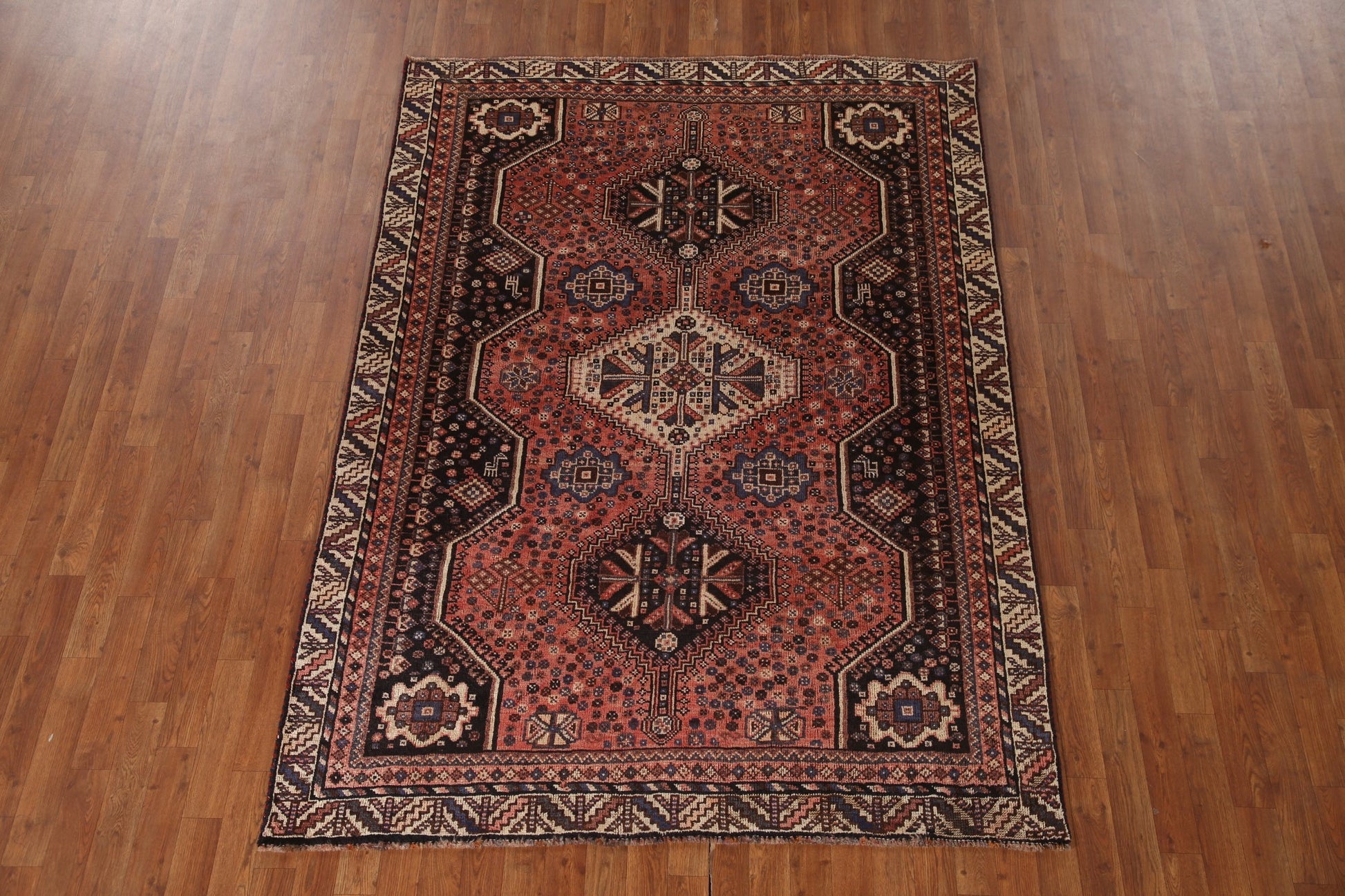 A Beautiful Genuine Persia ( Persia ) Qashqai rug is Hand Knotted by skillful weavers in Persia ( Persia ) with 100% Wool Material. This rug is in Very Good (Evenly Low Pile) condition. dimensions are 7' 6'' X 5' 5'' in foot and 229 X 165 in centimeter. the primary color is Coral.