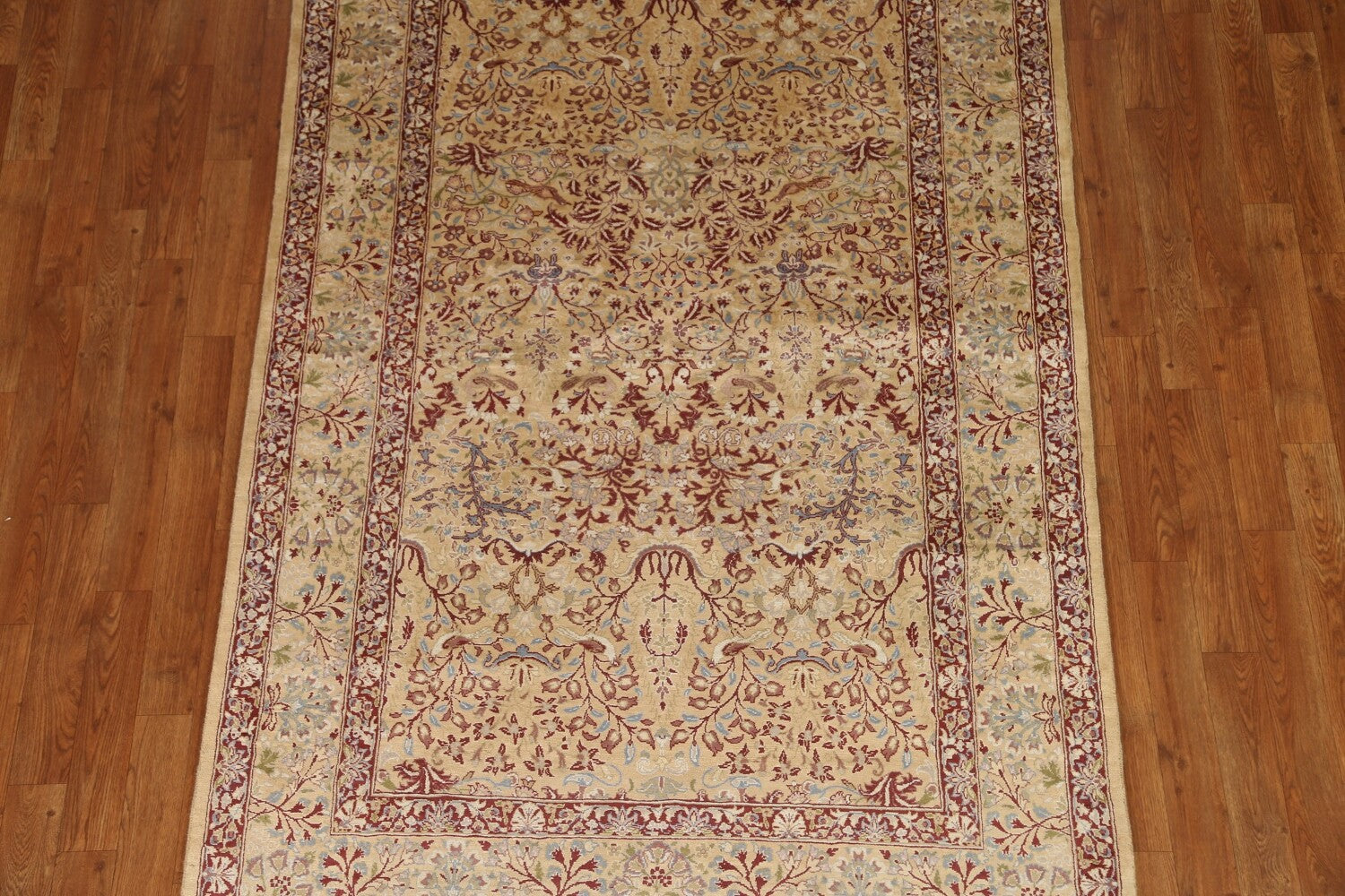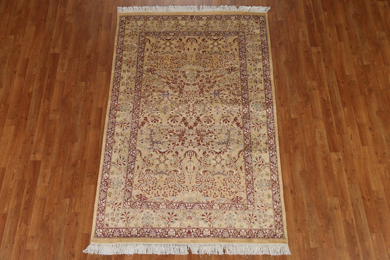 A Beautiful Genuine Pakistan Qum rug is Hand Knotted by skillful weavers in Pakistan with 100% Wool Material. This rug is in condition. dimensions are 6' 10'' X 4' 6'' in foot and 208 X 137 in centimeter. the primary color is Brown.