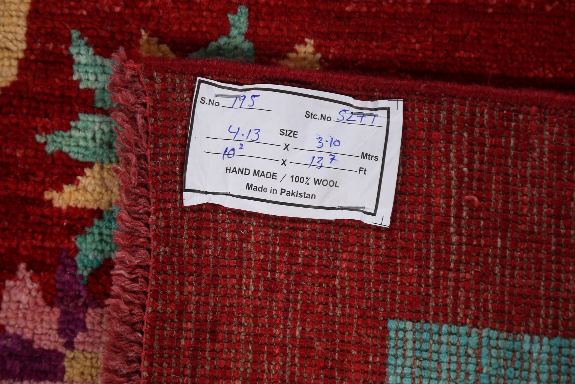 A Beautiful Genuine Pakistan Abstract rug is Hand Knotted by skillful weavers in Pakistan with Wool & Silk Material. This rug is in New, First Quality condition. dimensions are 13' 7'' X 10' 2'' in foot and  414 X 310 in centimeter. the primary color is Red.