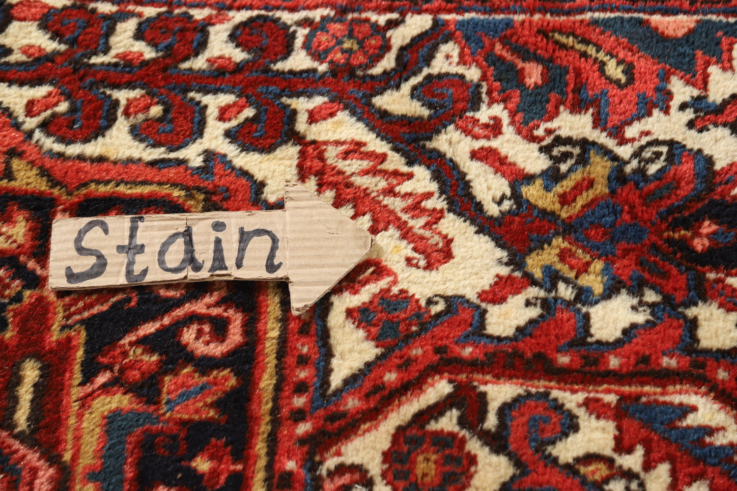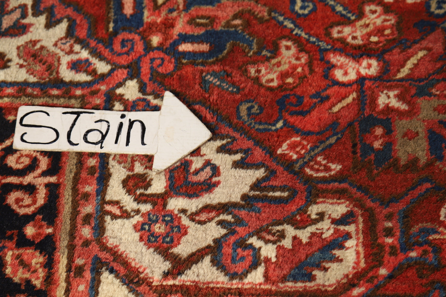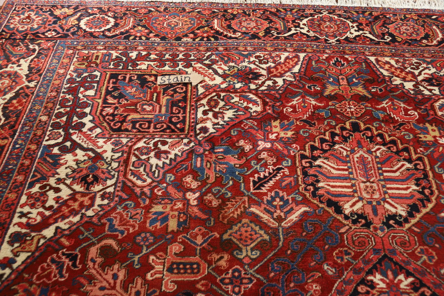 A Beautiful Genuine Persia ( Persia ) Heriz rug is Hand Knotted by skillful weavers in Persia ( Persia ) with 100% Wool Material. This rug is in Very Good (Missing Pile-Stain) condition. dimensions are 19' 3'' X 12' 0'' in foot and 587 X 366 in centimeter. the primary color is Red.