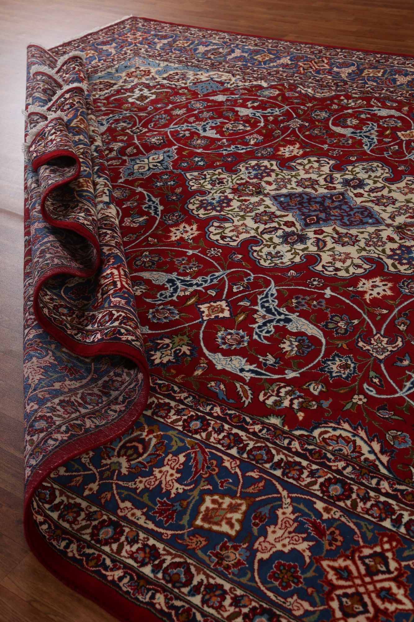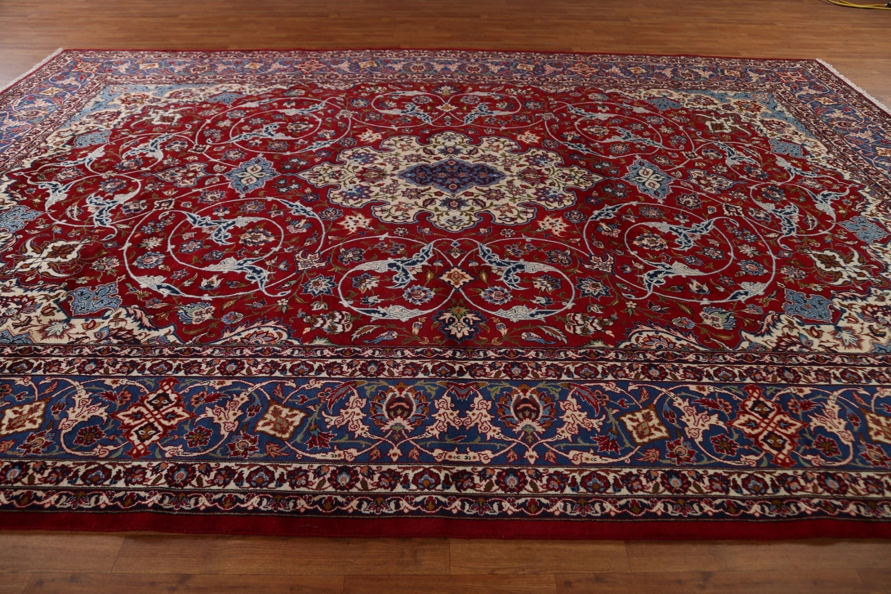 A Beautiful Genuine Persia ( Persia ) Isfahan rug is Hand Knotted by skillful weavers in Persia ( Persia ) with 100% Wool Material. This rug is in Excellent condition. dimensions are 14' 3'' X 10' 0'' in foot and 434 X 305 in centimeter. the primary color is Red.