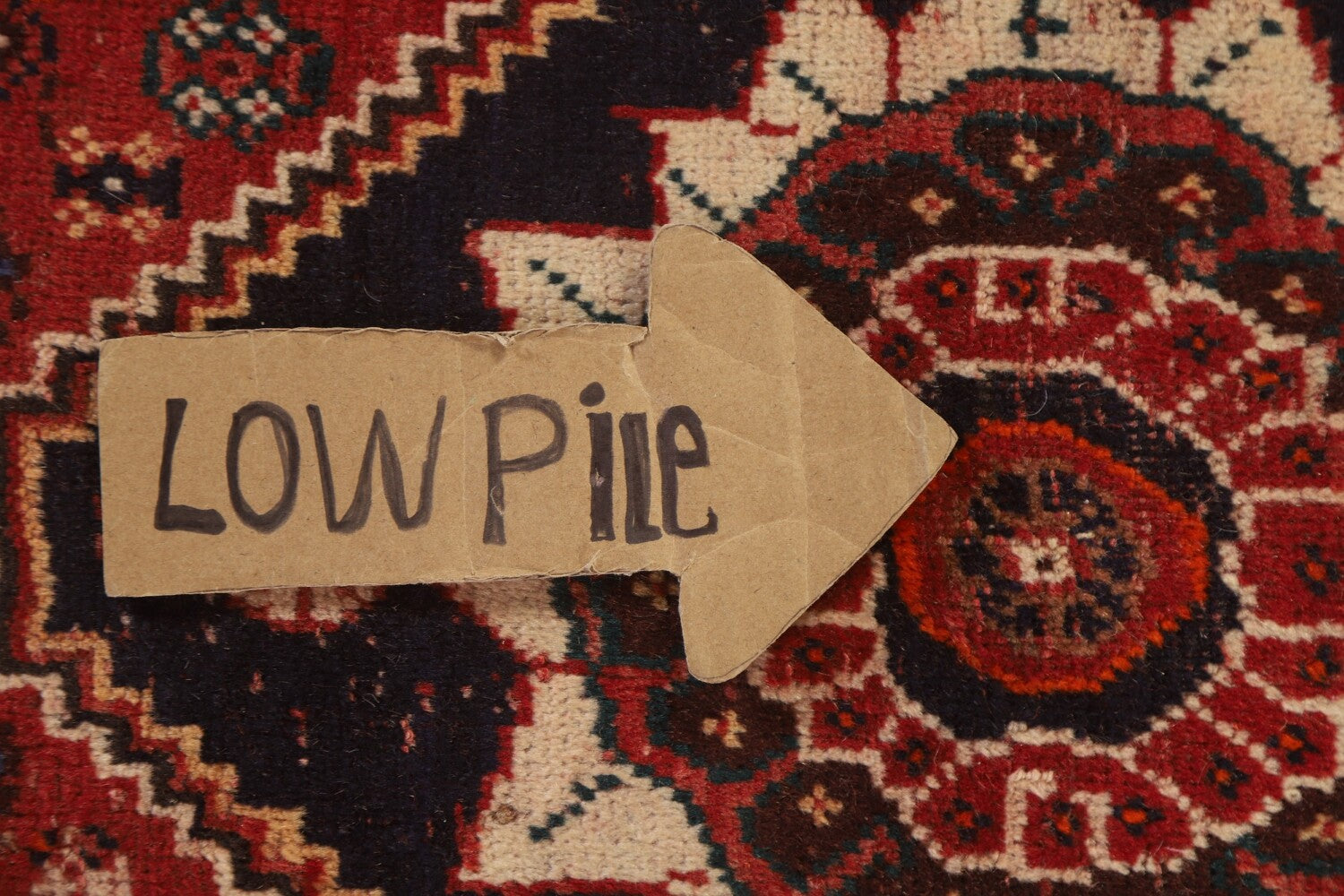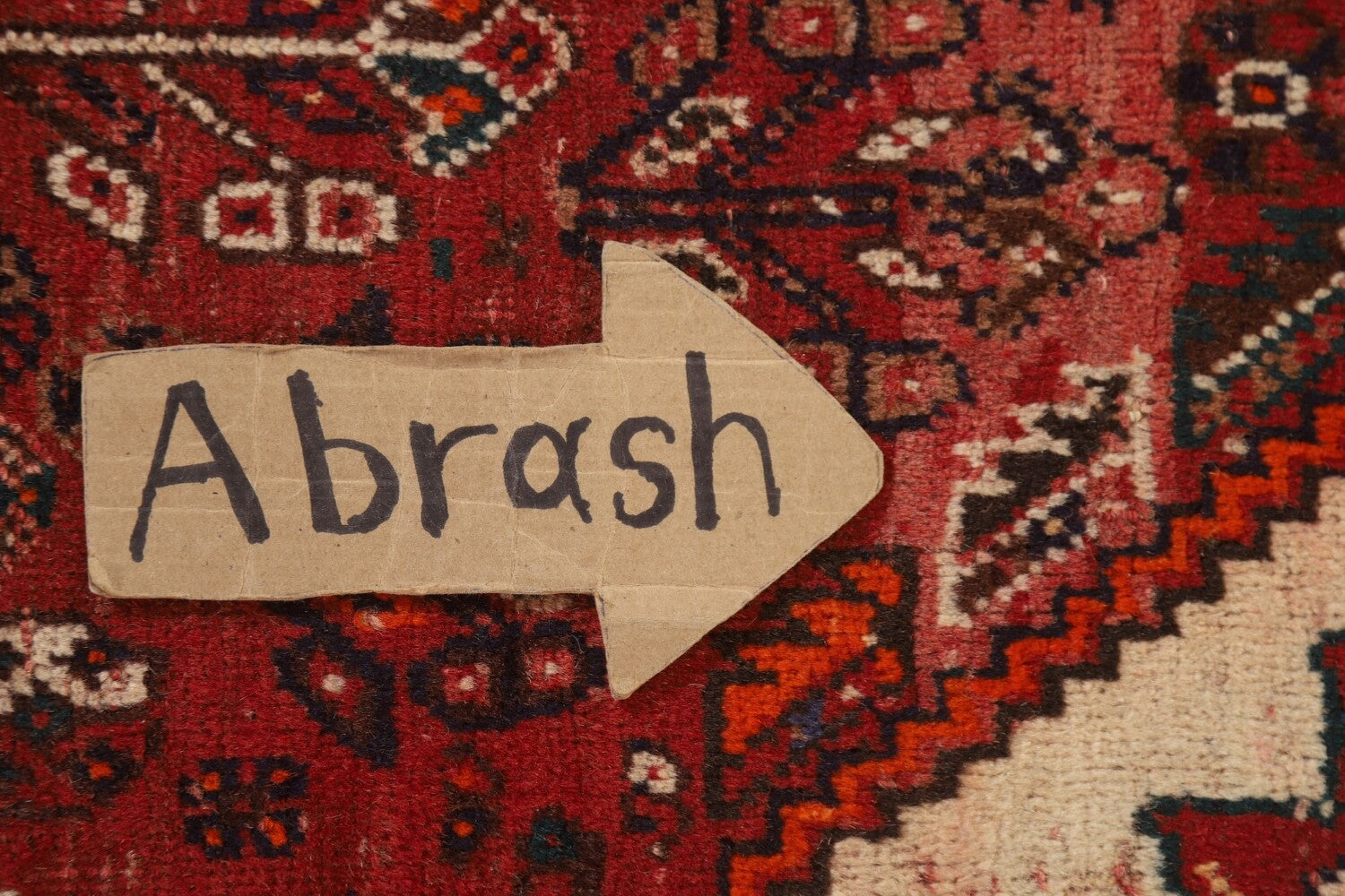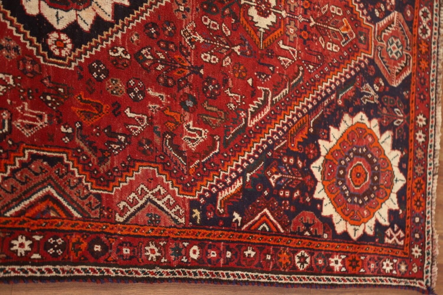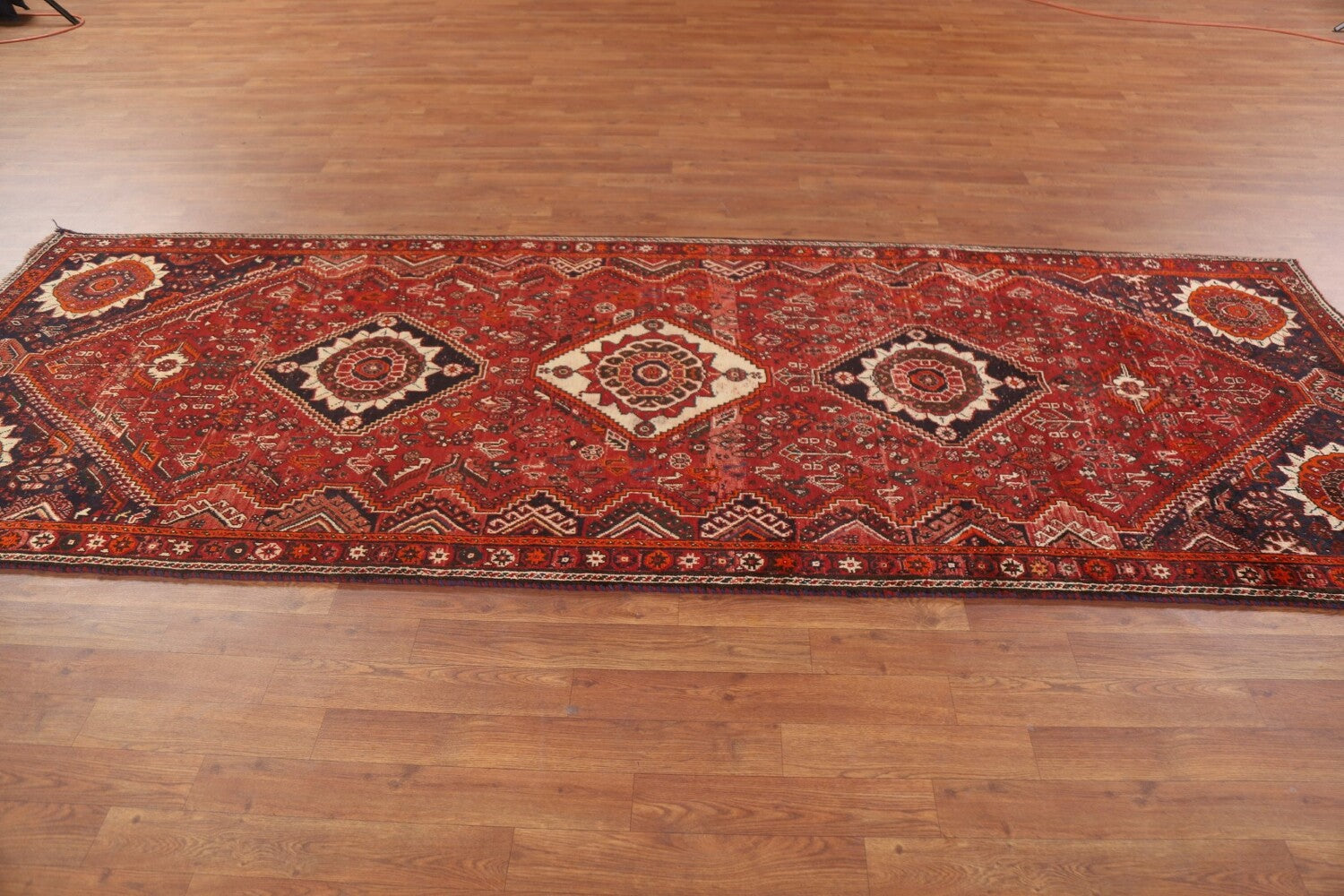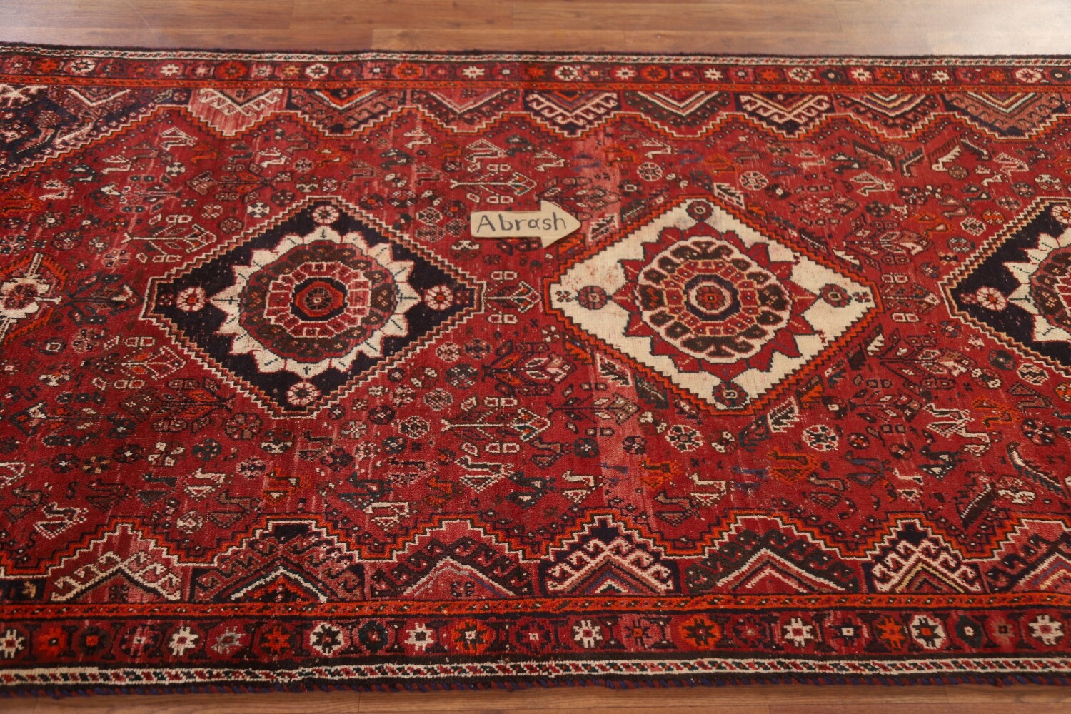 A Beautiful Genuine Persia ( Persia ) Shiraz rug is Hand Knotted by skillful weavers in Persia ( Persia ) with 100% Wool Material. This rug is in Very Good (Low Pile-Abrash) condition. dimensions are 10' 4'' X 3' 8'' in foot and 315 X 112 in centimeter. the primary color is Red.