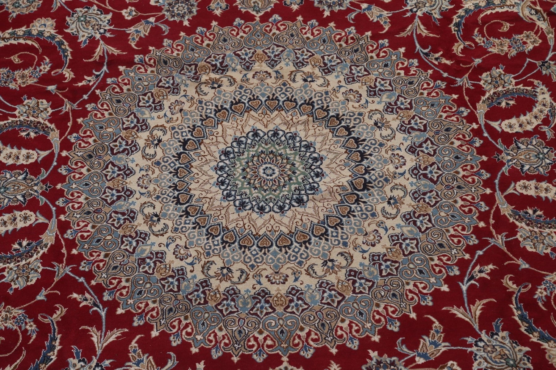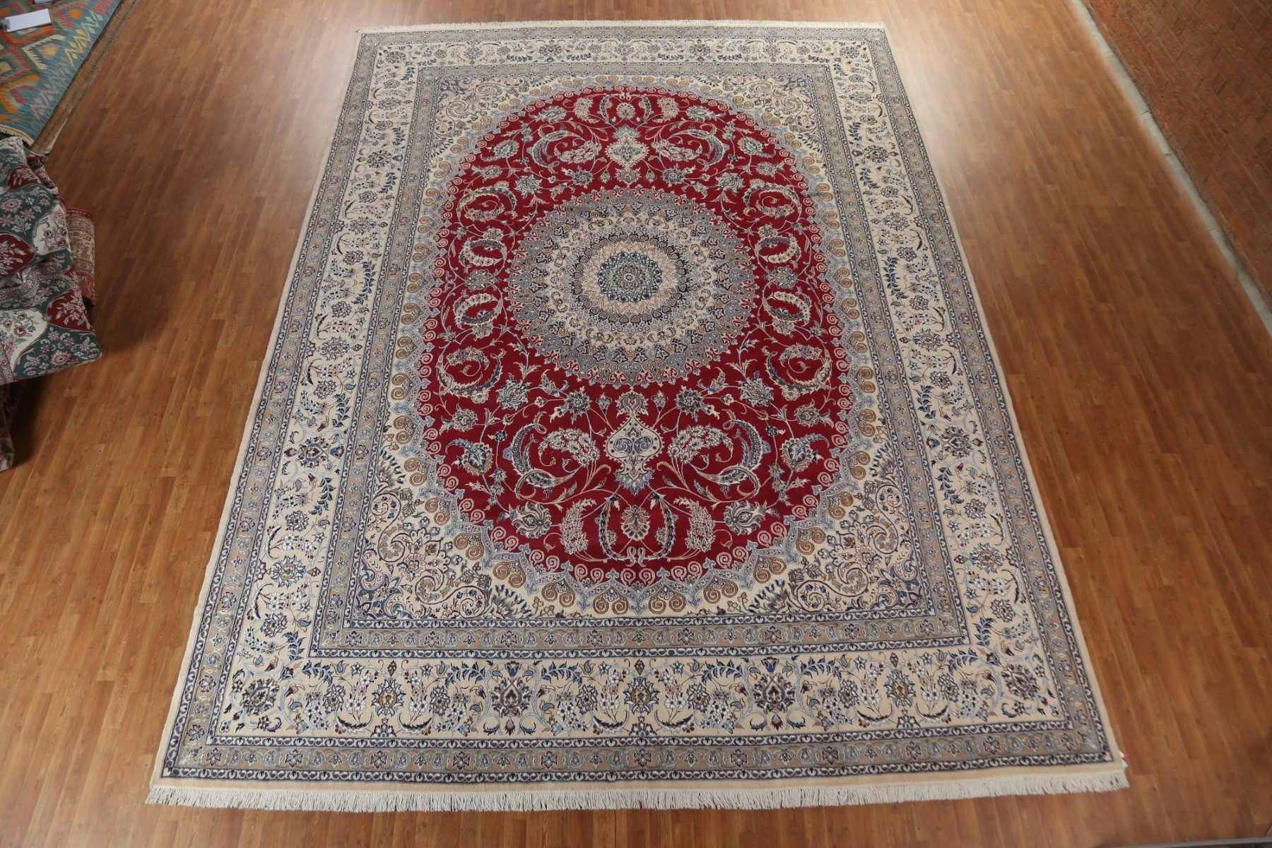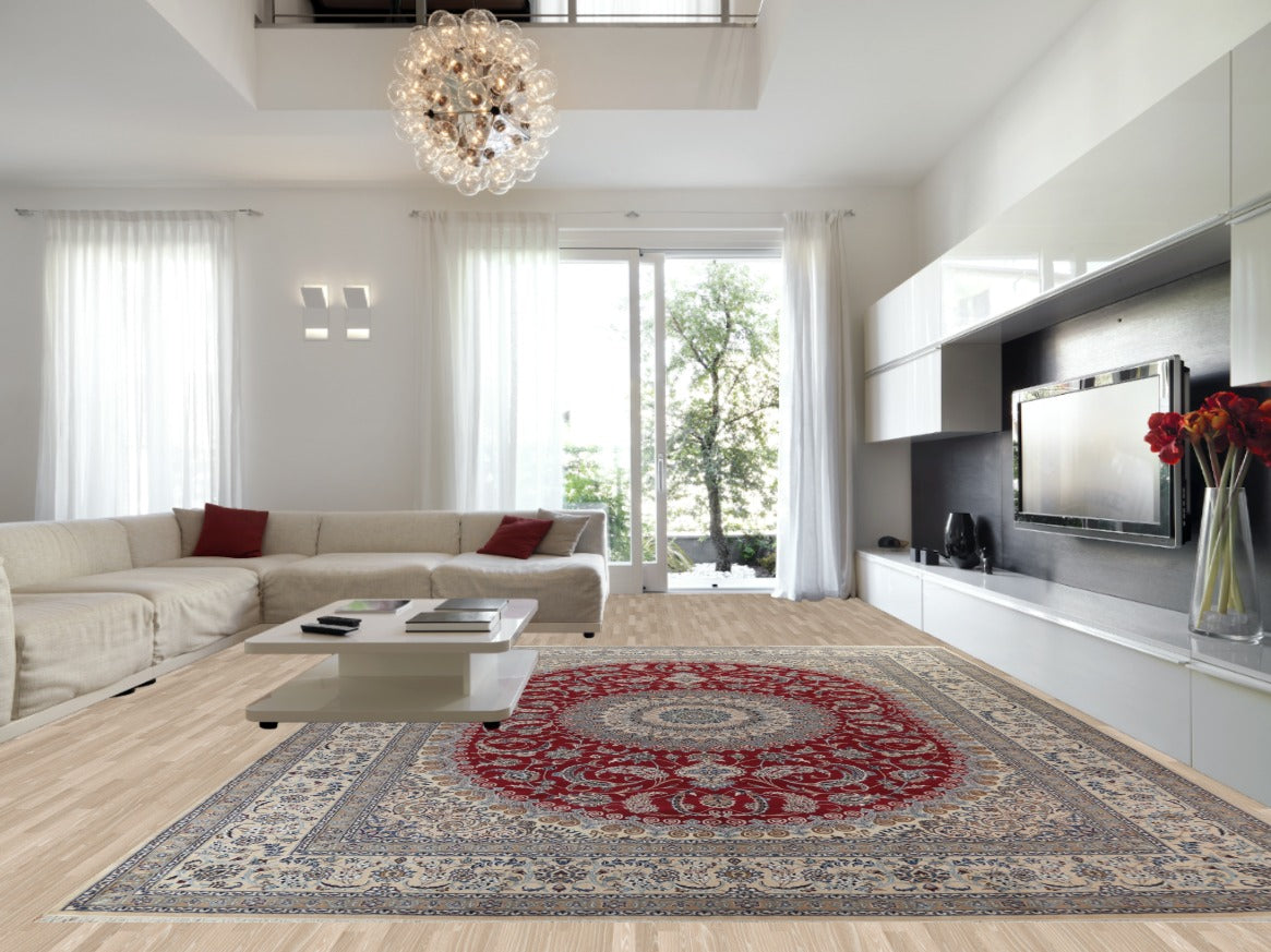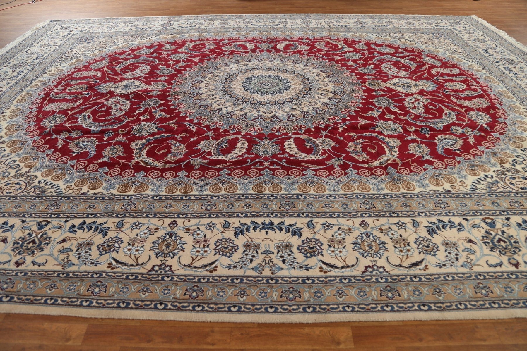 A Beautiful Genuine Persia ( Persia ) Nain rug is Hand Knotted by skillful weavers in Persia ( Persia ) with Wool & Silk Material. This rug is in New, First Quality condition. dimensions are 17' 3'' X 12' 8'' in foot and 526 X 386 in centimeter. the primary color is Red.