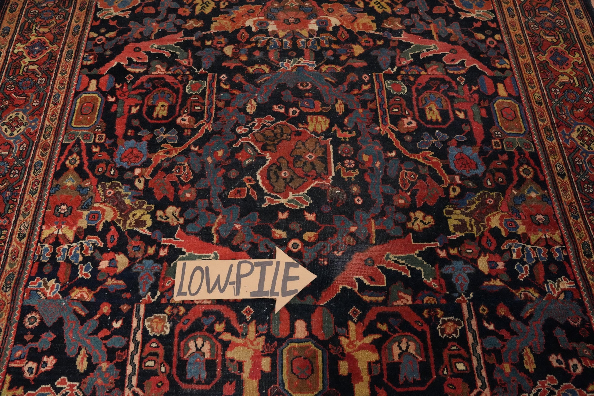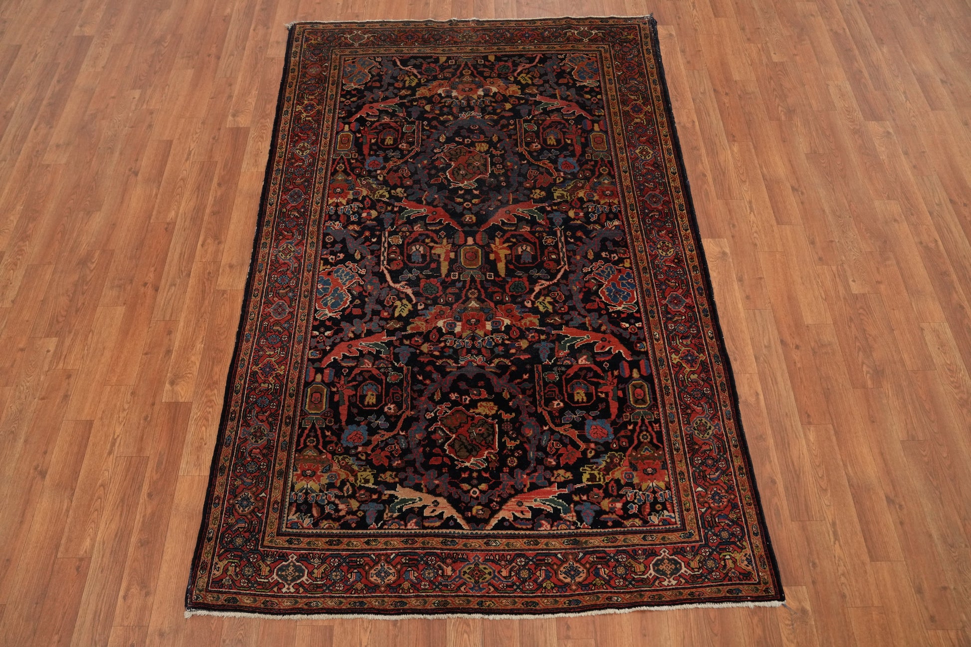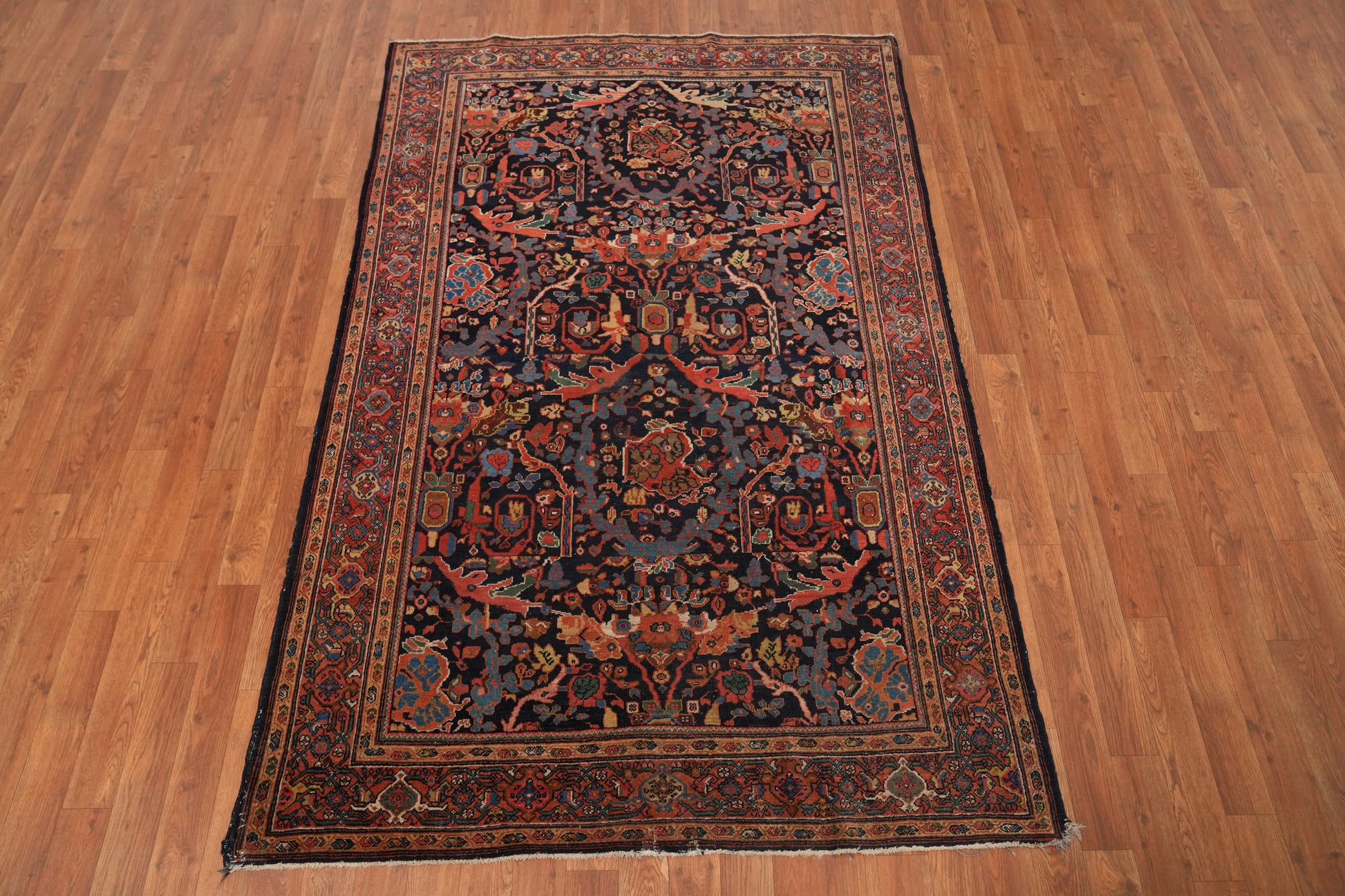 A Beautiful Genuine Persia ( Persia ) Sarouk (Farahan) rug is Hand Knotted by skillful weavers in Persia ( Persia ) with 100% Wool Material. This rug is in Very Good ( Low Pile ) condition. dimensions are 6' 10'' X 4' 5'' in foot and 208 X 135 in centimeter. the primary color is Navy Blue & Blues.