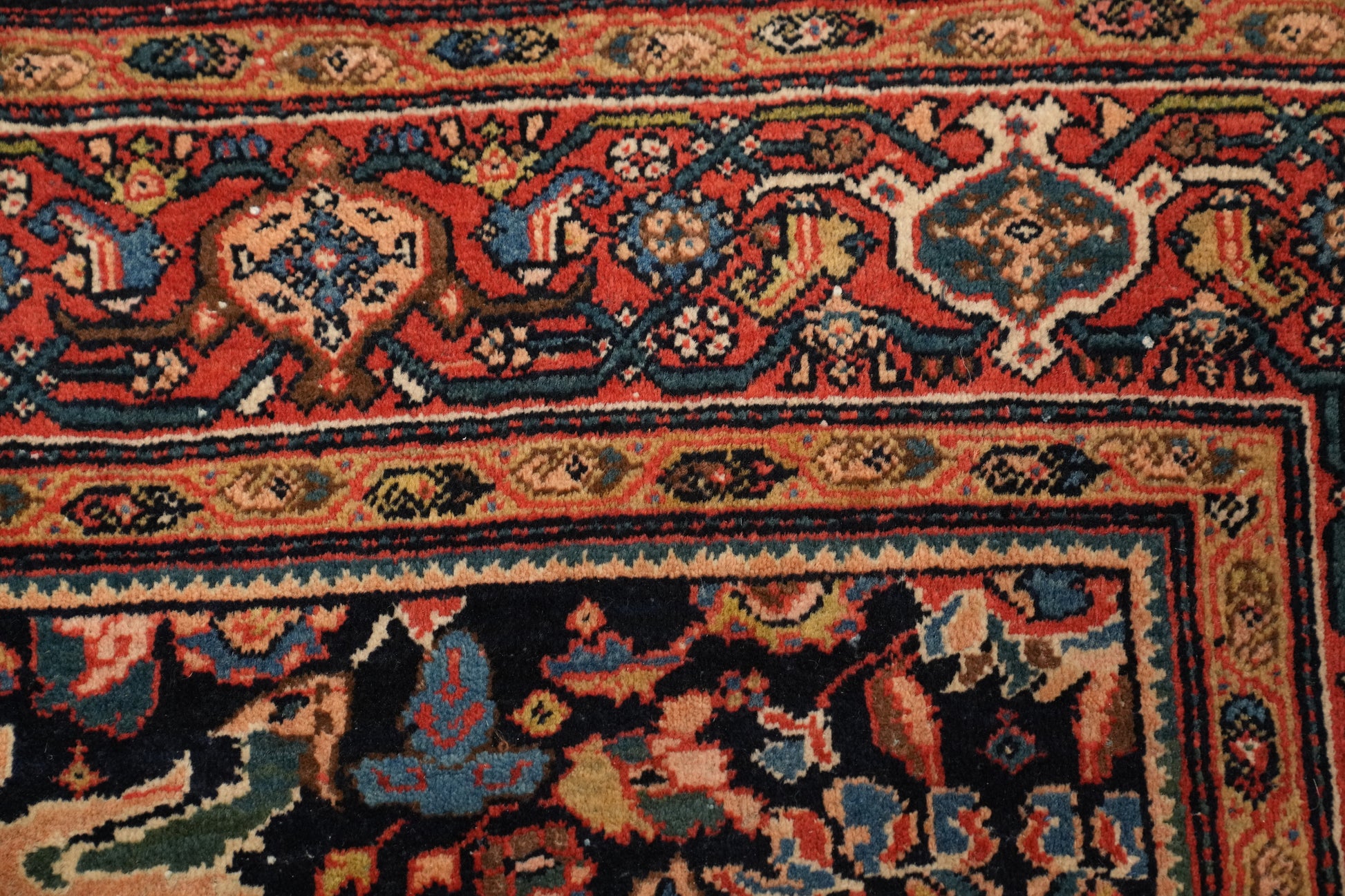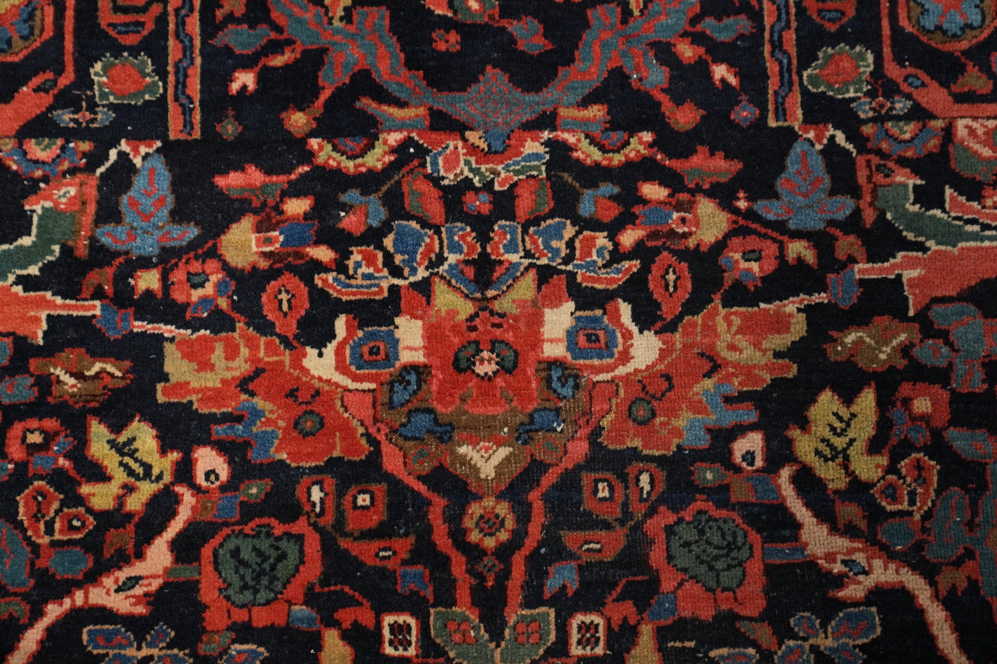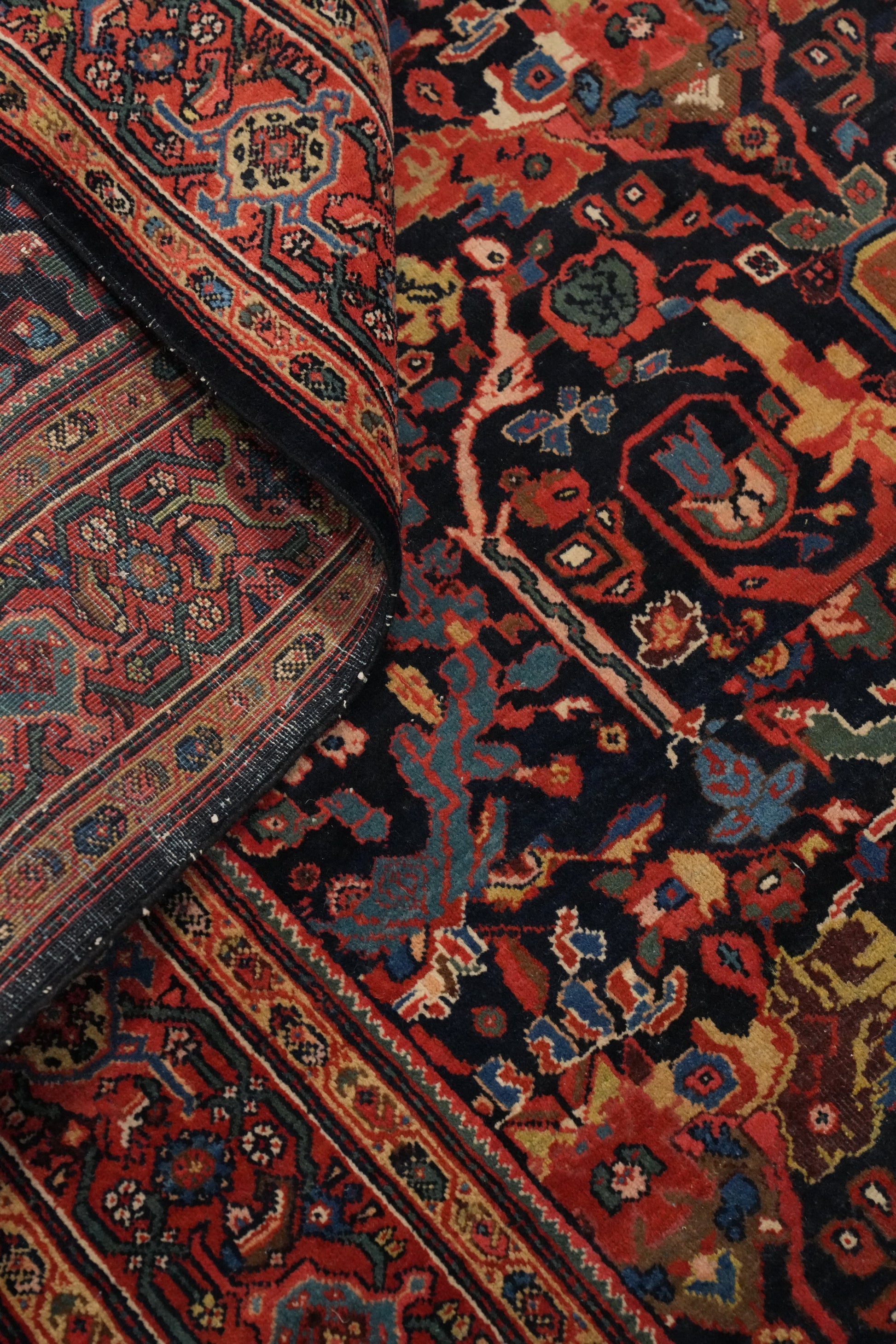 A Beautiful Genuine Persia ( Persia ) Sarouk (Farahan) rug is Hand Knotted by skillful weavers in Persia ( Persia ) with 100% Wool Material. This rug is in Very Good ( Low Pile ) condition. dimensions are 6' 10'' X 4' 5'' in foot and 208 X 135 in centimeter. the primary color is Navy Blue & Blues.