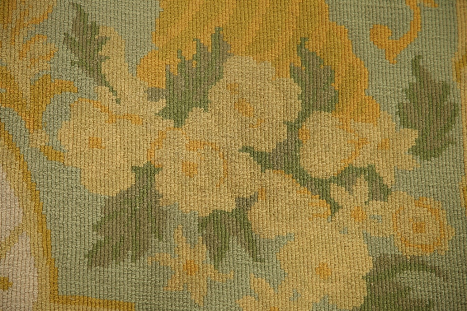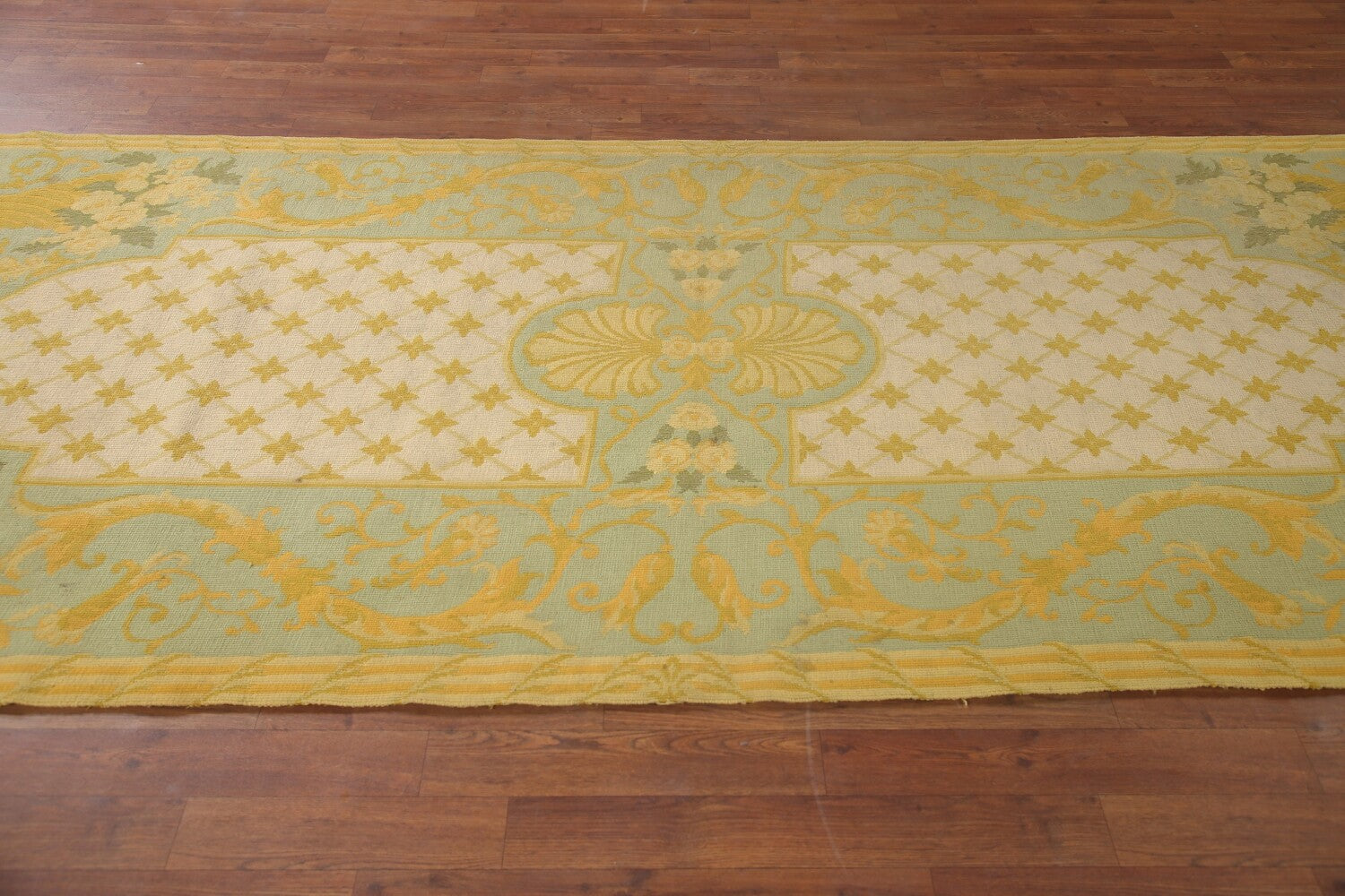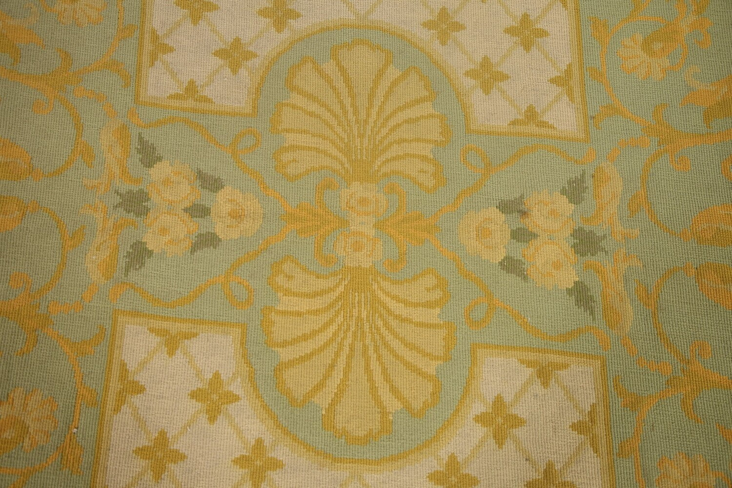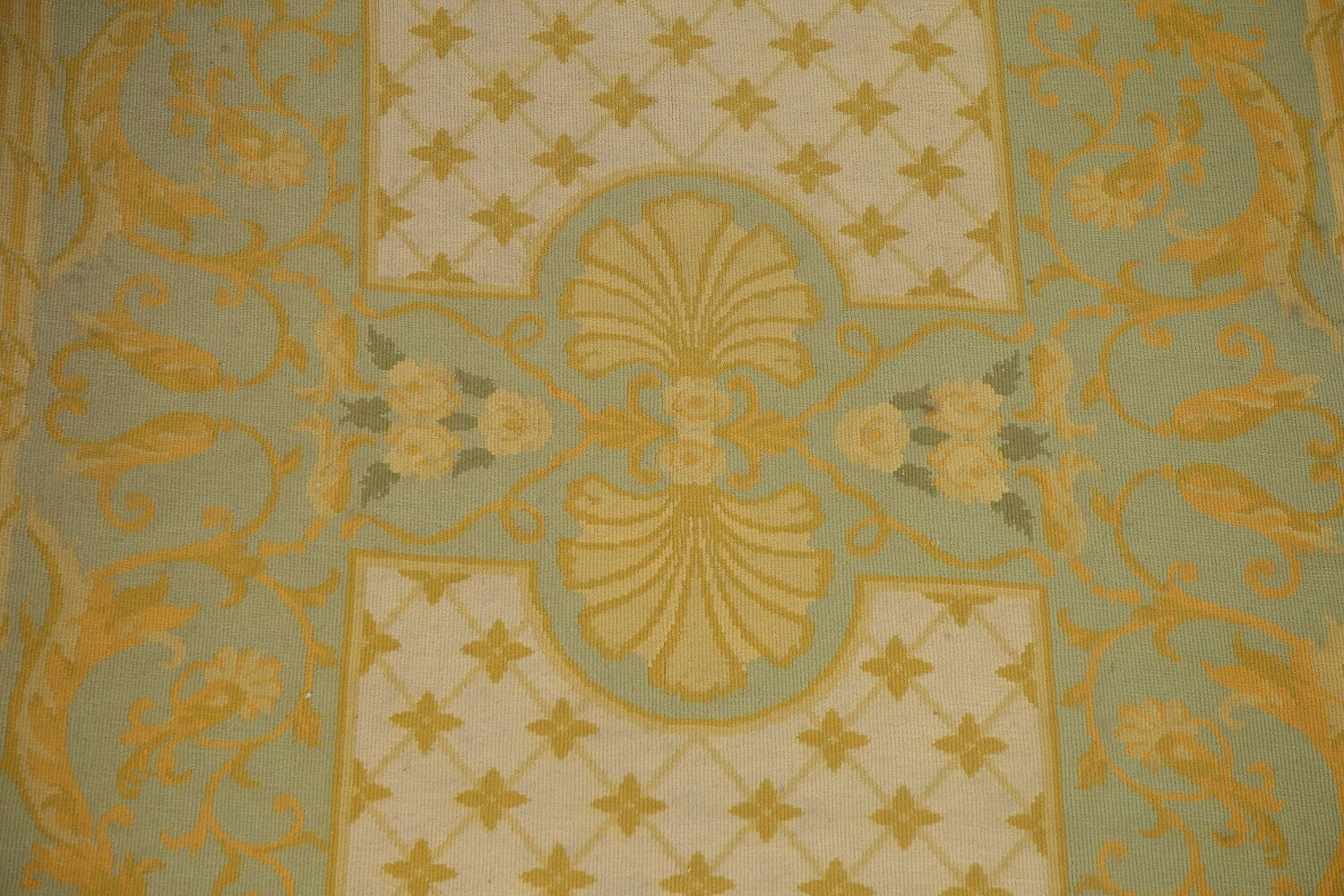 A Beautiful Genuine France Savonnerie rug is Hand Woven by skillful weavers in France with 100% Wool Material. This rug is in Very Good (Low Pile) condition. dimensions are 10' 1'' X 4' 3'' in foot and 307 X 130 in centimeter. the primary color is Green.