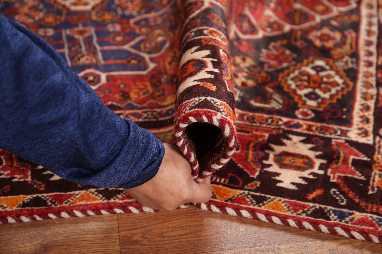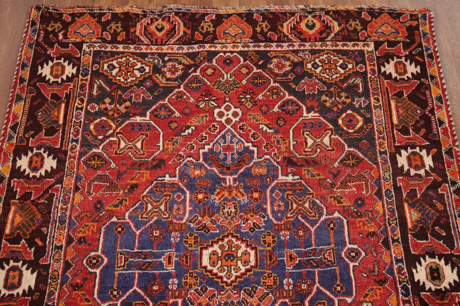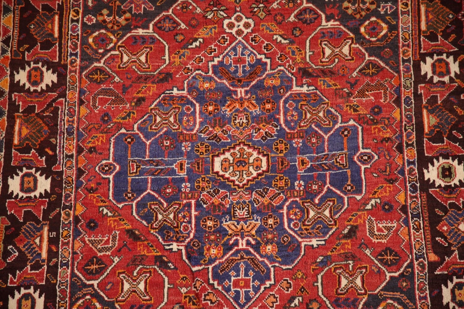 A Beautiful Genuine Persia ( Persia ) Shiraz (Kashkoli) rug is Hand Knotted by skillful weavers in Persia ( Persia ) with 100% Wool Material. This rug is in Very Good condition. dimensions are 4' 11'' X 3' 7'' in foot and 150 X 109 in centimeter. the primary color is Red.