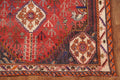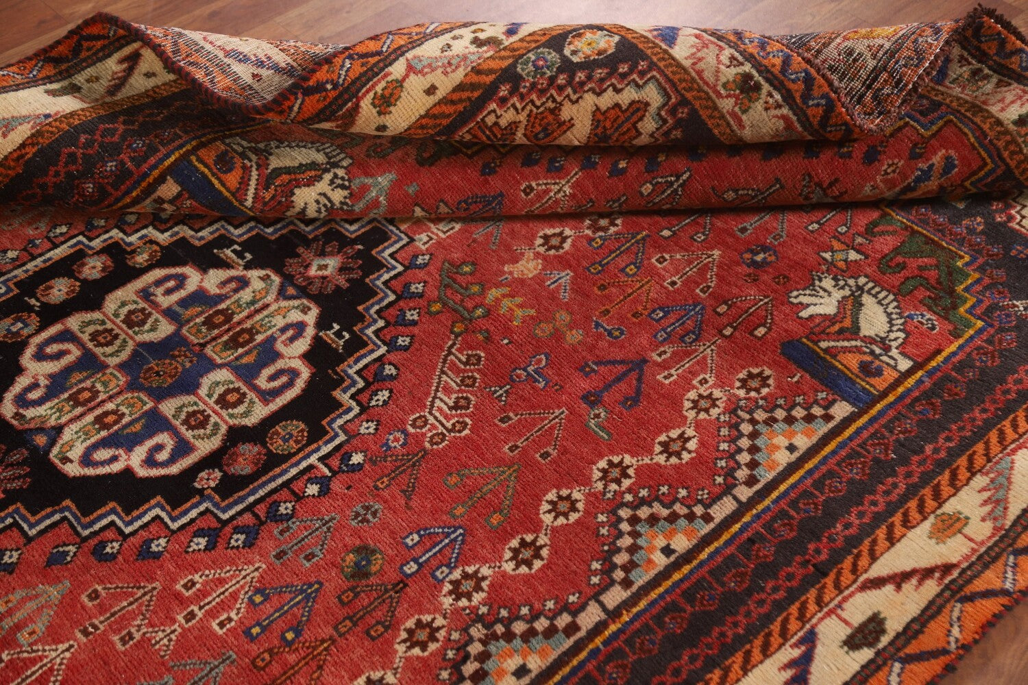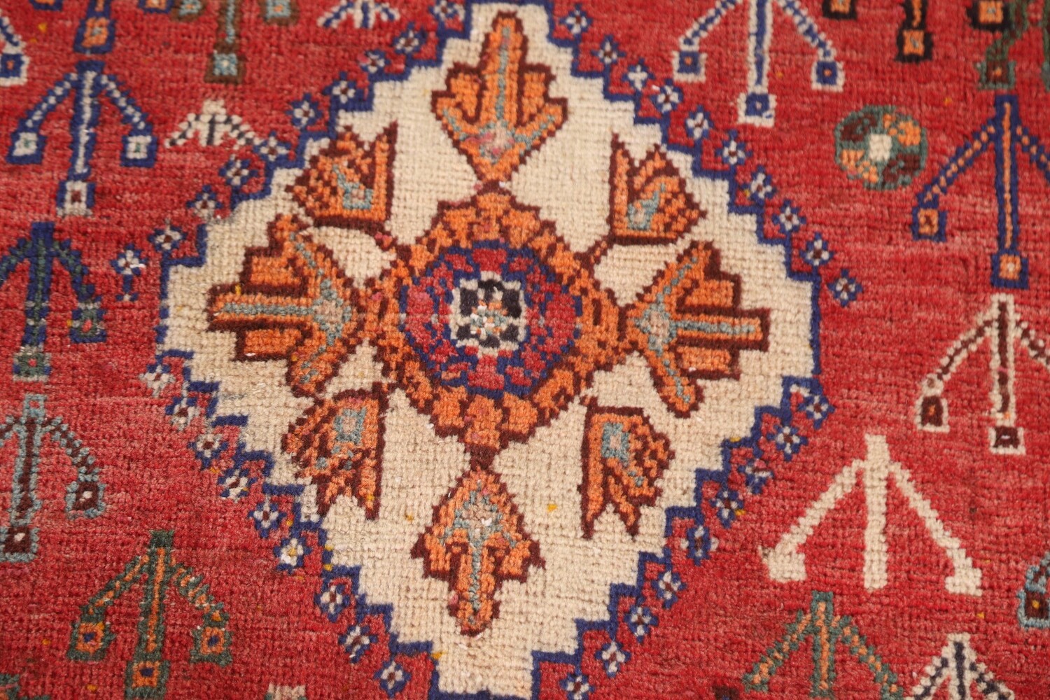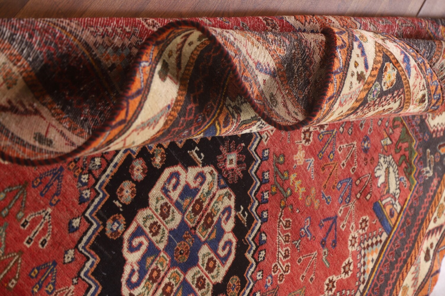 A Beautiful Genuine Persia ( Persia ) Shiraz rug is Hand Knotted by skillful weavers in Persia ( Persia ) with 100% Wool Material. This rug is in Very Good ( Low Pile ) condition. dimensions are 8' 0'' X 5' 2'' in foot and 244 X 157 in centimeter. the primary color is Red.