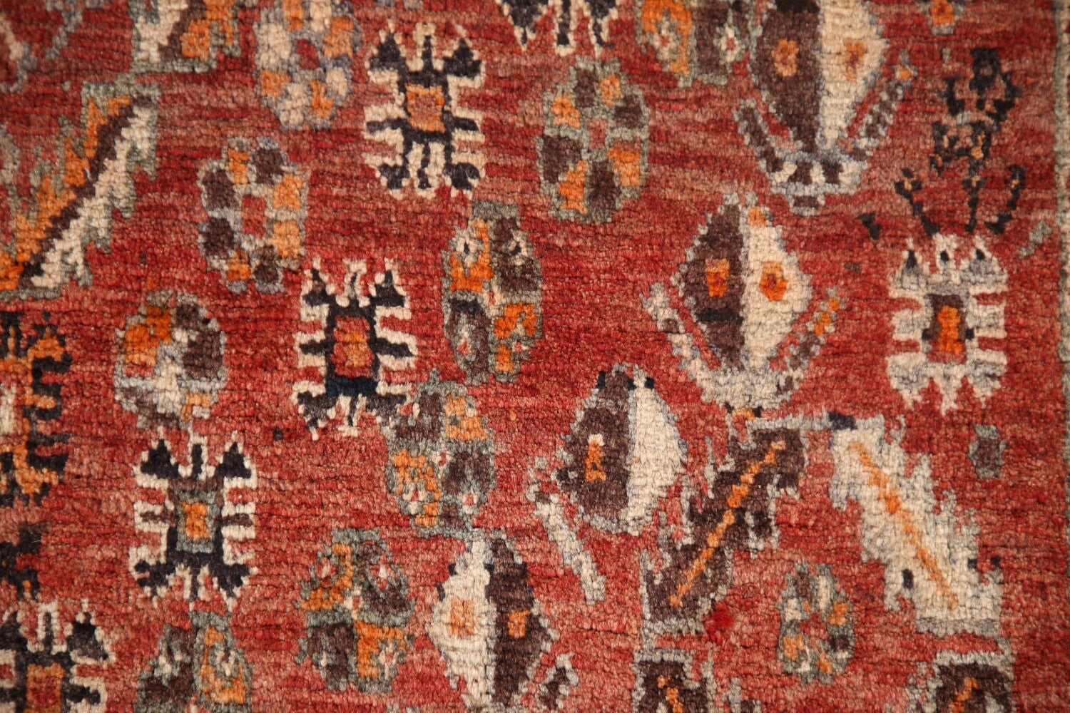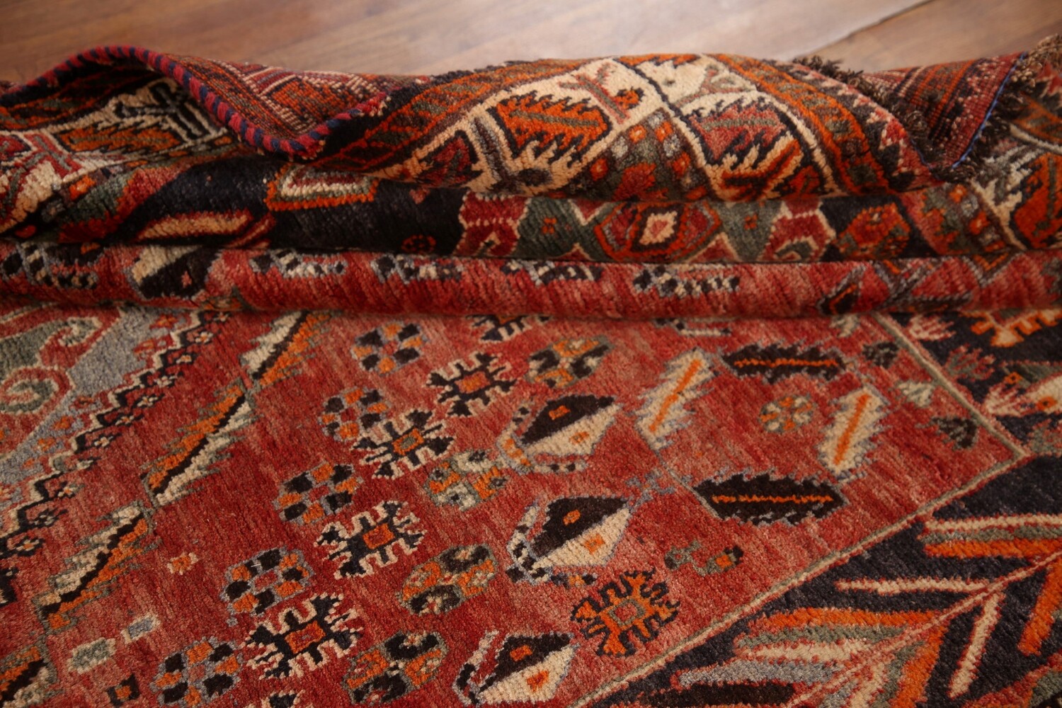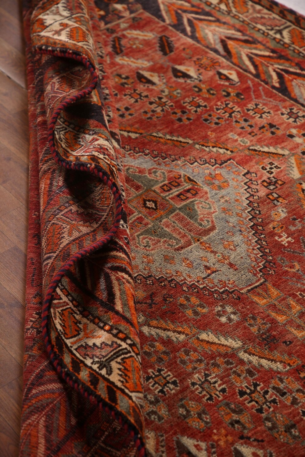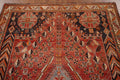 A Beautiful Genuine Persia ( Persia ) Shiraz rug is Hand Knotted by skillful weavers in Persia ( Persia ) with 100% Wool Material. This rug is in Very Good (Abrash) condition. dimensions are 8' 4'' X 5' 1'' in foot and 254 X 155 in centimeter. the primary color is Red.