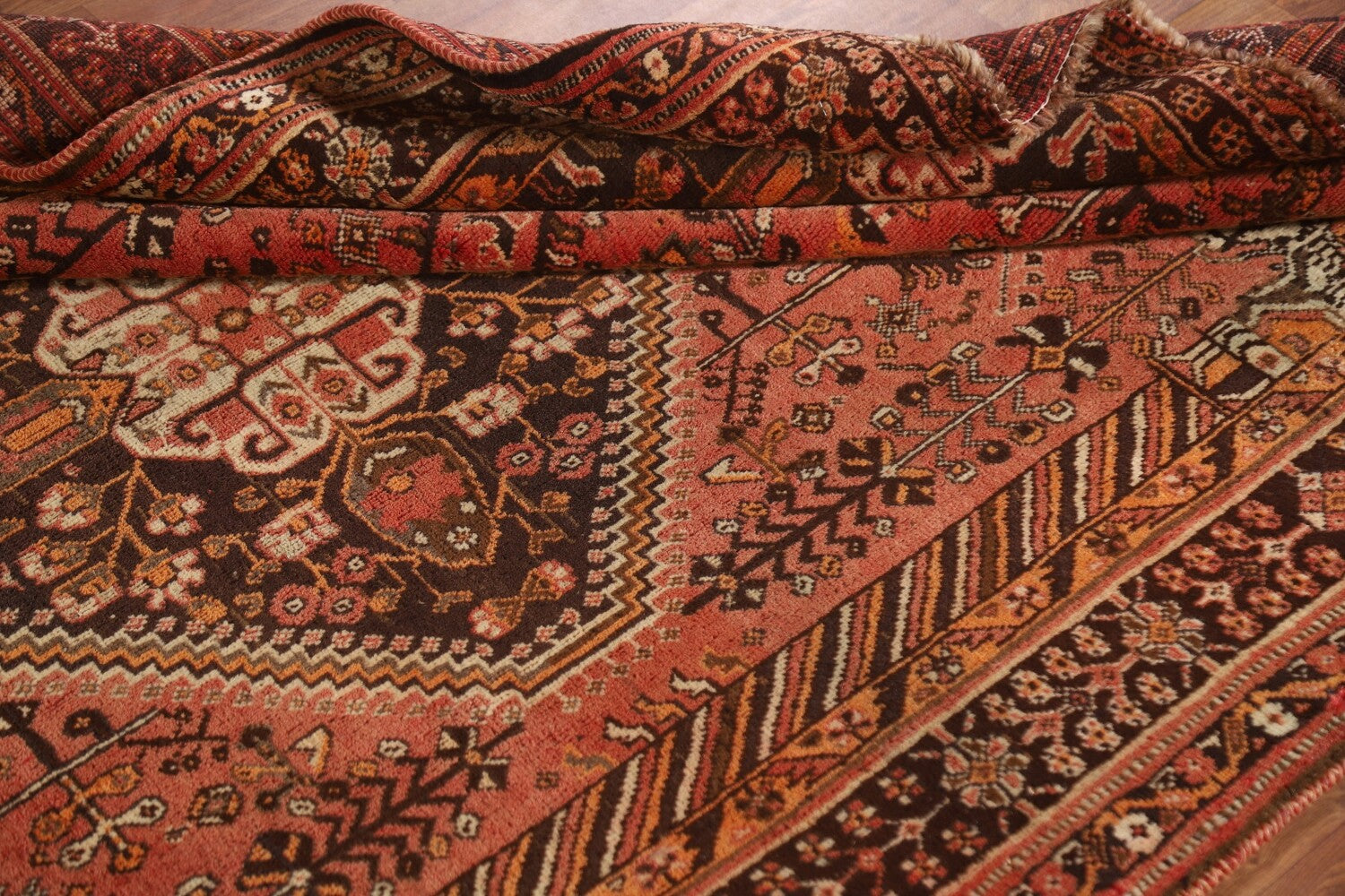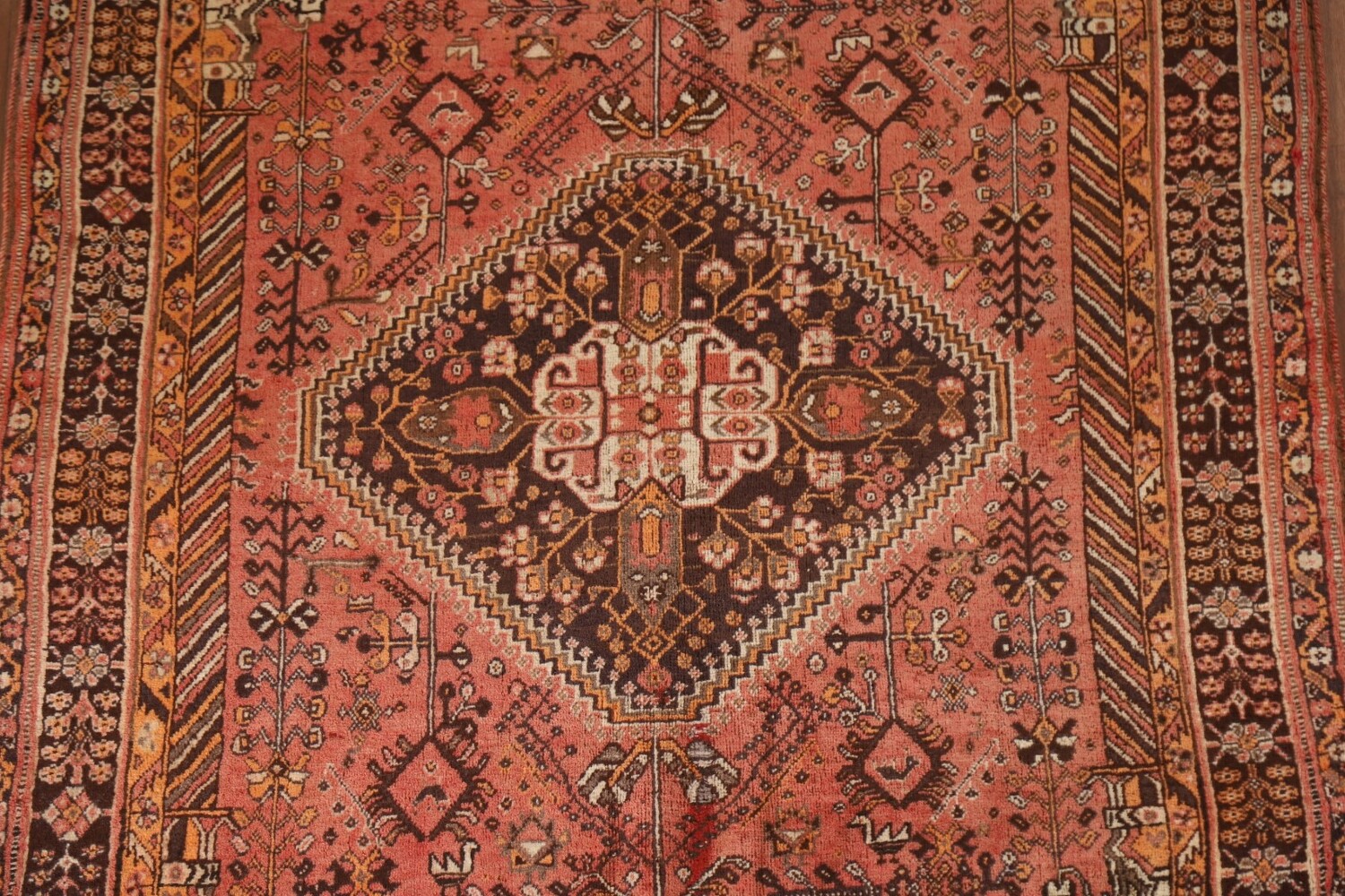 A Beautiful Genuine Persia ( Persia ) Shiraz rug is Hand Knotted by skillful weavers in Persia ( Persia ) with 100% Wool Material. This rug is in Very Good condition. dimensions are 7' 10'' X 5' 1'' in foot and 239 X 155 in centimeter. the primary color is Pink.