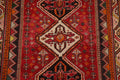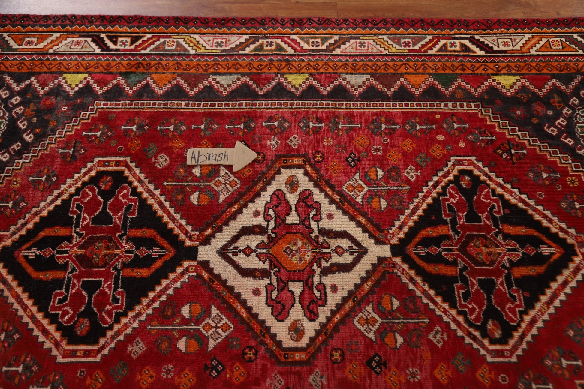 A Beautiful Genuine Persia ( Persia ) Shiraz rug is Hand Knotted by skillful weavers in Persia ( Persia ) with 100% Wool Material. This rug is in Very Good (Evenly Low Pile-Abrash) condition. dimensions are 8' 6'' X 5' 2'' in foot and 259 X 157 in centimeter. the primary color is Red.