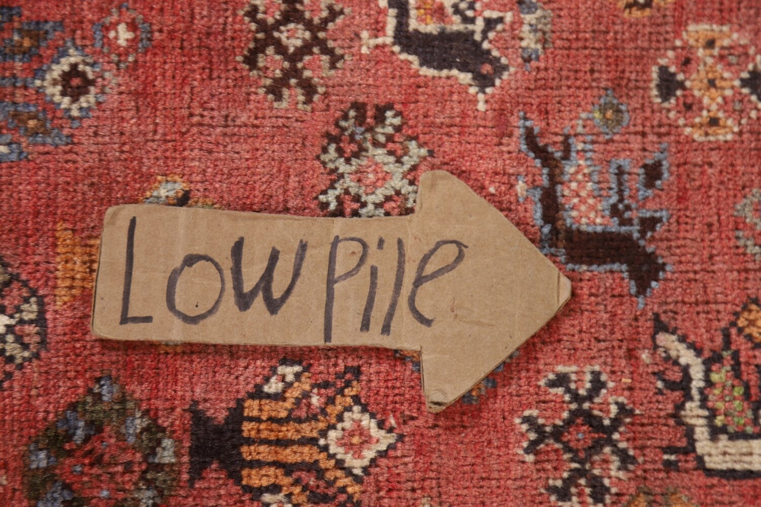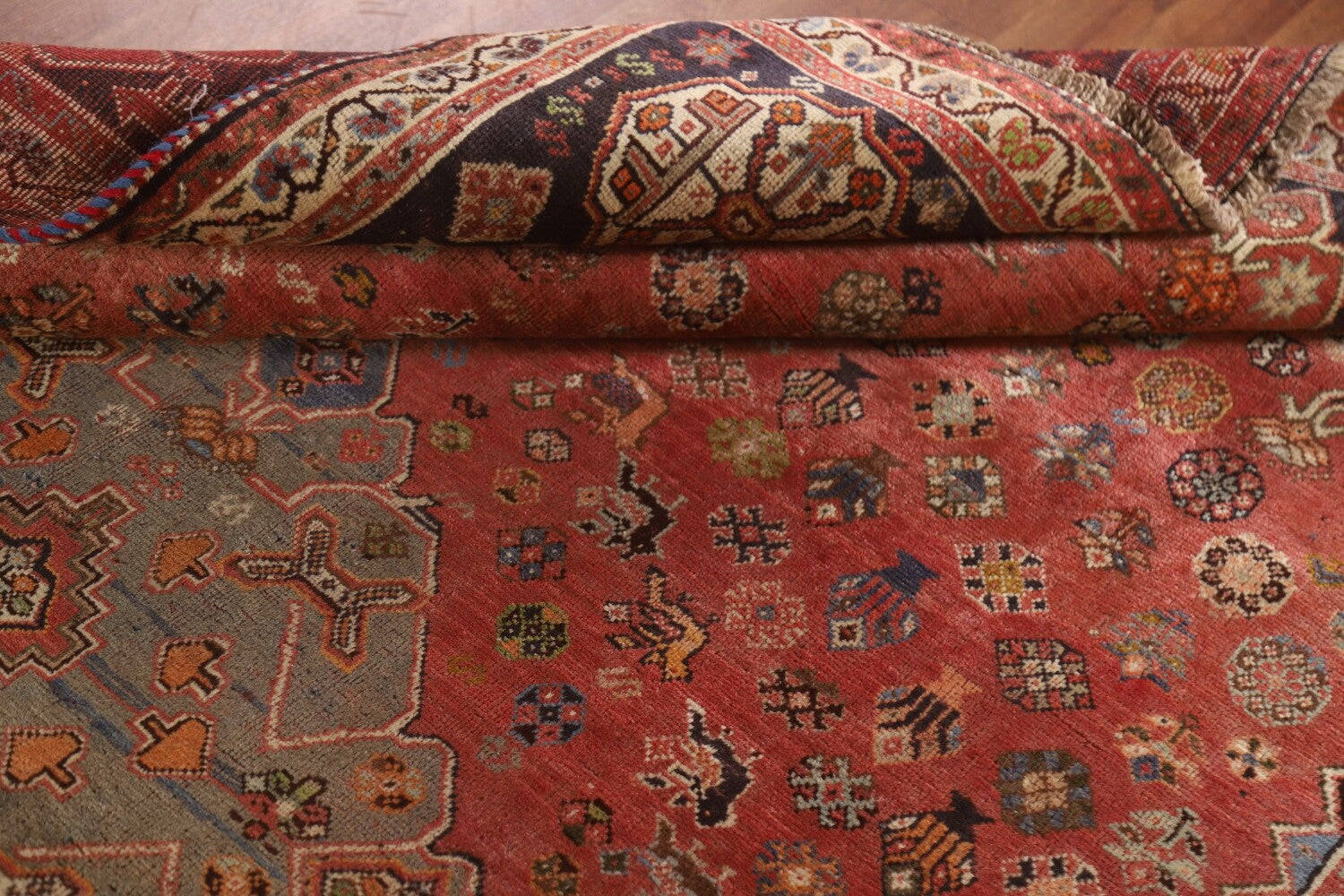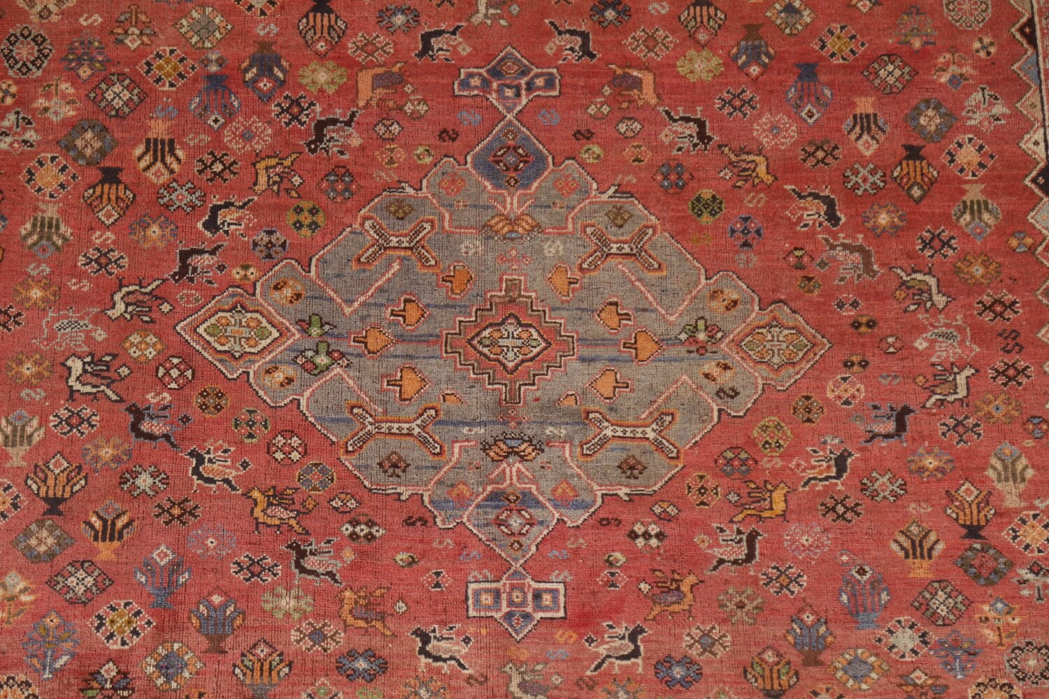 A Beautiful Genuine Persia ( Persia ) Shiraz rug is Hand Knotted by skillful weavers in Persia ( Persia ) with 100% Wool Material. This rug is in Very Good (Low Pile-Abrash) condition. dimensions are 8' 10'' X 5' 8'' in foot and 269 X 173 in centimeter. the primary color is Red.