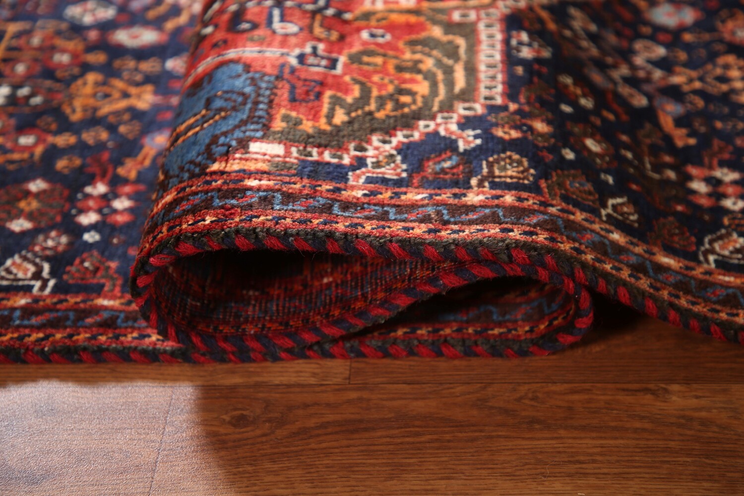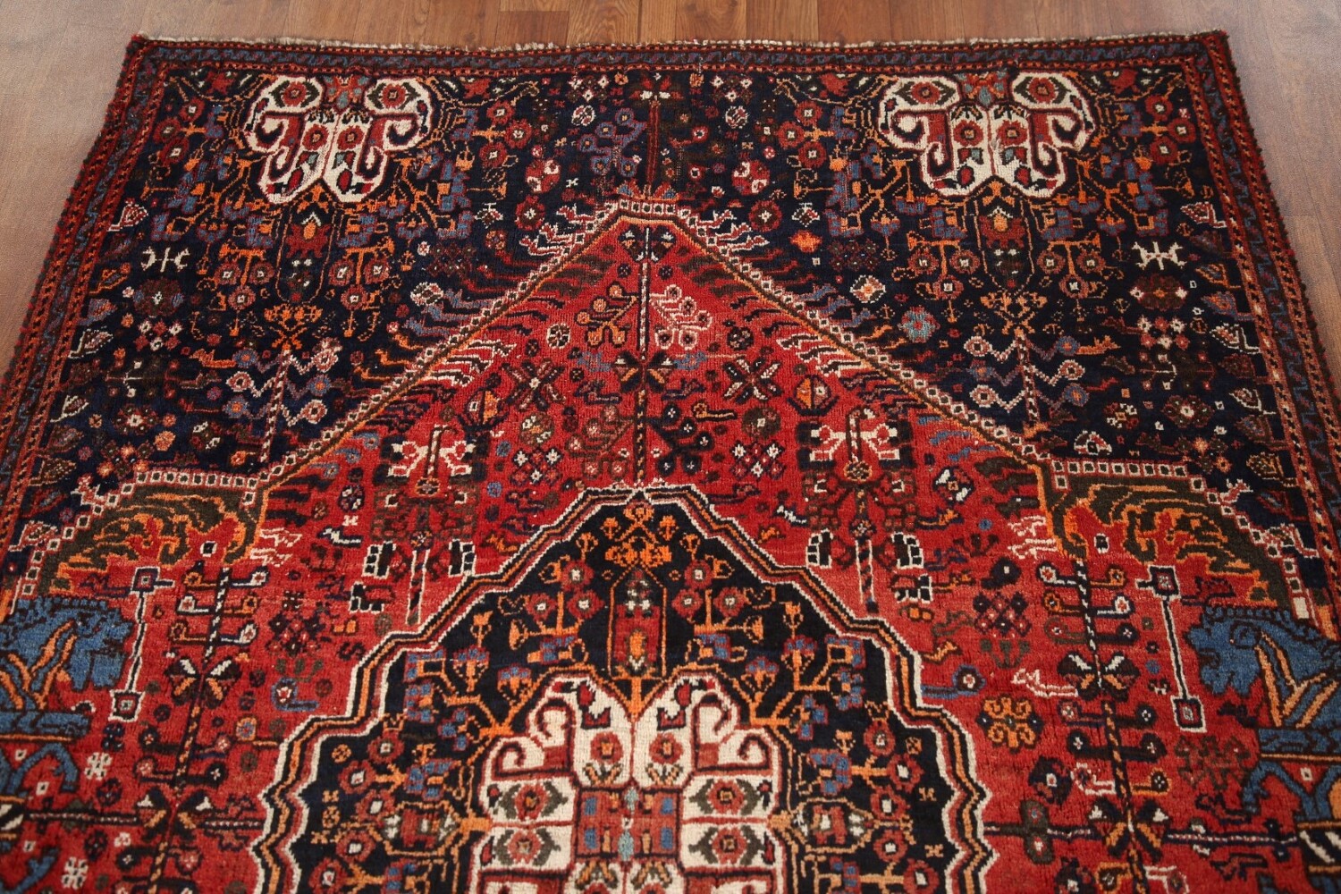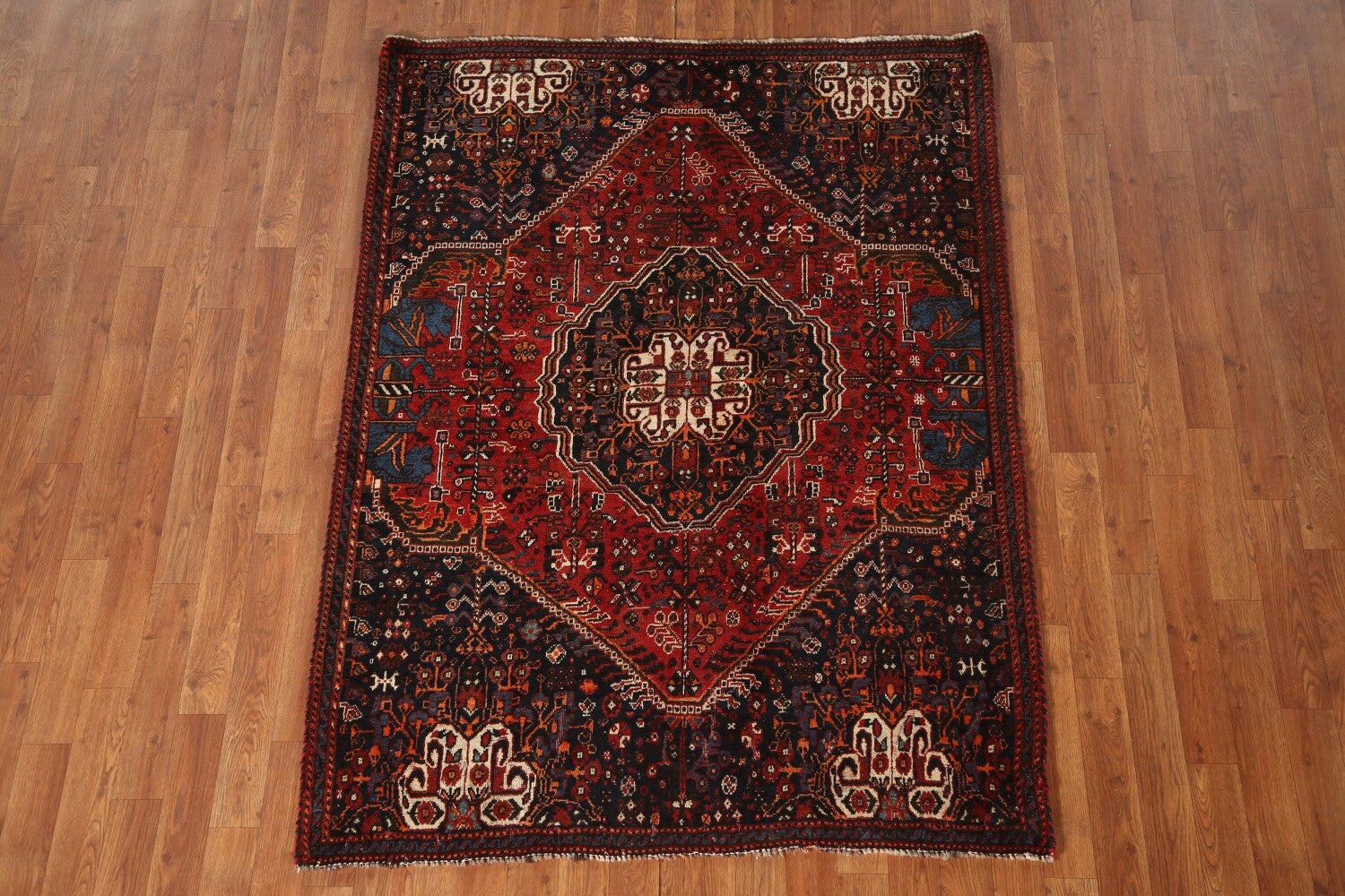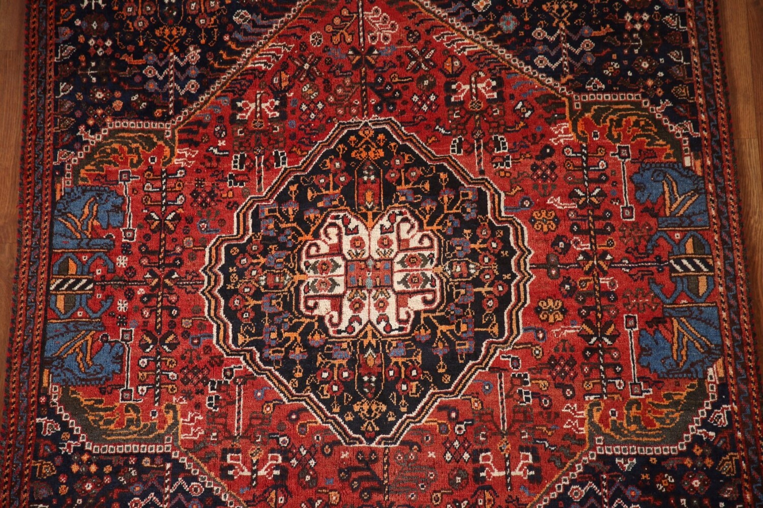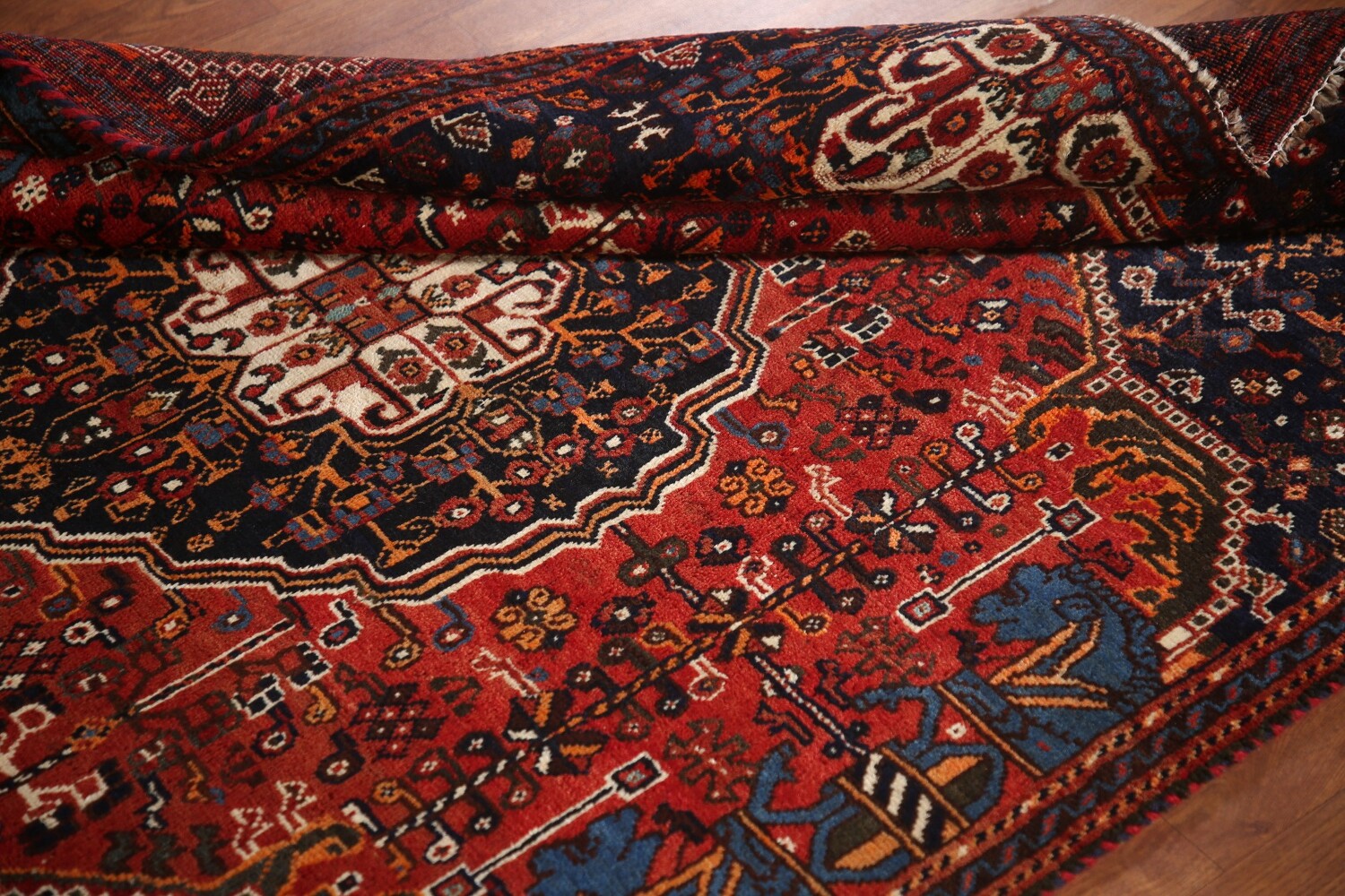 A Beautiful Genuine Persia ( Persia ) Shiraz rug is Hand Knotted by skillful weavers in Persia ( Persia ) with 100% Wool Material. This rug is in Very Good (Low Pile) condition. dimensions are 5' 10'' X 4' 3'' in foot and 178 X 130 in centimeter. the primary color is Red.